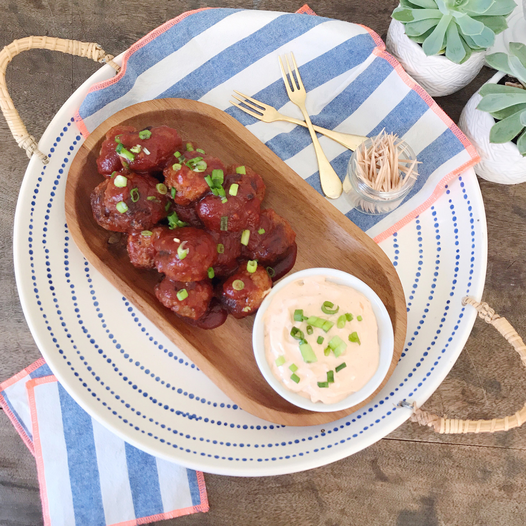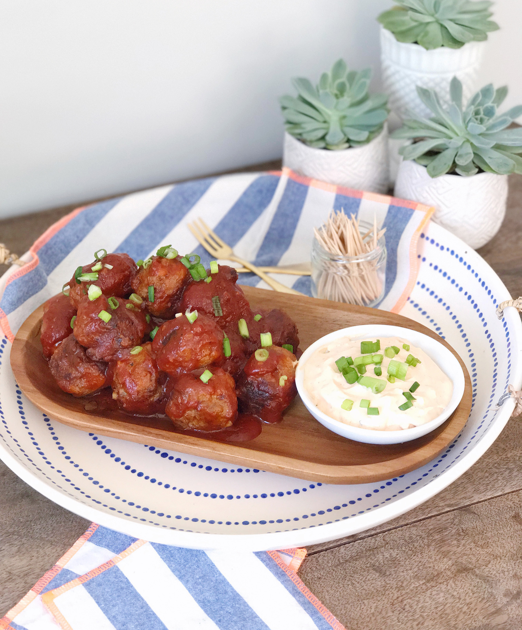 Every year at Christmas our family friends serve these amazing meatballs as an appetizer at their annual holiday party. It’s one of my favorite food traditions, and I was thinking about how delicious they were recently. I got the idea in my head to rethink the flavors in this tasty appetizer and give them a warm-weather spin to serve at summer parties. We’re huge fans of spicy food at my house, and drizzle hot sauce on just about anything we can get our hands on, and adding some heat to a meatball appetizer seemed like just the perfect idea.