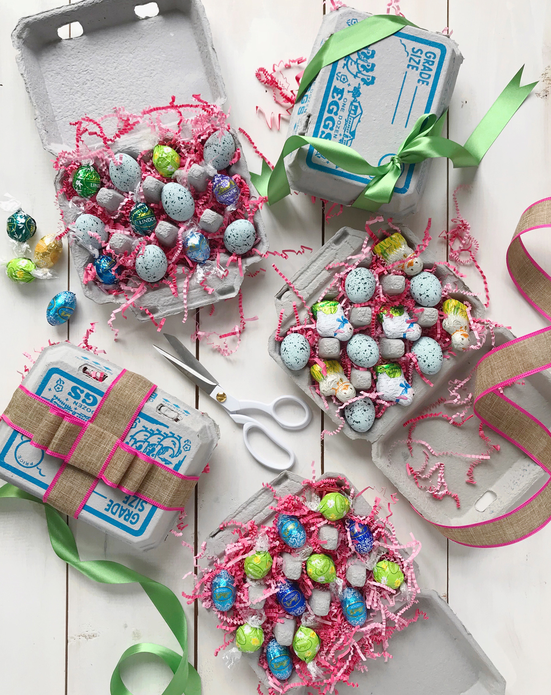 Can you believe Easter is next weekend? It snuck up on me, which means this week I’m making sure Jane has a cute dress to wear, finishing up her Easter basket, and figuring out what I’m going to bring to my in-law’s dinner! One item already marked off my Easter prep list is coming up with a cute (and oh so simple!) hostess gift idea made with egg cartons and some chocolates.