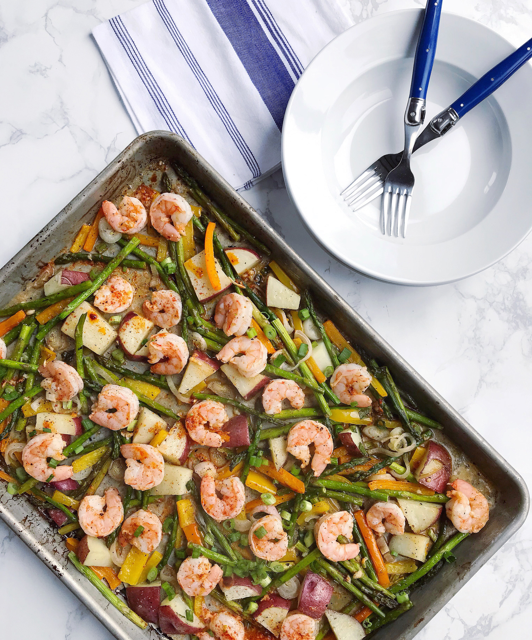 - While the vegetables are roasting, marinate the shrimp in melted butter, lemon juice, minced garlic, paprika, and onion powder. Lightly season with salt and pepper, and add red pepper flakes (optional) to your liking.
