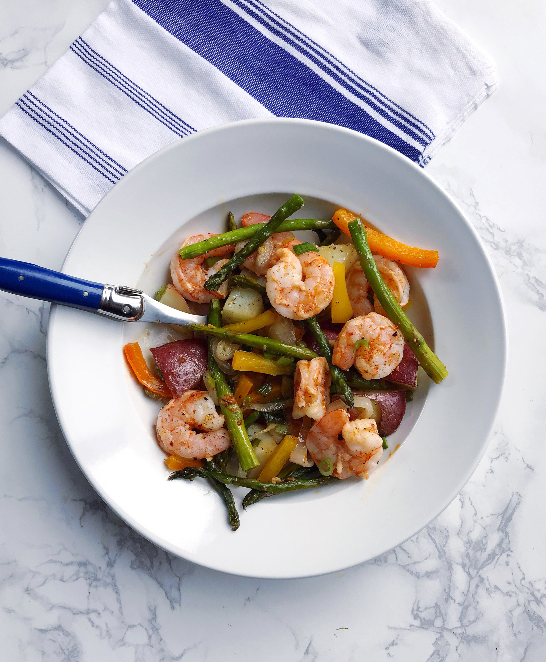 - Prepare vegetables; cube the potatoes into 1” pieces, trim the asparagus and cut into 2-3” lengths, slice peppers into strips, thinly slice shallots, and dice scallions.
