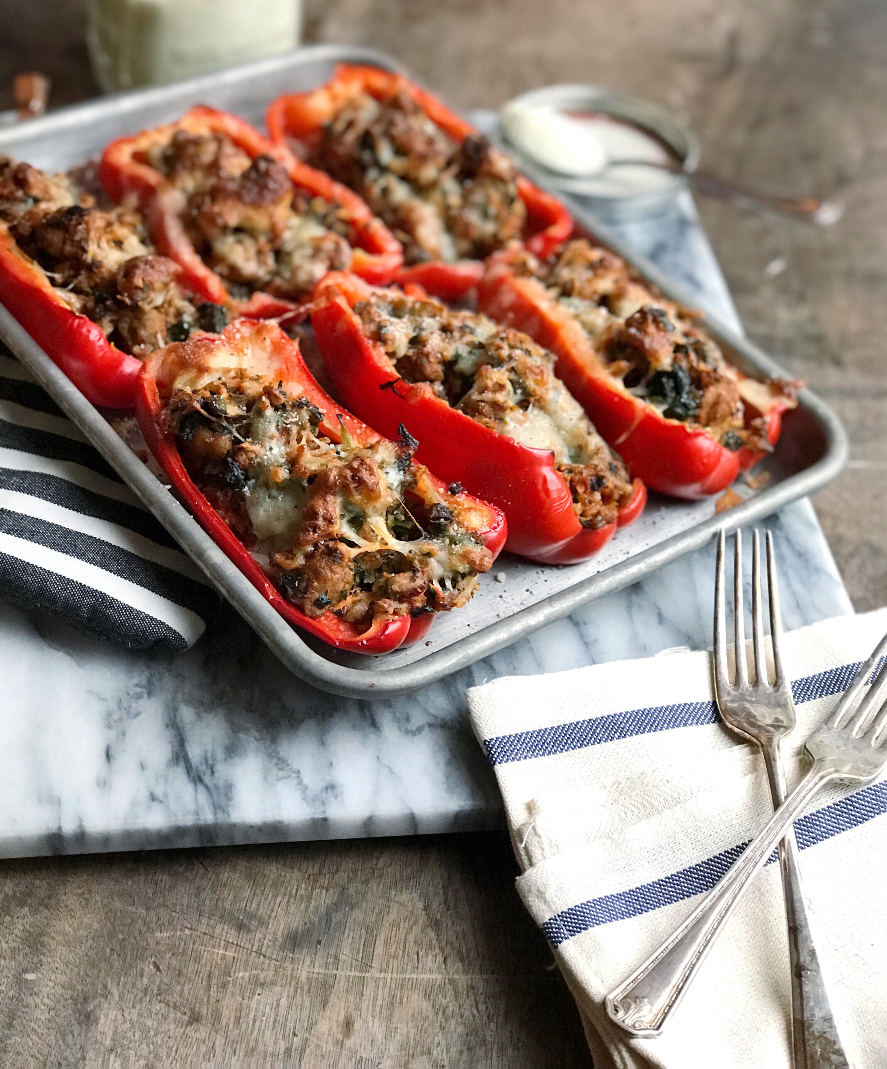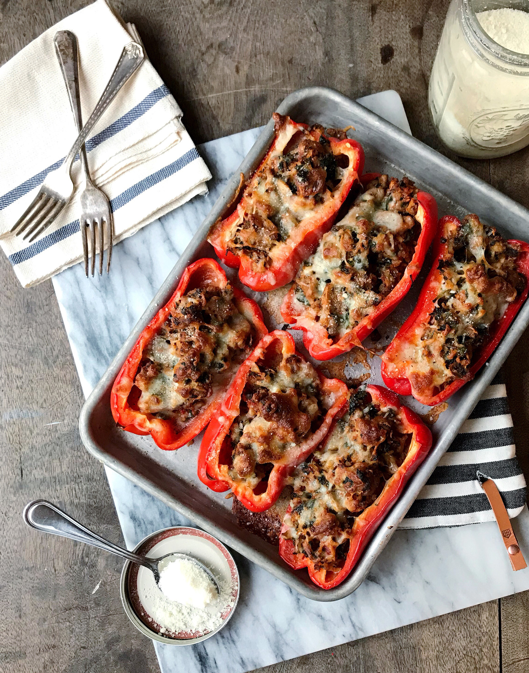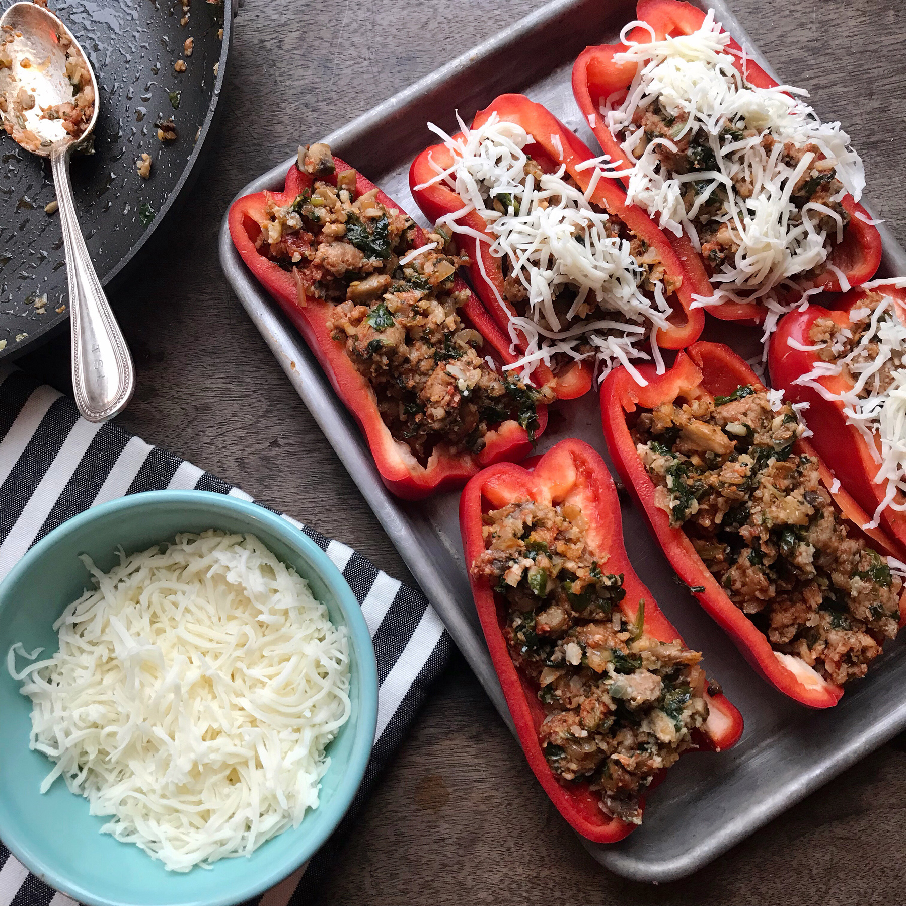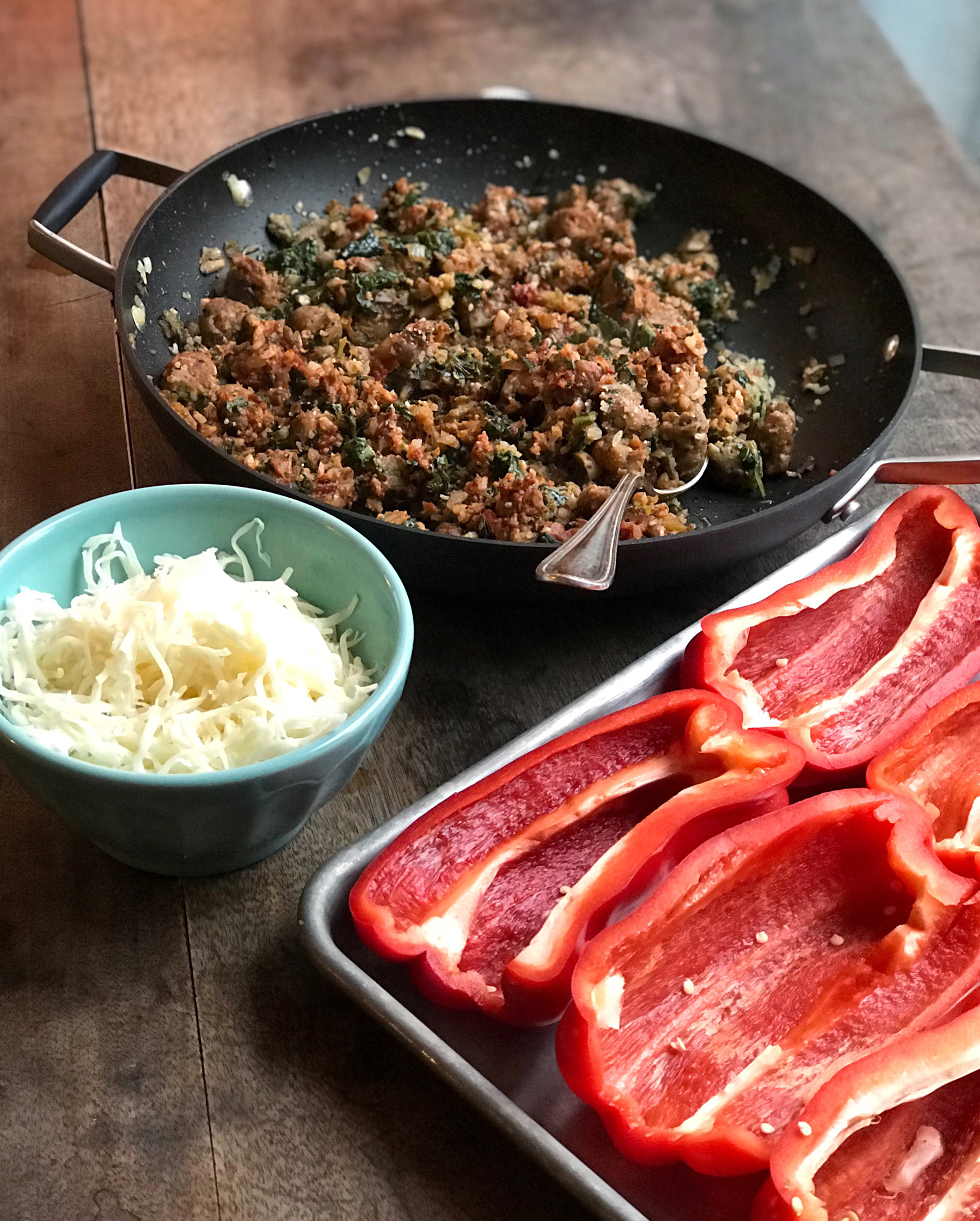 - Take the pan off the heat, and stir in the parmesan cheese before dividing the sausage mixture into each of the 6 red pepper halves.