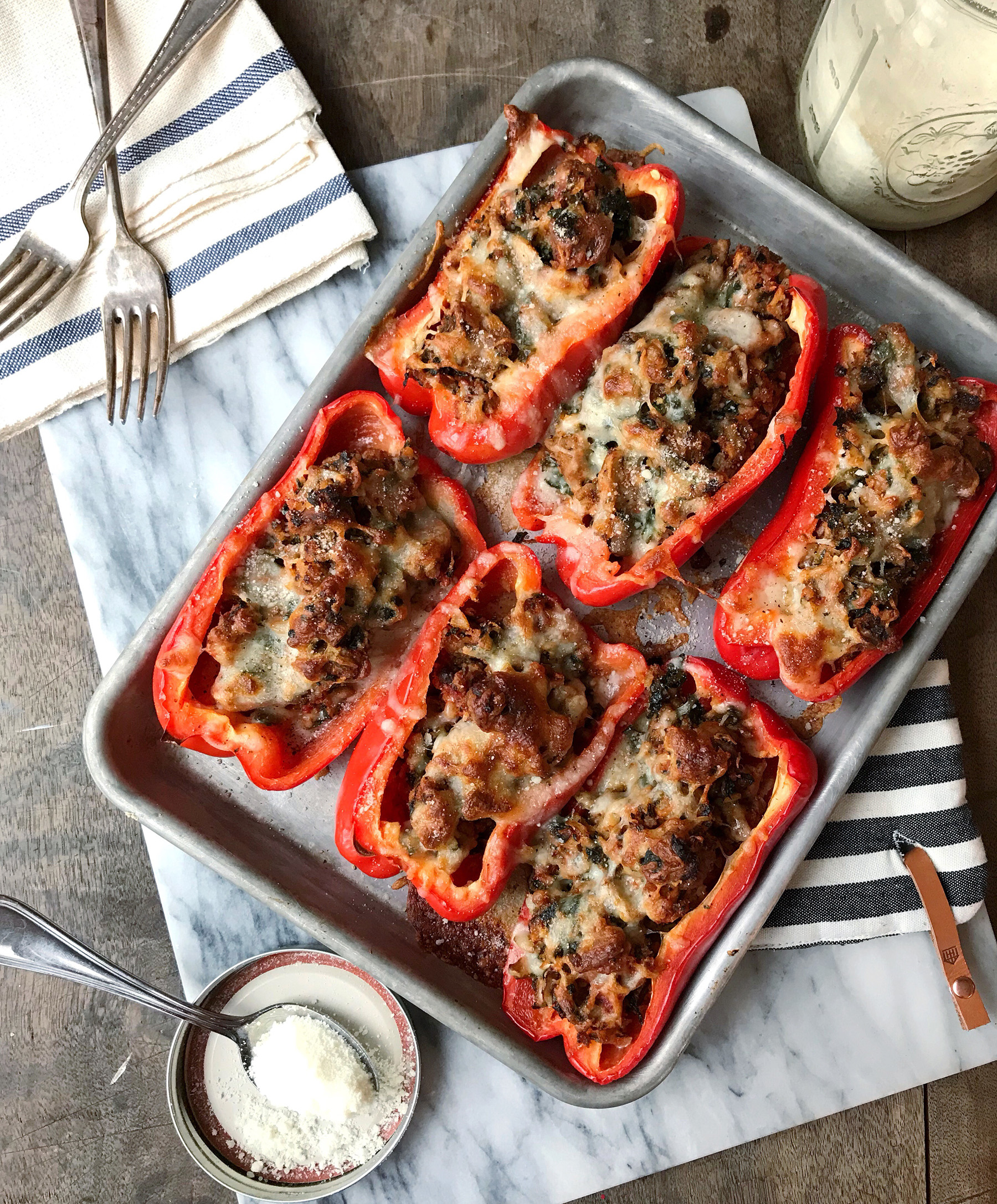 - Cook the peppers for 25-30 minutes, until peppers are tender and the cheese is fully melted. Turn the broiler on for the last minute or two of cooking to give the cheese and pepper edges a crisp. Serve hot with red pepper flakes and additional parmesan cheese.