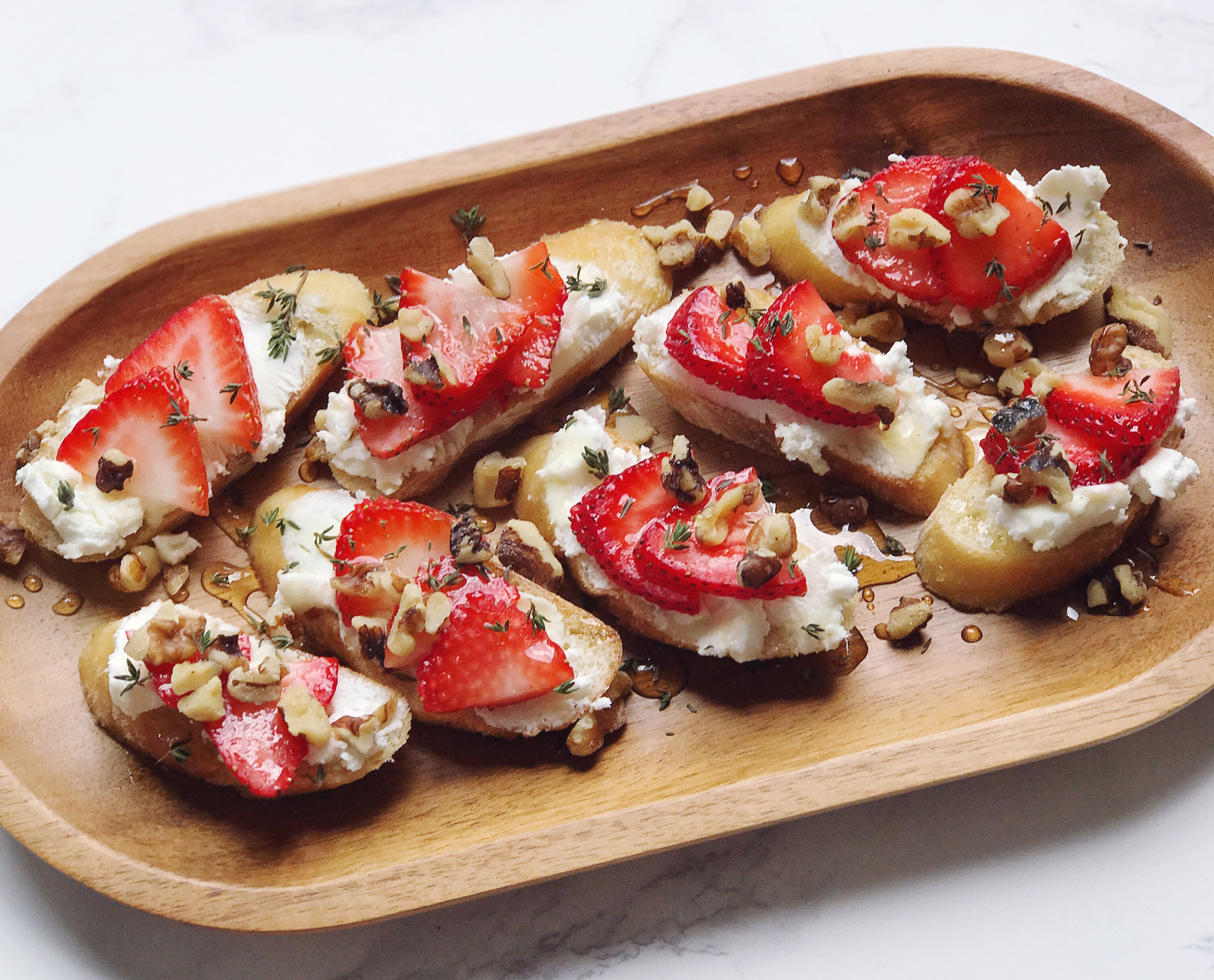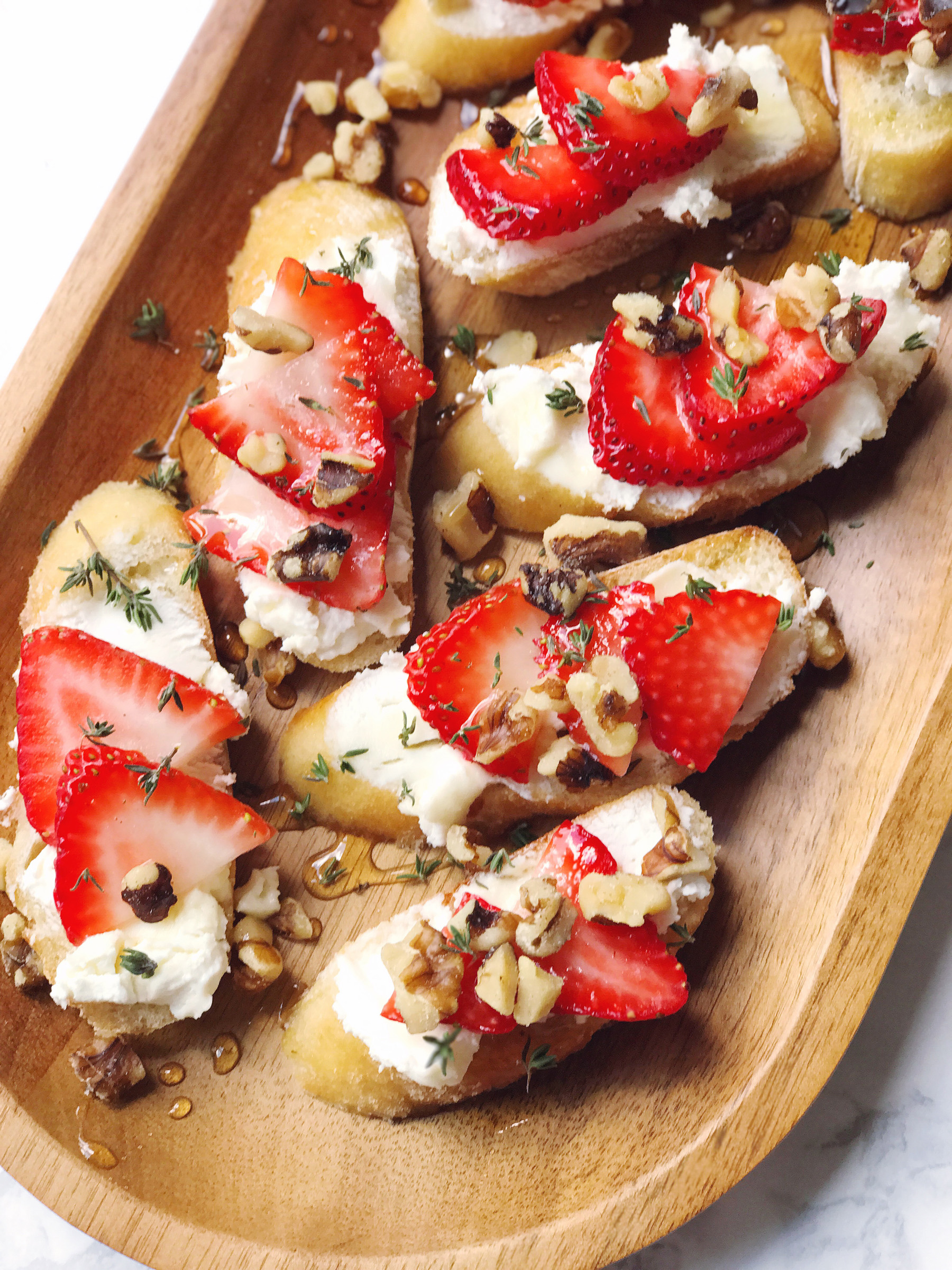 - Spread each toast with goat cheese and top with thinly sliced strawberries, chopped walnuts, leaves of fresh thyme.