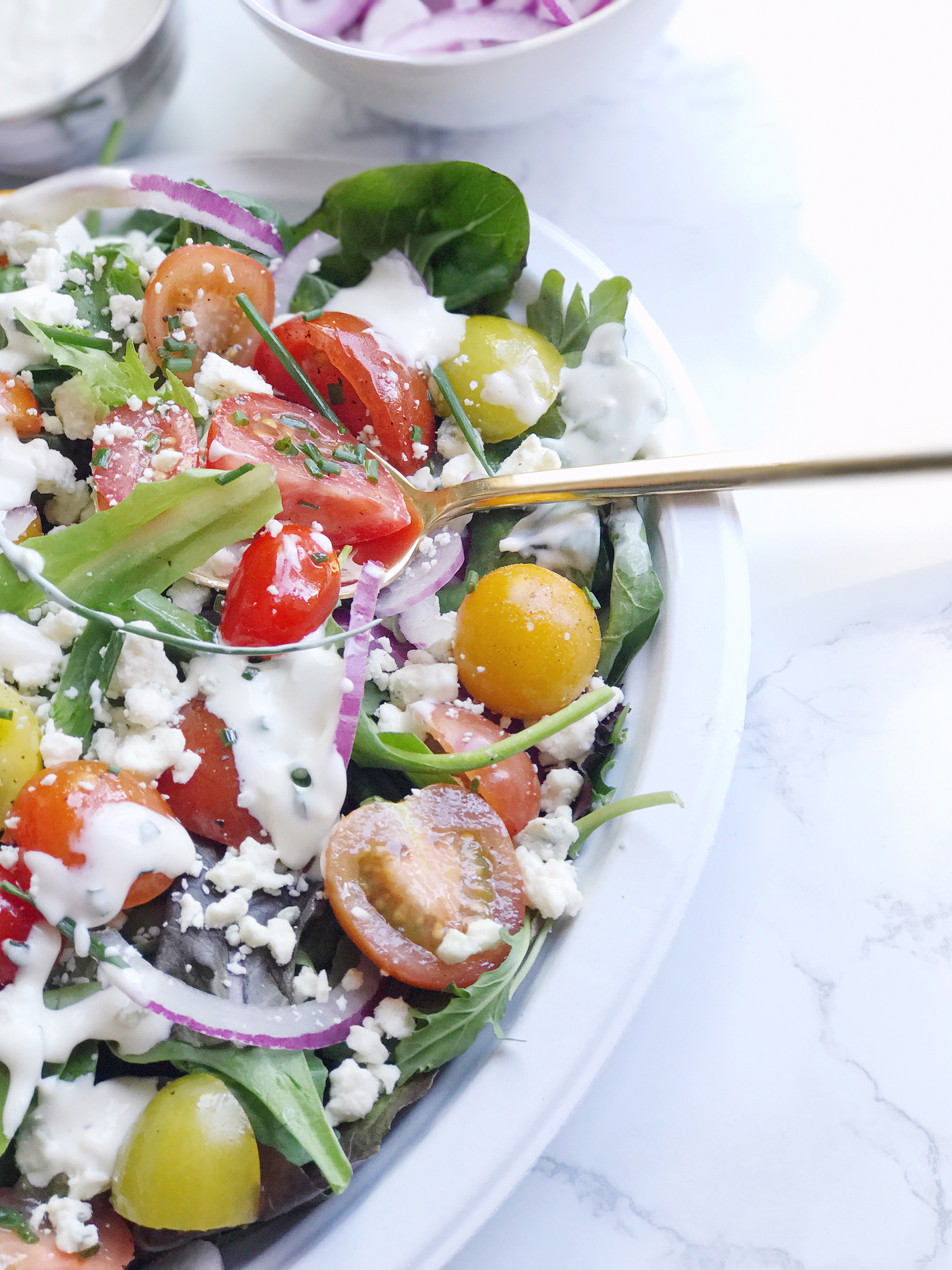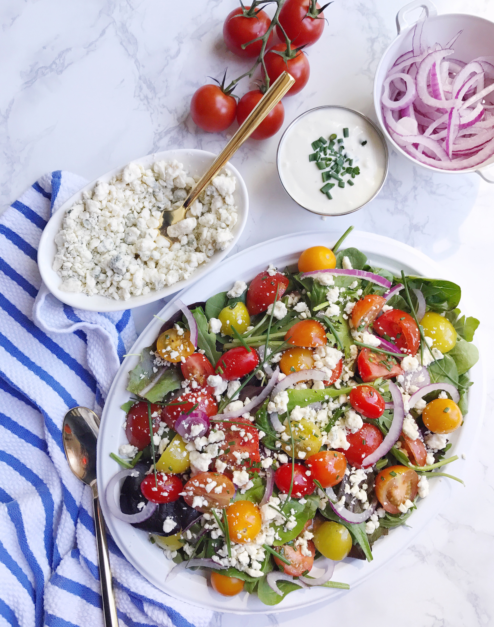 I’m so excited that Memorial Day is coming up soon, because it means that summer activities like beach days and picnics and barbeques aren’t far behind. Those summer cookouts are at the top of my to-do list when the warm weather arrives, because there’s nothing better than a casual backyard gathering with all the tasty BBQ classics.I’m pretty traditional when it comes to a cookout menu and love burgers and hot dogs, pasta salad and potato salad, and maybe if I’m feeling wild I’ll make something fun like baked beans or deviled eggs. Somewhere in that mix, I always feel like I should offer a green option too and fall back on a simple garden salad as my veggie dish of choice. As we gear up for the holiday weekend, I thought it would be the perfect time to revisit my summer cookout salad and give it a bit of a lift. One of the first signs of summer in the grocery store is when the tomatoes start to shine front and center. I thought I’d make use of a variety of sweet ripe tomatoes for this salad, and borrow a few flavors from my favorite wedge salad recipes too. Crisp sliced ribbons of red onion and the rich crumbled blue cheese make a delicious combination. I mixed up these simple ingredients with fresh chives, salt and pepper, and arranged them on a bed of greens: arugula, spinach, and mixed baby lettuces.I assembled the whole dish on one of my cookout secret weapons: Chinet® Classic White™ platters. In my opinion, barbeques should be kept simple, casual, and easy. I lean on paper plates and napkins for these occasions, and these platters make for an even easier time cleaning things up so I can get back to the party. We’re big on recycling and are even starting to compost this summer, and these Classic White products are biodegradable when composted, how cool is that? Get the full recipe for this simple tomato and blue cheese summer salad below, and let me know in the comments what’s on your Memorial Day weekend BBQ menus!