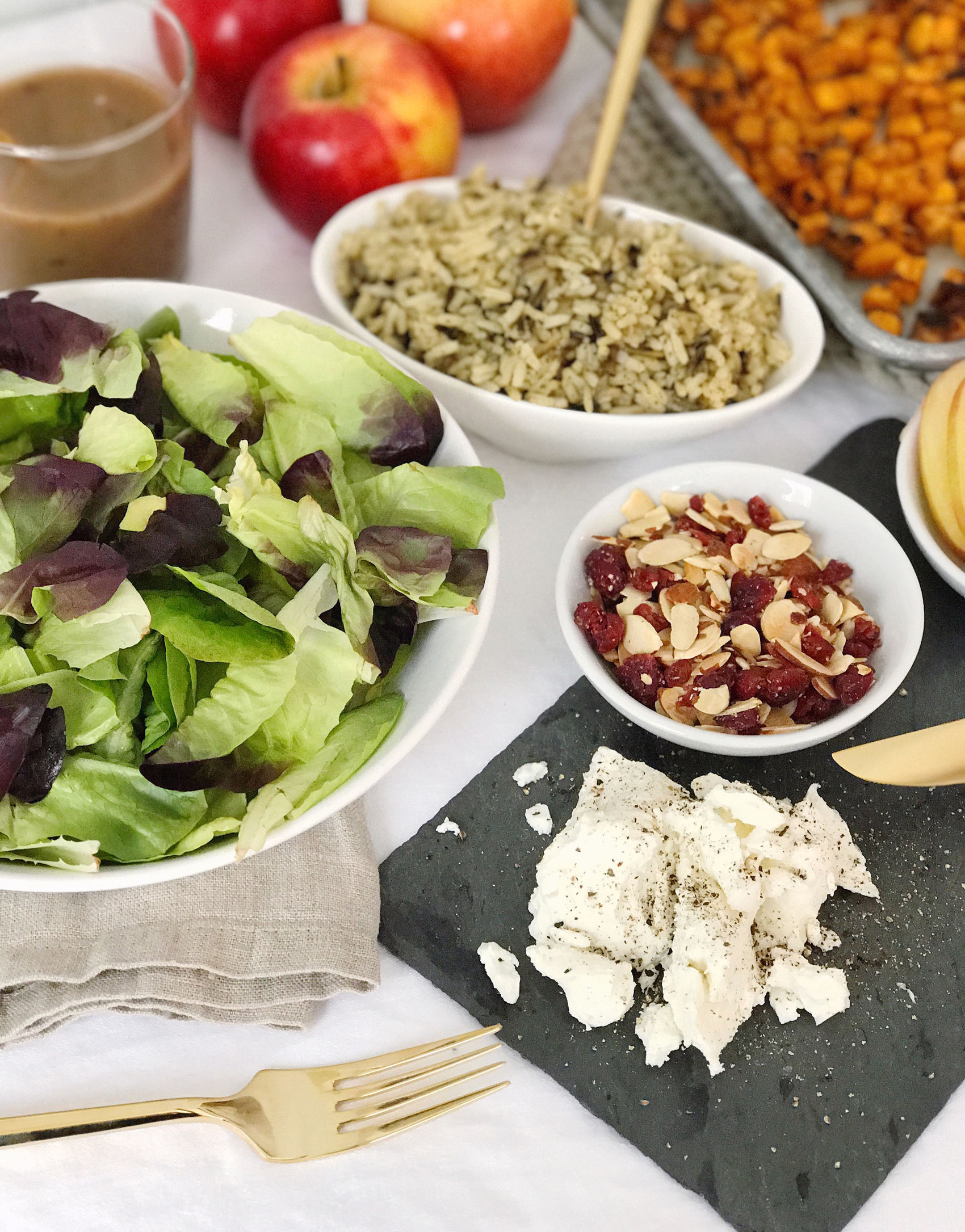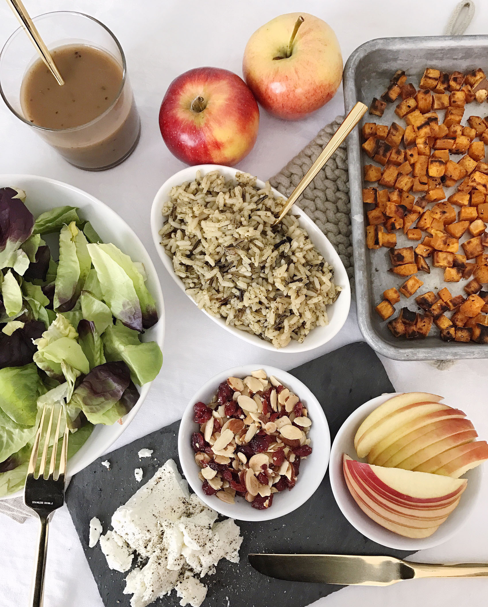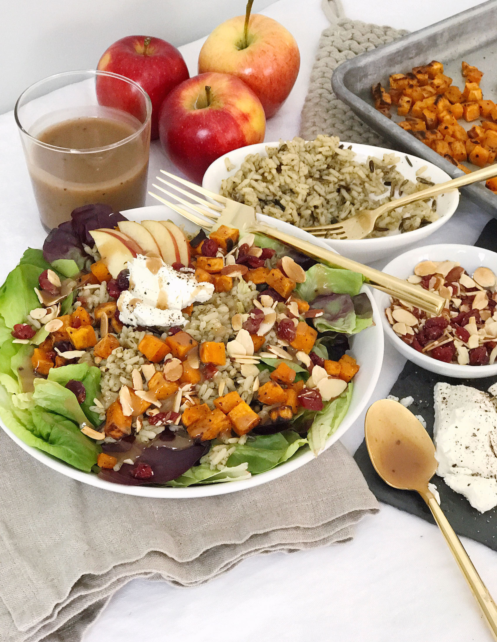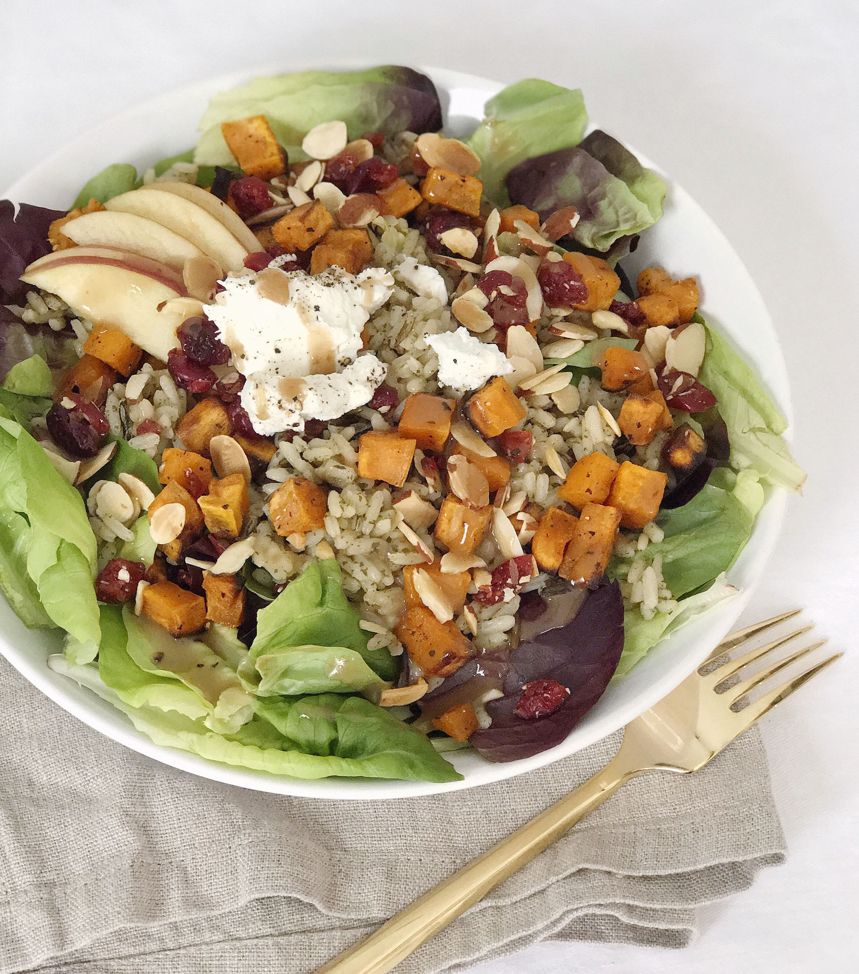 - Top each bowl with a quarter of the wild rice, roasted sweet potatoes, sliced apples, chopped almonds, dried cranberries, and goat cheese.