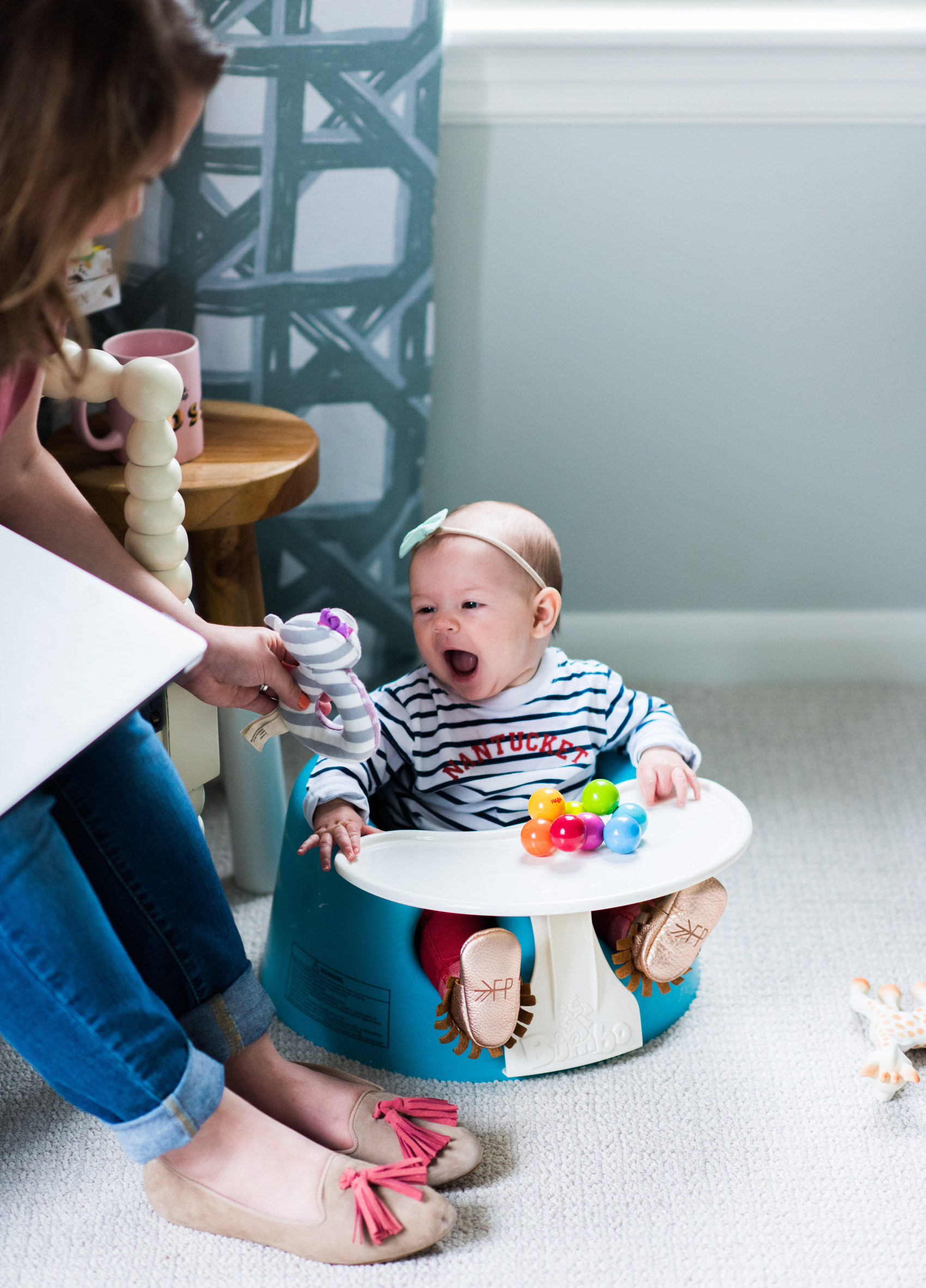 Adjusting my working hours, staying organized, and getting some outside babysitting help have all been hugely helpful steps in finding a manageable working-mom routine. I’ve also been leaning on a handful of helpful products to keep Jane contained and busy while I’m working. Perhaps our most-used baby item is our Baby Bjorn Bouncer. The way this bouncing chair is designed made it easy for us to pop Jane in there even before she had tons of head control – which was a lifesaver. She hangs out in this while I’m in the shower, cooking, eating, or working on photographing projects. I also love that it folds up, and comes with a cute toy bar that she’s starting to enjoy now. Another great place to pop Jane down in — now that she has a bit more head control — is the Bumbo seat. Friends of ours let us borrow this one and she loves sitting in it with the tray snapped on so she can slide her toys across it. She’s just starting to really get “playing” and has a small handful of favorite toys, including Sophie the Giraffe (of course!), this pretty wooden rainbow grasping toy, a few of the Organic Farm Buddies Rattles and a stroller toy bunny that makes a crinkly noise – she loves anything that crinkles.