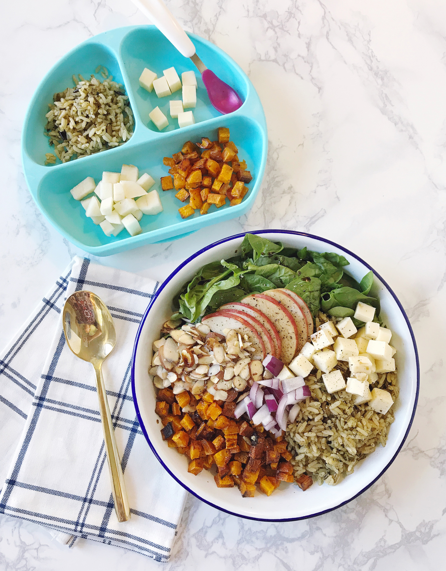 Dinnertime can be a challenge on a good day, but add an infant or a toddler to the mix and it can be down right exhausting. Our daughter is 8 months old and diving head first into the world of solid foods right now. More than anything, she always wants to be eating what my husband and I are eating, which is great, as long as we’re eating something that’s appropriate for a toothless baby.Our tiny (and hungry) little addition to the dinner table has challenged me to rethink my standby weeknight menus and experiment with new recipes that quick and easy, healthy, and can be adapted or broken down into elements that our daughter can eat too. In the spirit of us mamas sticking together, I’m sharing three of my favorite new recipes that are toddler and mama approved for easy weeknight dinners! Each recipe has 10 ingredients, just 3 steps and takes less than 45 minutes to prepare.#1 Hidden Veggie “Bolognese.” This vegetarian style “Bolognese” sauce is packed with five cups of hidden vegetables. Serve with a textured pasta like rotini so the vegetable pieces can cling inside the curves; for the adult portion you can mix in turkey sausage, red pepper flakes, and fresh basil leaves.#2Greek Stuffed Baked Potatoes. I recently went on a trip to Detroit, and at their baseball stadium enjoyed a tasty ballpark snack that inspired this dish: Gyro “Poutine” – all of the elements of a delicious Greek gyro served over crispy French fries. It sparked the idea to take some of my favorite Greek food ingredients and load them on top of a hearty baked potato. For the toddler-friendly version, break down many of the ingredients like potatoes, tomatoes, cucumbers, chicken and hummus into small bite sized pieces. I find that giving our little gal a variety of flavors on her plate keeps her occupied longer at the dinner table!#3 Harvest Wild Rice Bowl. Grabbing a big hearty salad from one of those fancy salad bars is a great way to eat healthy on the go, but they can be so expensive! I’ve tried to recreate some of my salads and bowls at home to save money. Prepping these in larger batches usually means we can eat them for dinner and have tasty leftovers to pack for lunches the next day! This version is packed with autumnal flavors like butternut squash, cheddar cheese, and apples – all ingredients that can be chopped into bite-sized pieces for kids too.