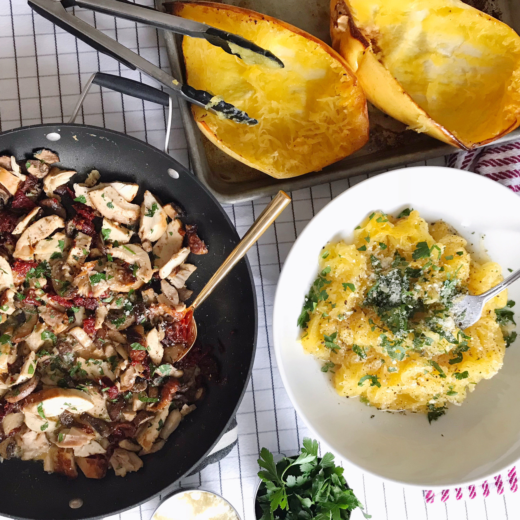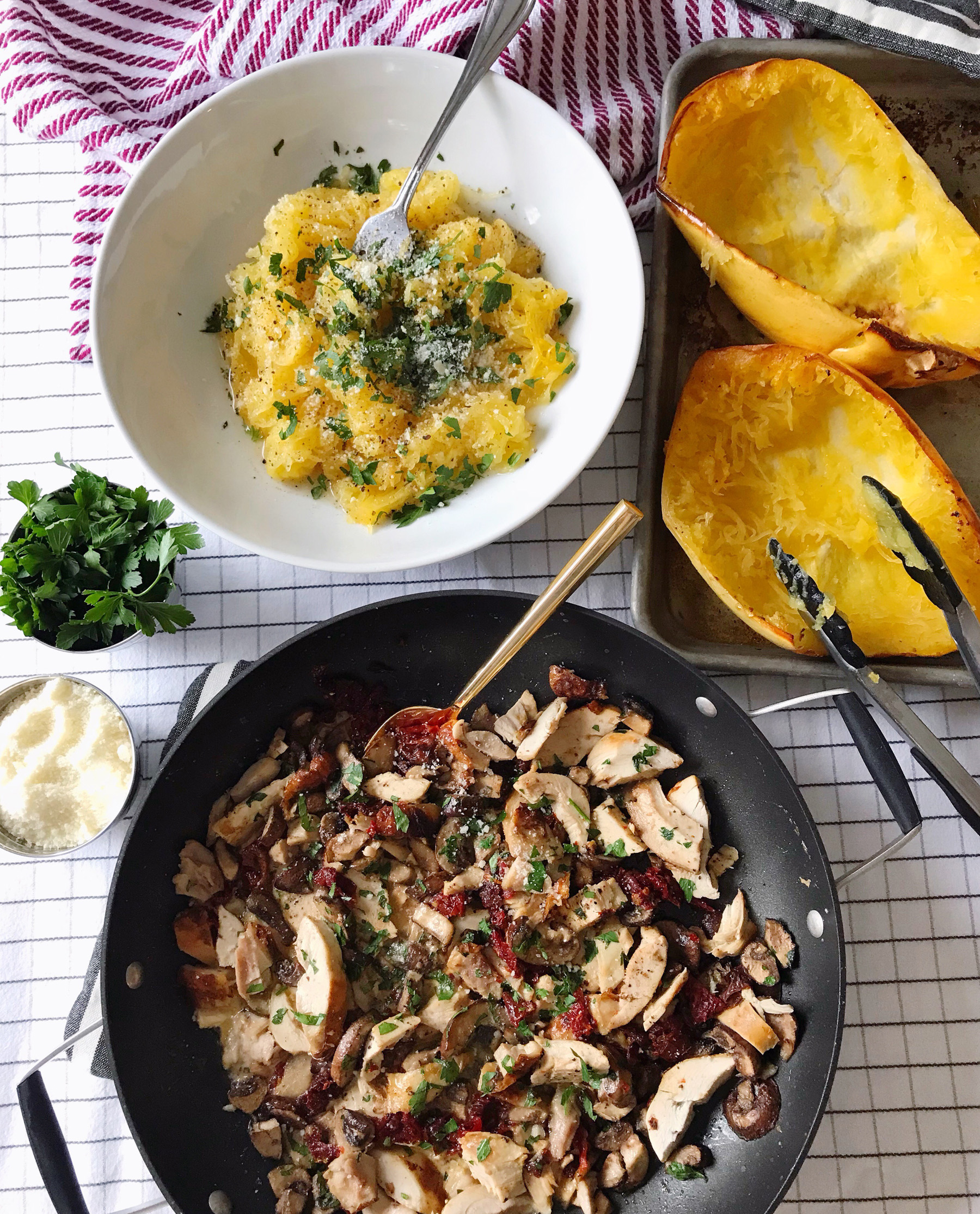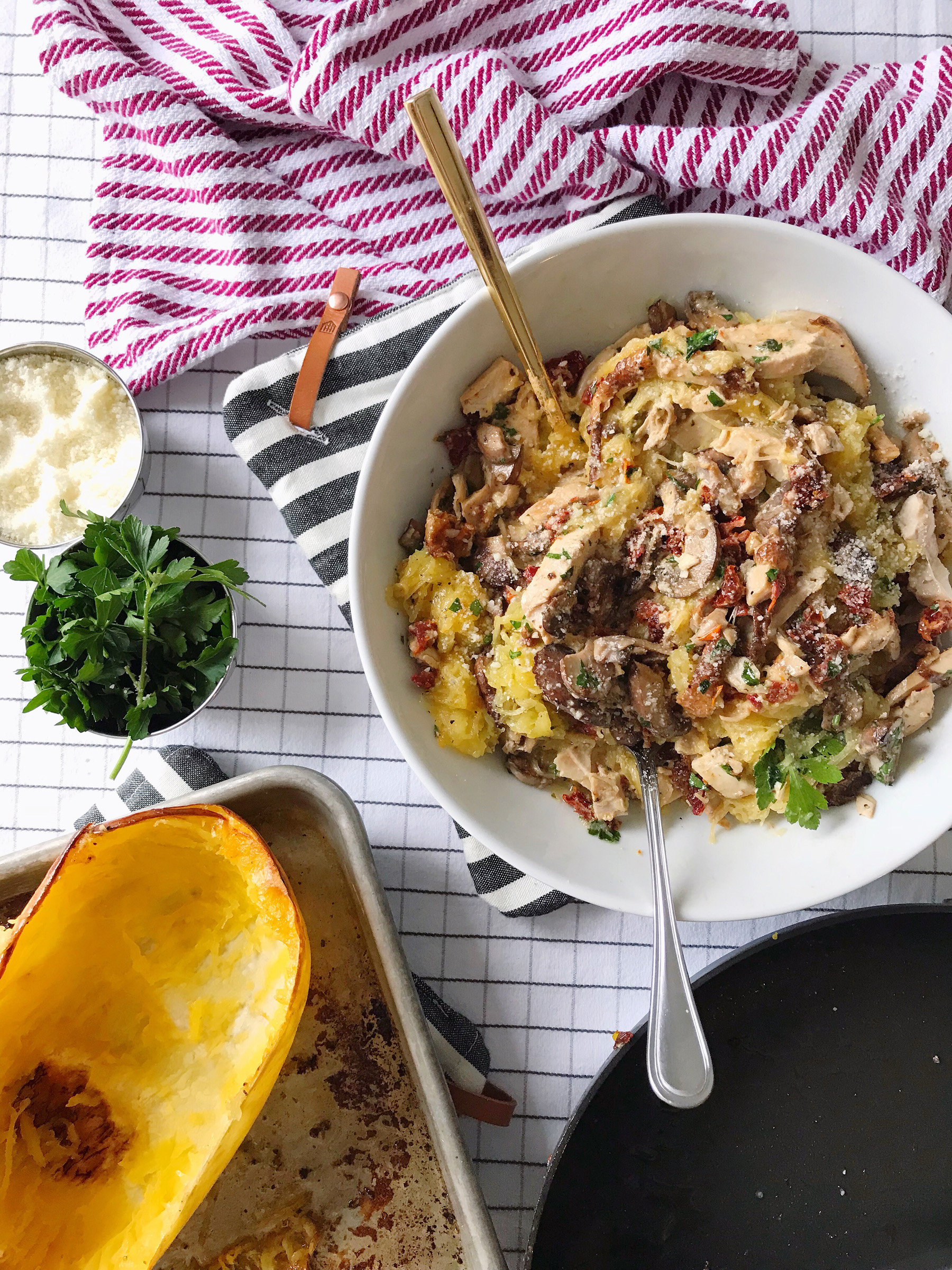 - Pour the mushroom and chicken mixture over the squash and serve with additional parsley, pepper and parmesan cheese.