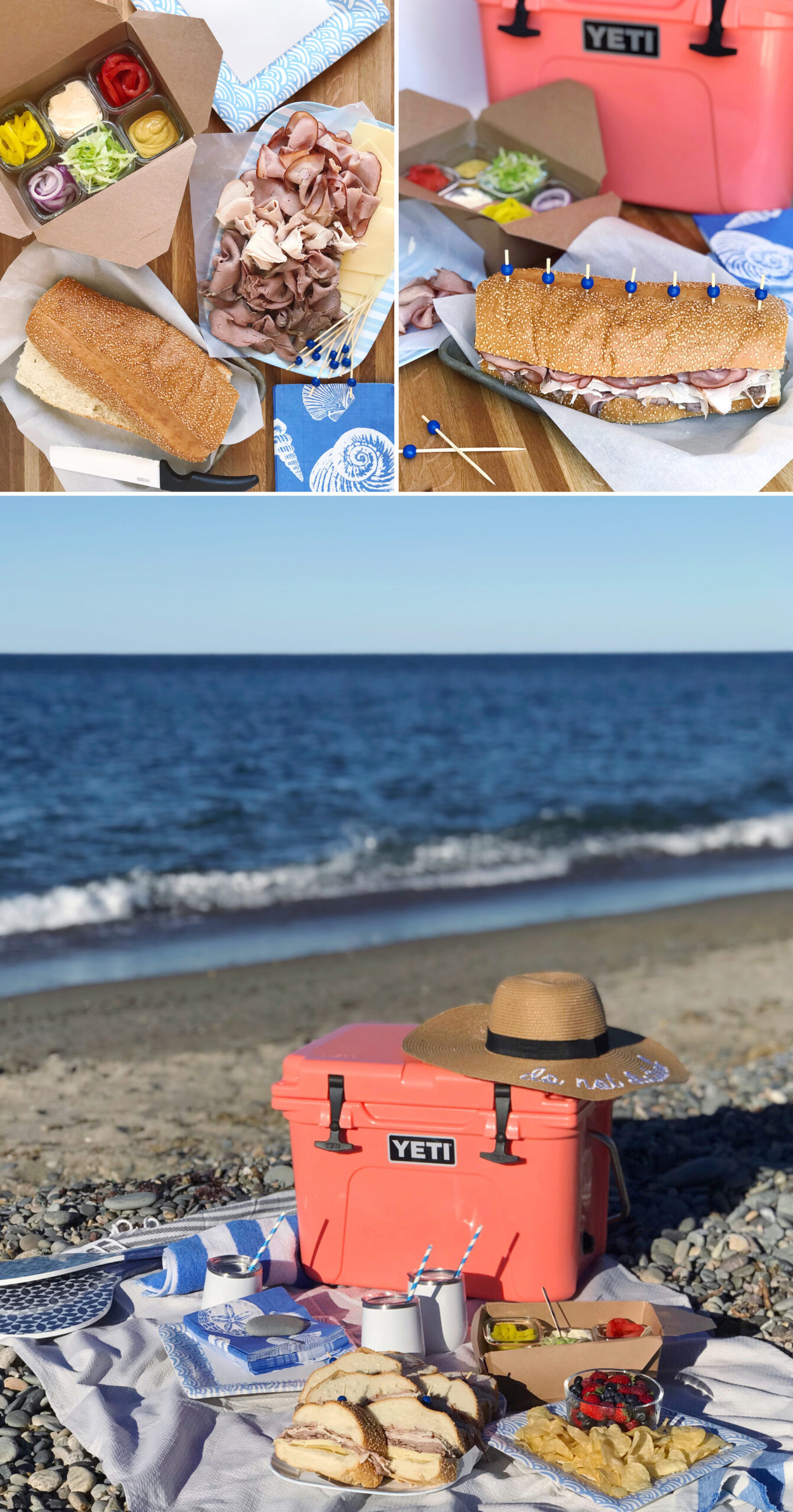 I’ve got the mom hat on now, and have some trial runs under my belt for beach picnic meals since we live close to the ocean. Packing a good beach picnic is an art form, a delicate balance of meal-prep and keeping things from getting soggy in the cooler! I have a trick up my sleeve for the latter that I thought I’d share with you today – it’s my beach picnic traveling party sandwich bar! Sounds fun, right? Here’s how I do it: I make one giant sandwich on a big loaf of seeded Italian bread. The sandwich is filled with a little bit of everything – I use delicious, quality deli meat like McKenzie’s Deli Turkey, Artisan Roast Beef, and Black Forest Honey Ham (which you can find at Shaw’s stores locally). Each ingredient adds its own distinct, authentic flavor! I pick a cheese that everyone can agree on – McKenzie Vermont Raw Milk Cheddar is a favorite. Then I close up the sandwich and place festive party picks down the center, and wrap the whole thing up to keep chilled in the cooler until we get to the beach.