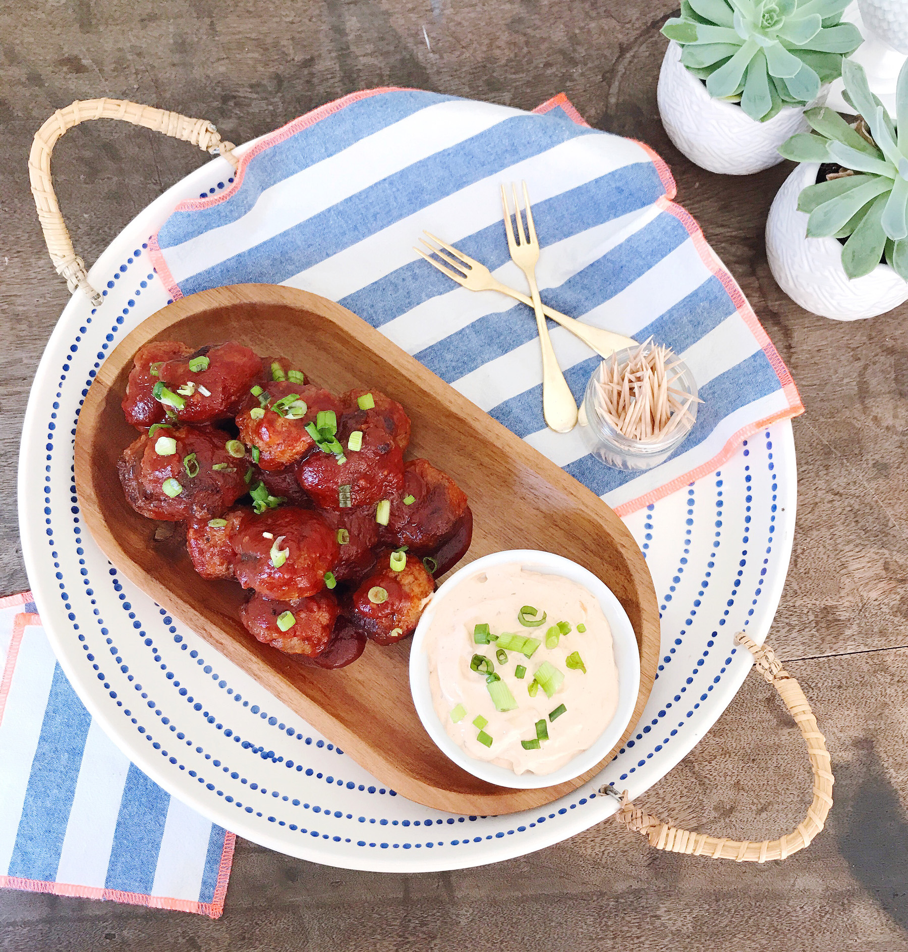 Every year at Christmas our family friends serve these amazing meatballs as an appetizer at their annual holiday party. It’s one of my favorite food traditions, and I was thinking about how delicious they were recently. I got the idea in my head to rethink the flavors in this tasty appetizer and give them a warm-weather spin to serve at summer parties. We’re huge fans of spicy food at my house, and drizzle hot sauce on just about anything we can get our hands on, and adding some heat to a meatball appetizer seemed like just the perfect idea.I seasoned the meatball mixture with ginger, garlic, soy sauce and sriracha for Asian-inspired flavors and that kick I was looking for. After the meatballs were cooked, I glazed them with a sweet and spicy sauce with flavors from orange juice, honey, tomato paste and sauce, and a bit spicier sriracha. You could definitely modify this recipe to have a little bit less kick by reducing the hot sauce in both the meatballs and the sauce, but the heat is the best part in my opinion! To serve the meatballs, I tossed them with some extra sauce, garnished them with lots of fresh chopped scallions (try some toasted sesame seeds too!) and served them with Heluva Good! Bodacious Onion Dip. This dip is delicious; I have a serious weak spot for onion dips and this one is no exception. I joke with my friends that chips/carrots/meatballs are all just a vehicle for what I really want: the dip. This particular dip flavor has just a little kick to it, like the meatballs, but still has that cool taste from the real sour cream to balance out the spice. The nice thing about this recipe is you can make everything in advance and reheat them quickly on the stovetop before serving them, and they taste great even when they’re not piping hot (it helps grab a bit more dip when they’ve cooled down too). They make awesome leftovers too! I’ve served them over rice with a little bit of spicy coleslaw (in fact, you can use a bit of the Bodacious Onion dip with the slaw mixture instead of sour cream and mayonnaise for extra bold flavor – a creative way to use tasty dip!). Okay, I’m drooling looking at these pictures and think it’s time to dig in, time for a spicy snack!