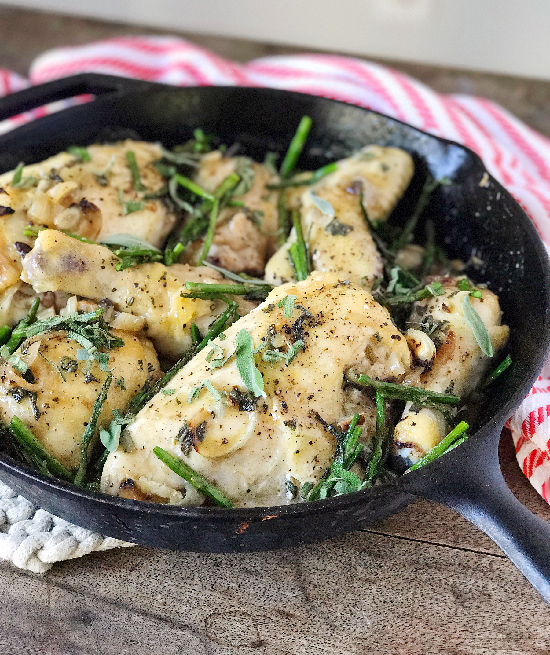 - Add chicken to a cast iron skillet, sprinkle with sliced shallots and sage, and pour white wine into the pan.
