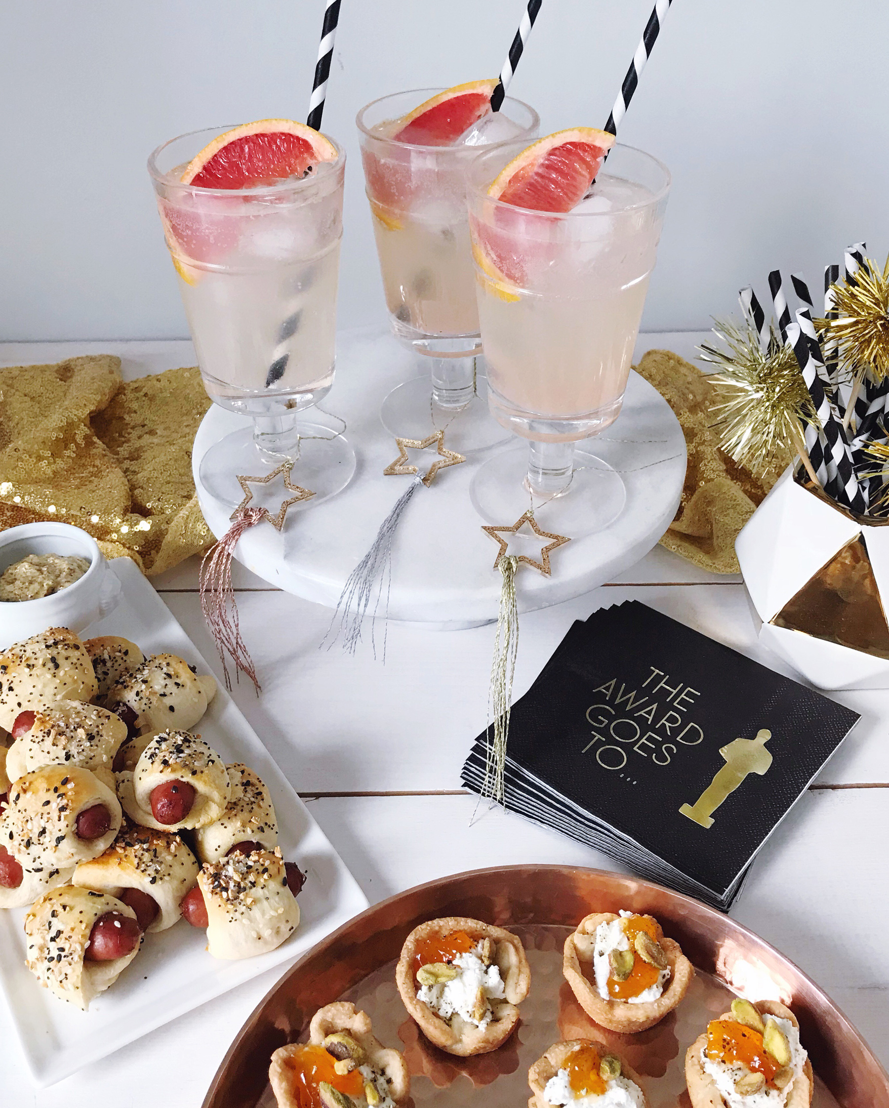 I’m working on my snack game for Sunday’s big night of red carpet viewing and all that Hollywood glamour. Oscar night at my house requires about the same level of appetizer commitment that the Super Bowl does in most other homes. I’ve been playing around with some ideas for quick and easy bite-size-tartlets, and these little guys were a winner. The base of the tartlets is made out of pre-made pie dough (use store-bought dough or thaw leftover dough from the freezer), pressed into mini-muffin tins. The dough is pre-cooked, and then filled while warm with a combination of rich goat cheese, sweet apricot jam, and crunchy pistachios with a sprinkle of cracked black pepper. Get the full recipe below, and be sure to check out the other awards show viewing party recipes I’m making for the Oscars — Ruby Red Carpet Cocktails and Everything Bagel Pigs in a Blanket.