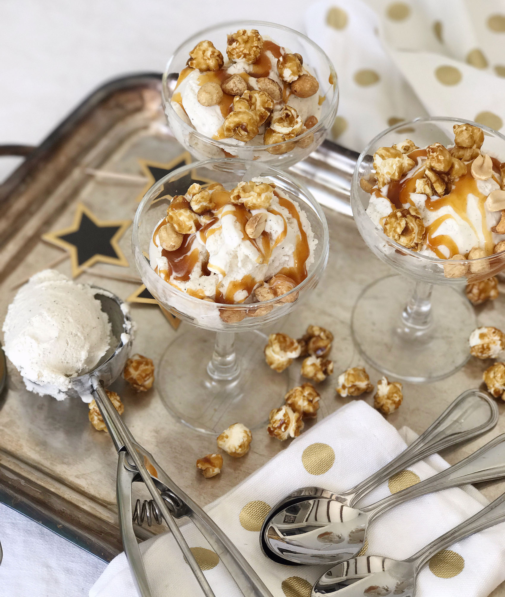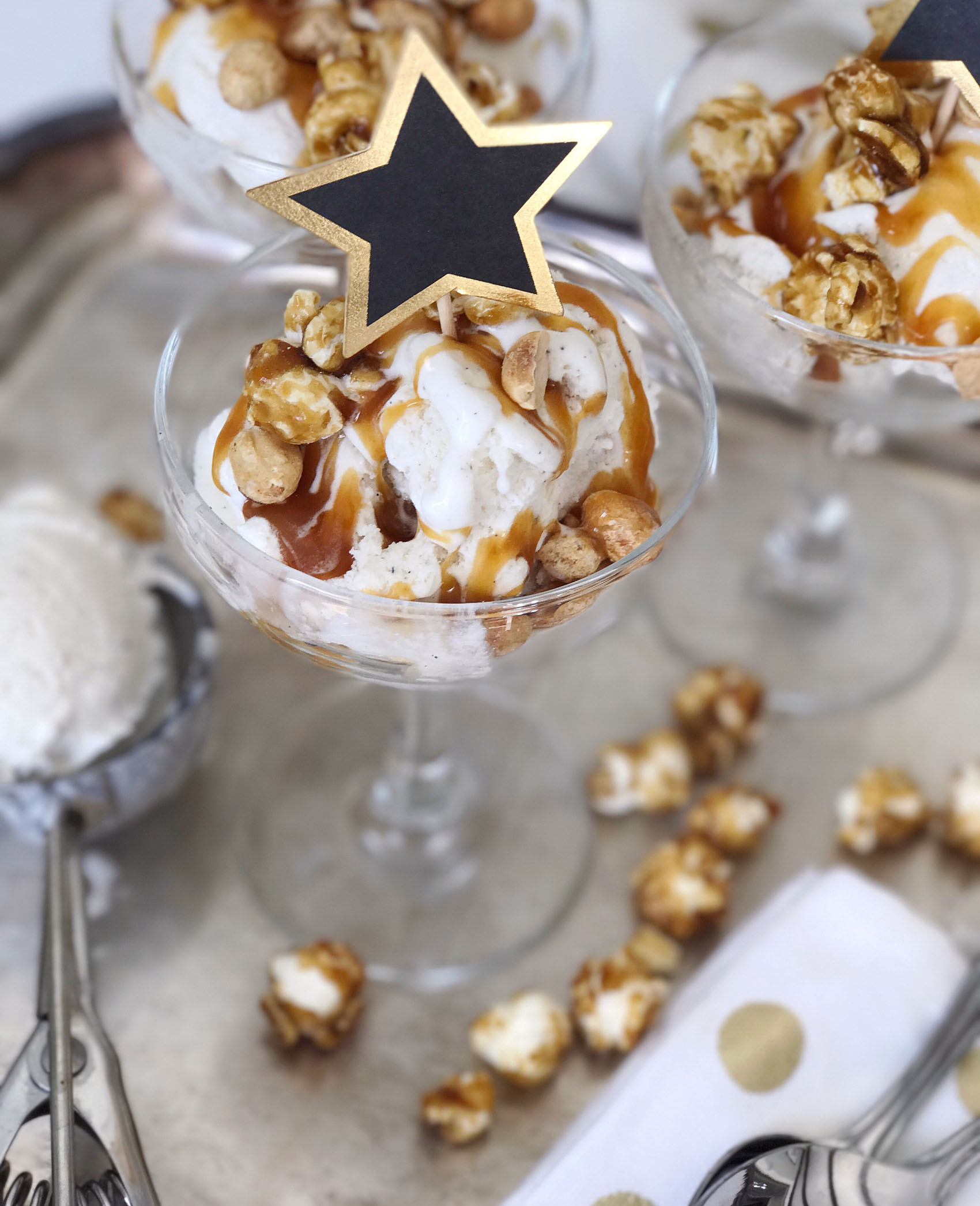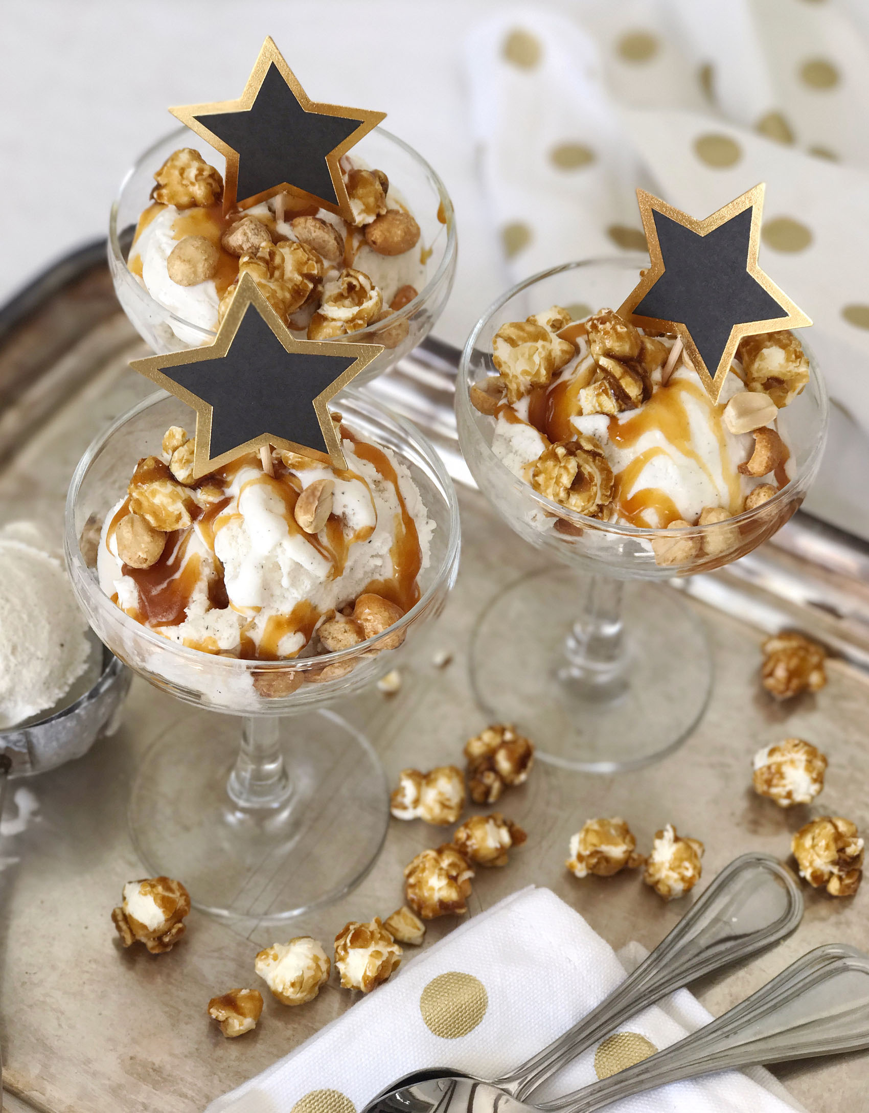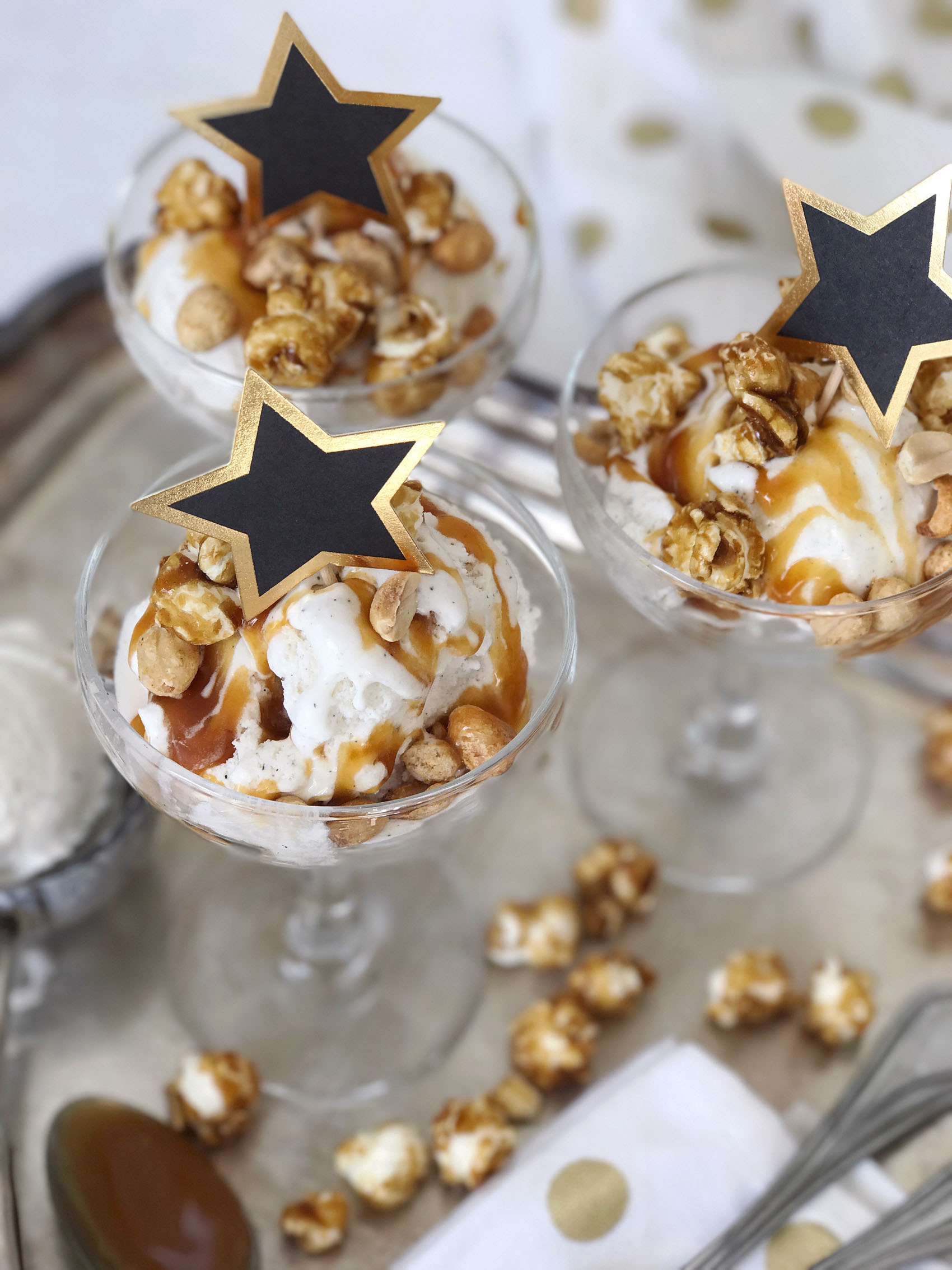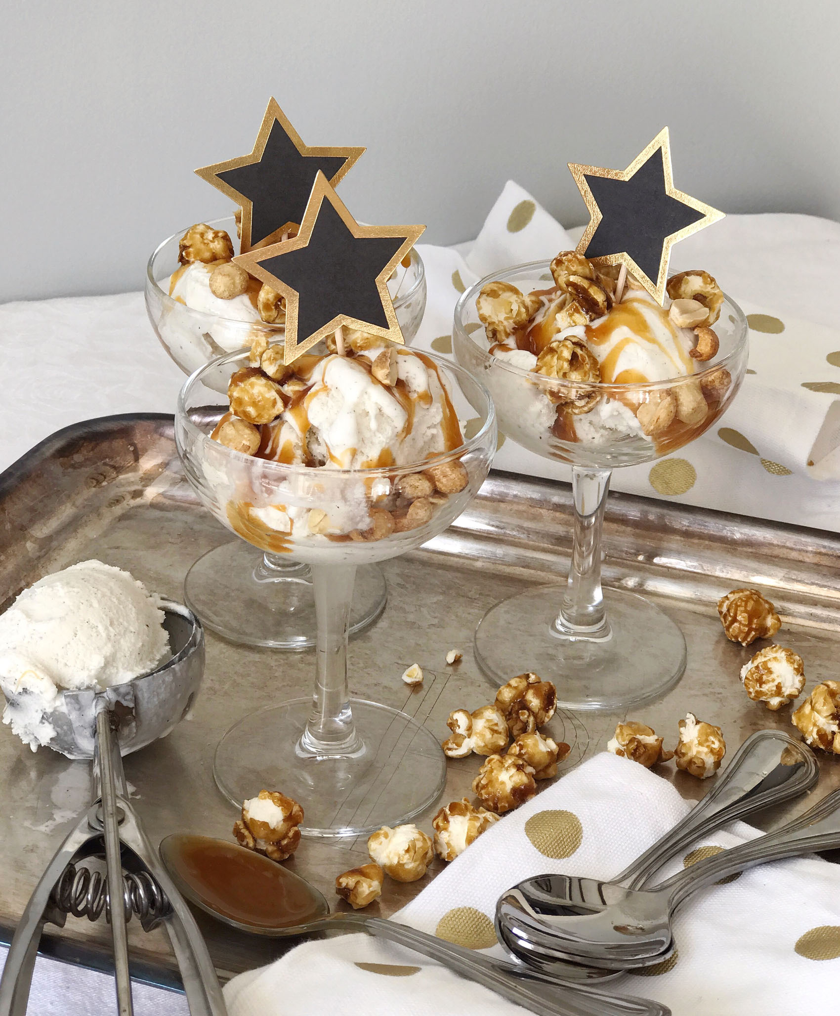 I’m getting so excited to watch the Academy Awards on Sunday night, it’s the biggest TV night of the year for me (sorry SuperBowl, red carpet wins!). My viewing traditions include cozy pajamas, fully charged iPad, iPhone and computer for live-tweeting and red carpet reviewing, and of course super-tasty Oscar’s night snacks. I have a sweet-tooth fix for this year’s show, a movie-theater snack inspired ice cream sundae. I started with vanilla bean ice cream (if you’re going vanilla, vanilla bean is always the right choice!), drizzled it with salted caramel sauce, and topped it off with caramel popcorn and salty peanuts. I’m a sucker for that salty and sweet flavor combination, and this sundae hits the spot. For a little extra nod to the Oscars, I served them in champagne coupes and topped them with Hollywood star cupcake toppers! Can’t wait to whip one of these up on Sunday as I settle in for a night of celebrities and ball gowns.