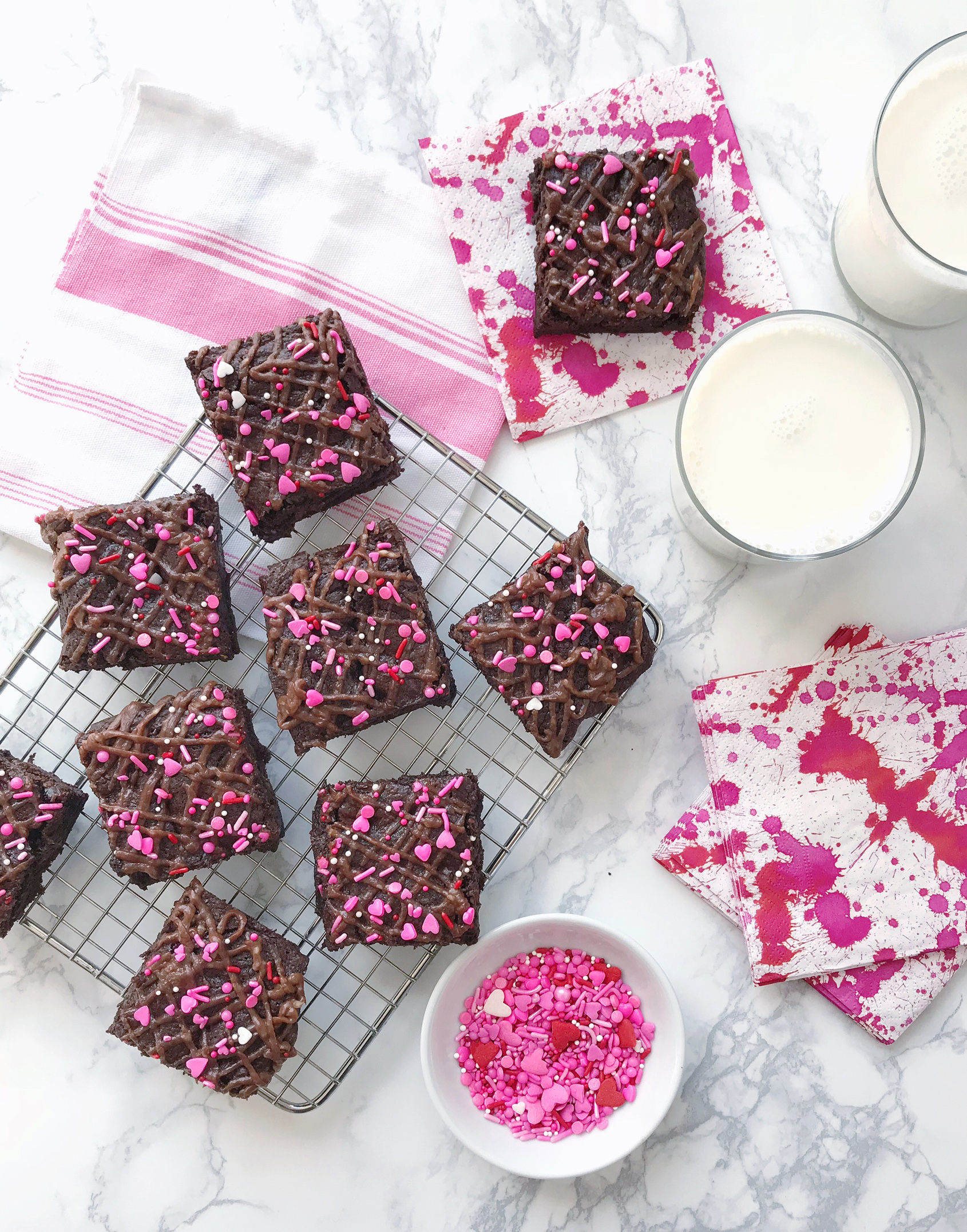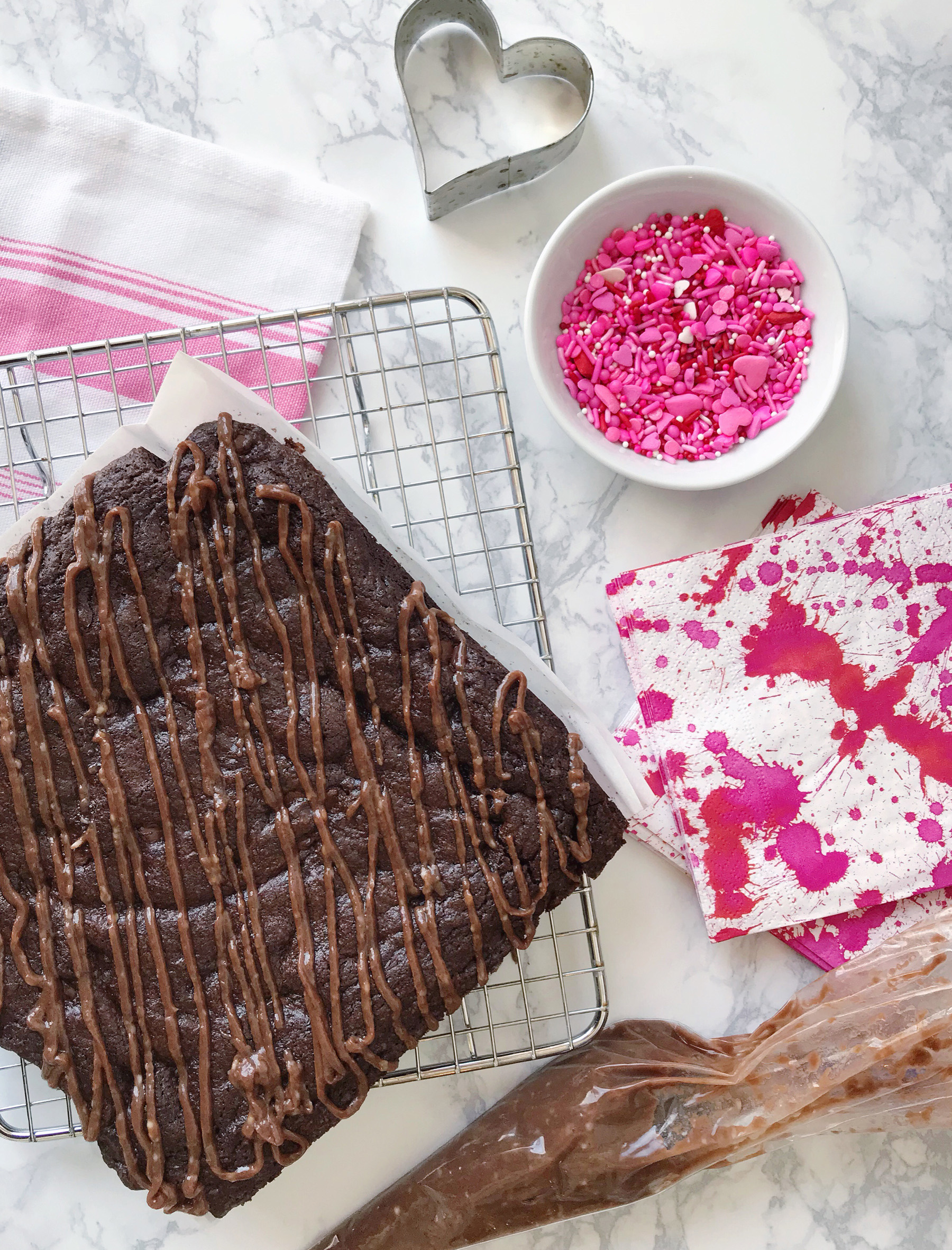 - Once brownies are cooled, use the filled pastry bag to drizzle the topping all over the top, and cover with sprinkles of your choice.