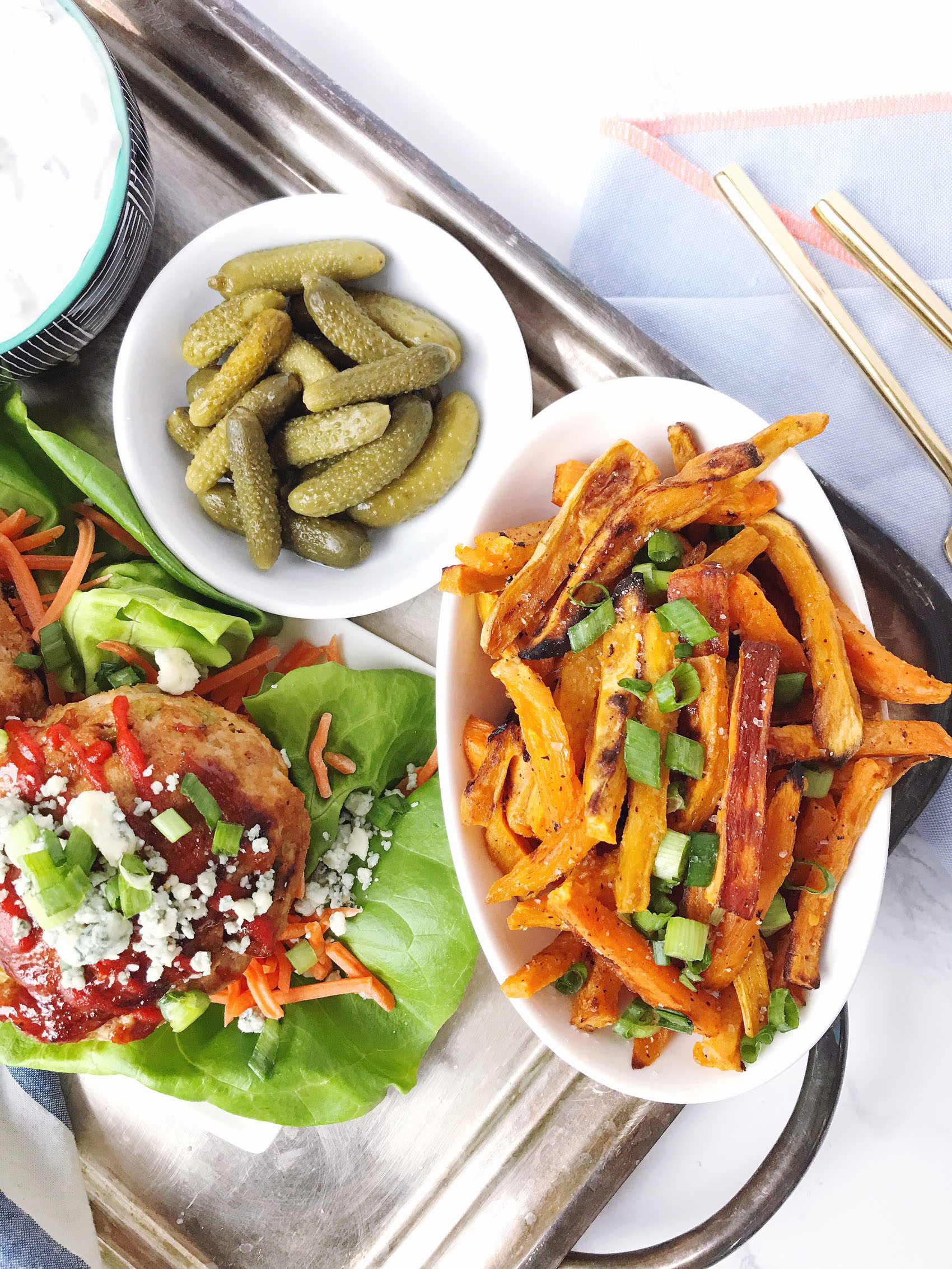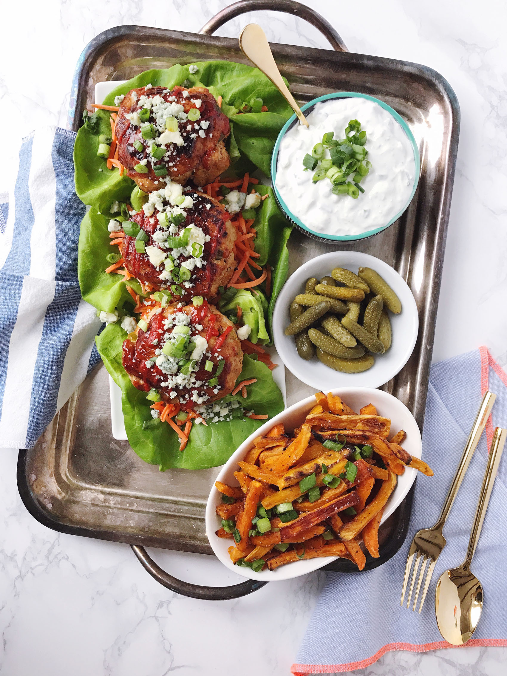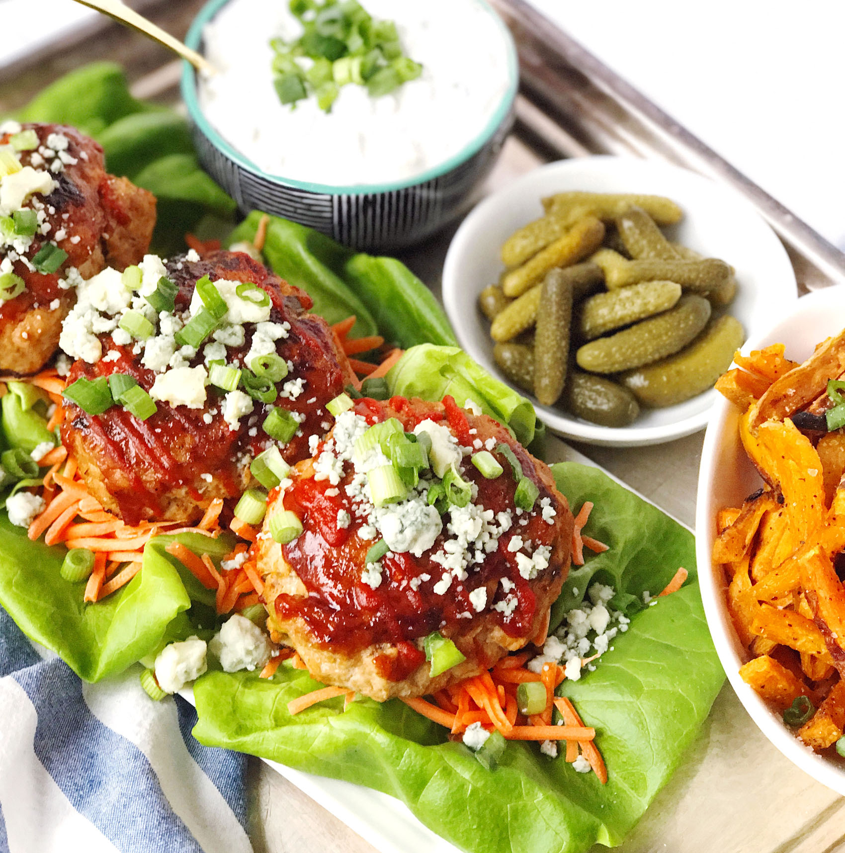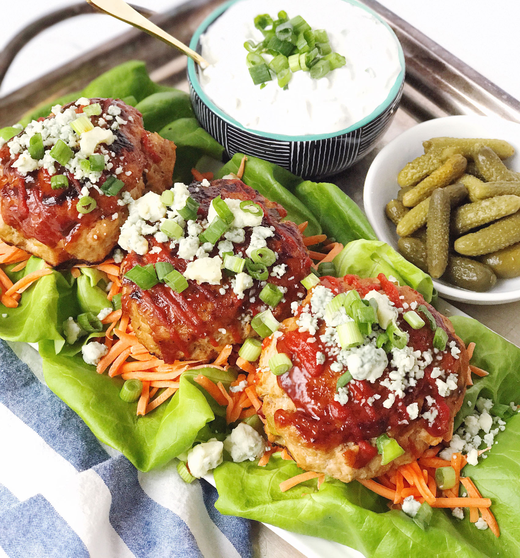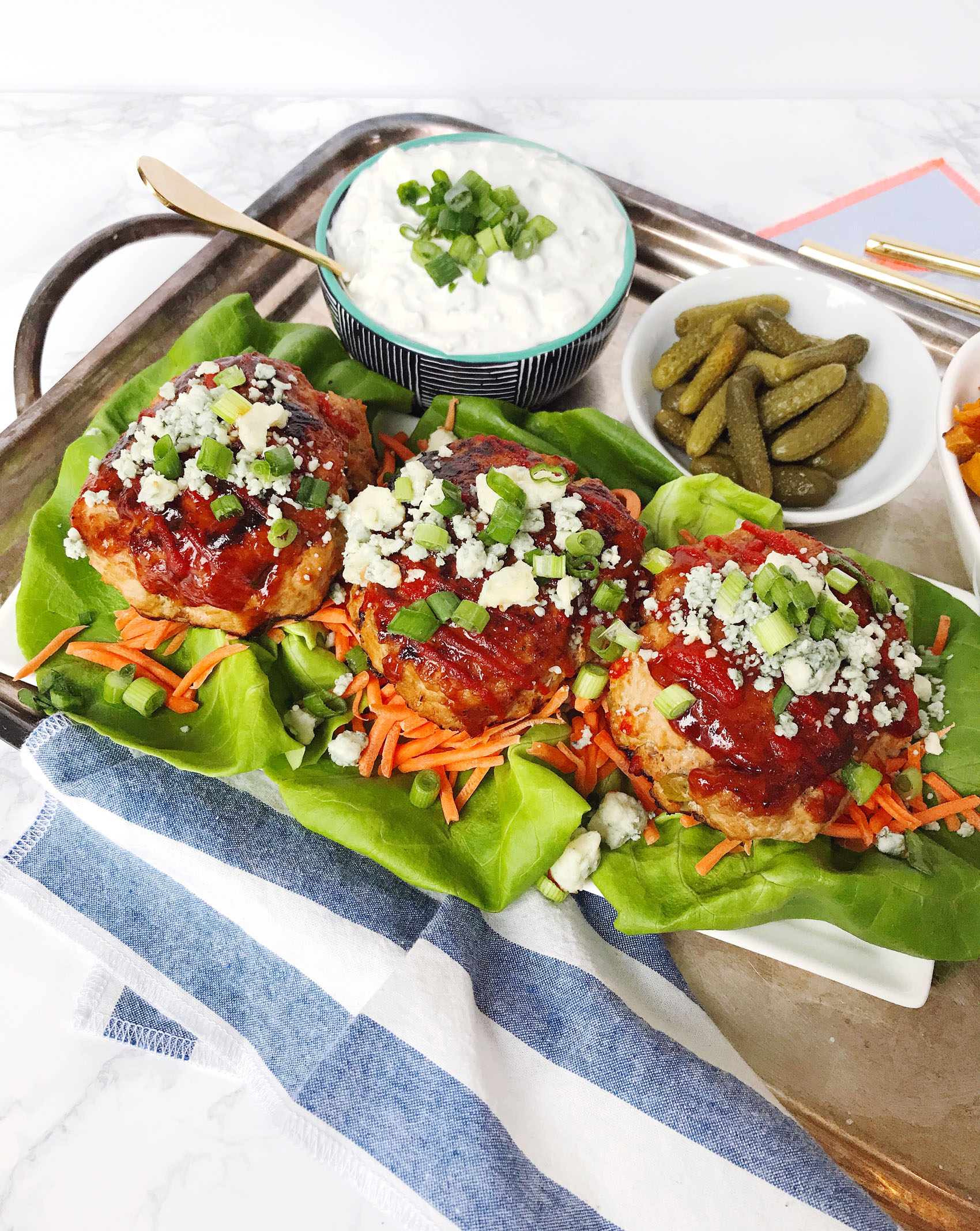 - Serve burgers on a bed of lettuce and shredded carrots, top with more crumbled blue cheese, scallions, and dipping sauce.