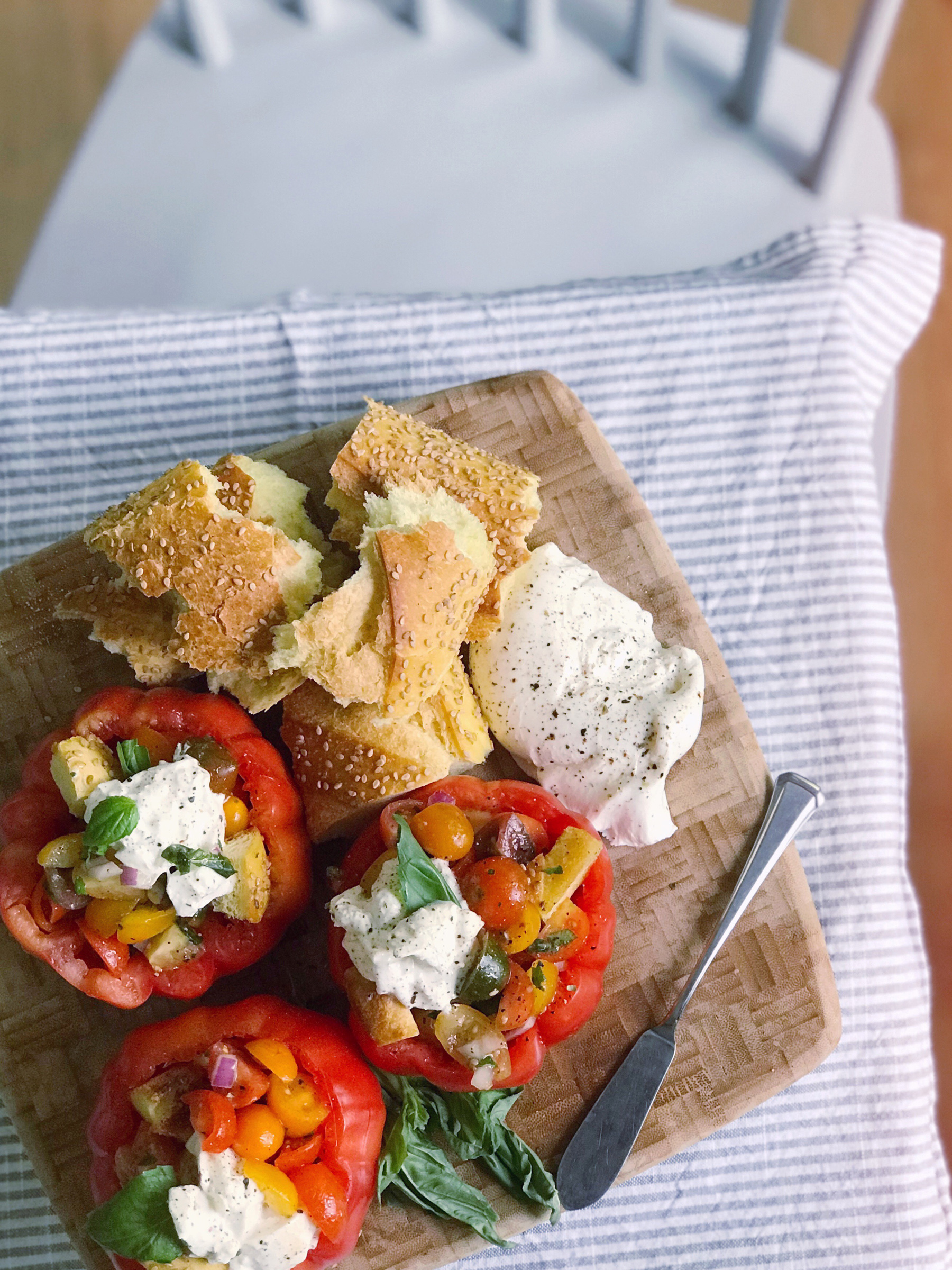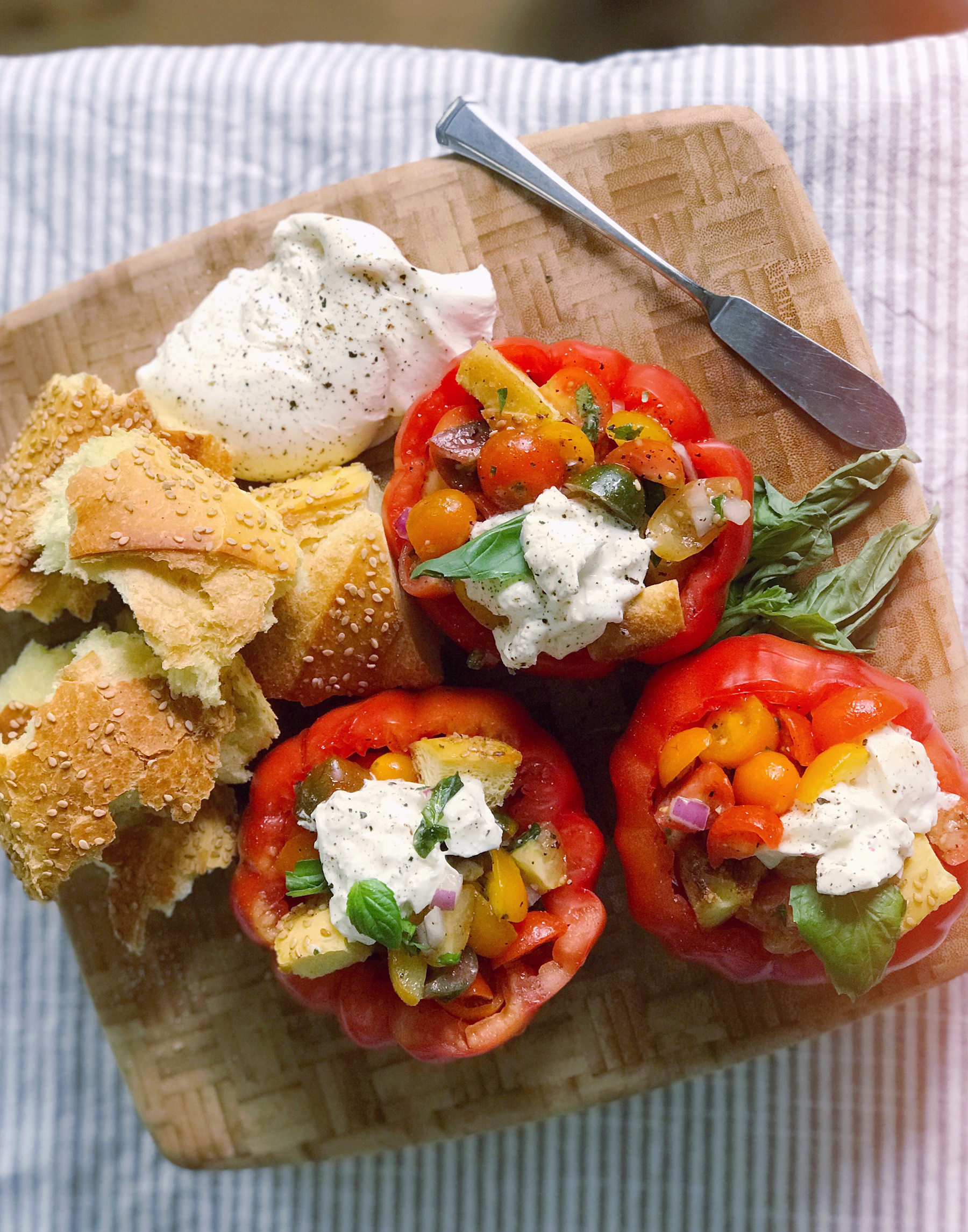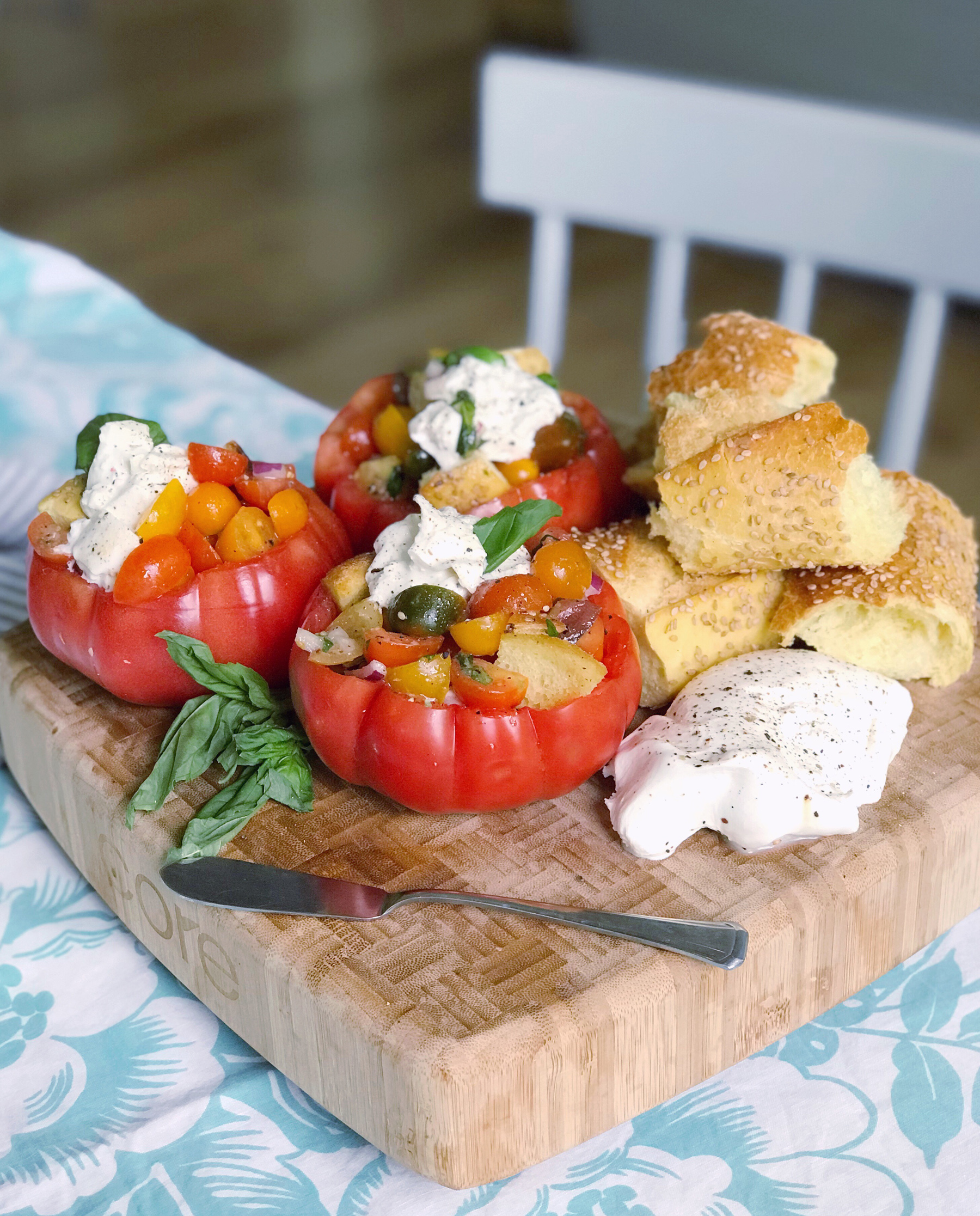 When I visit my parent’s house in New York, I always offer to do the dinner shopping because of their beautiful local grocery store. My mom laughs because whenever she asks me what I’d like for dinner, my response is always the same — let’s go to the store and get inspired. Looking at the ingredients is the best way for me figure out the answer to that question! On a recent trip, I was eyeing some fresh burrata at the cheese counter and tons of giant, colorful heirloom tomatoes. An idea sparked to mix up the tomatoes into a fresh, juicy panzanella salad with crispy bits of toasted Italian bread and bright herbs. Then I stuffed the panzanella into some of the larger tomatoes for serving and topped it all off with fresh, creamy burrata. It was a perfect dish to serve for lunch, or a side dish with A+ presentation for dinner parties. I even used some of the leftover marinated tomatoes and burrata and tossed them with warm pasta the next day for another delicious meal. Get the full recipe below!