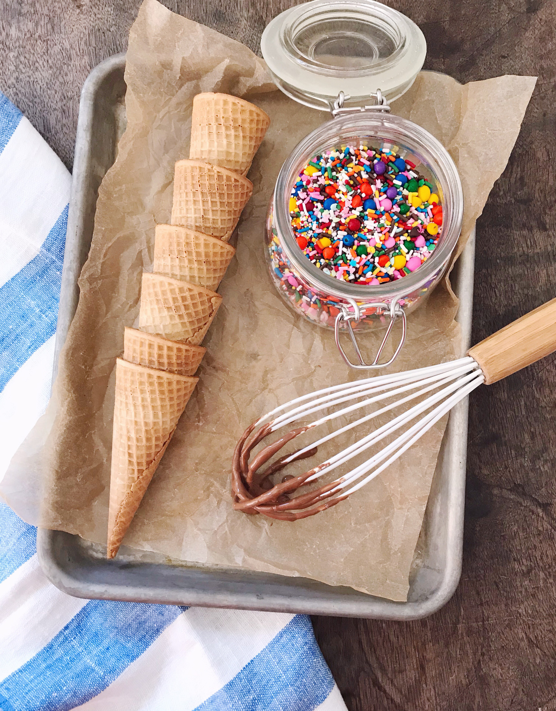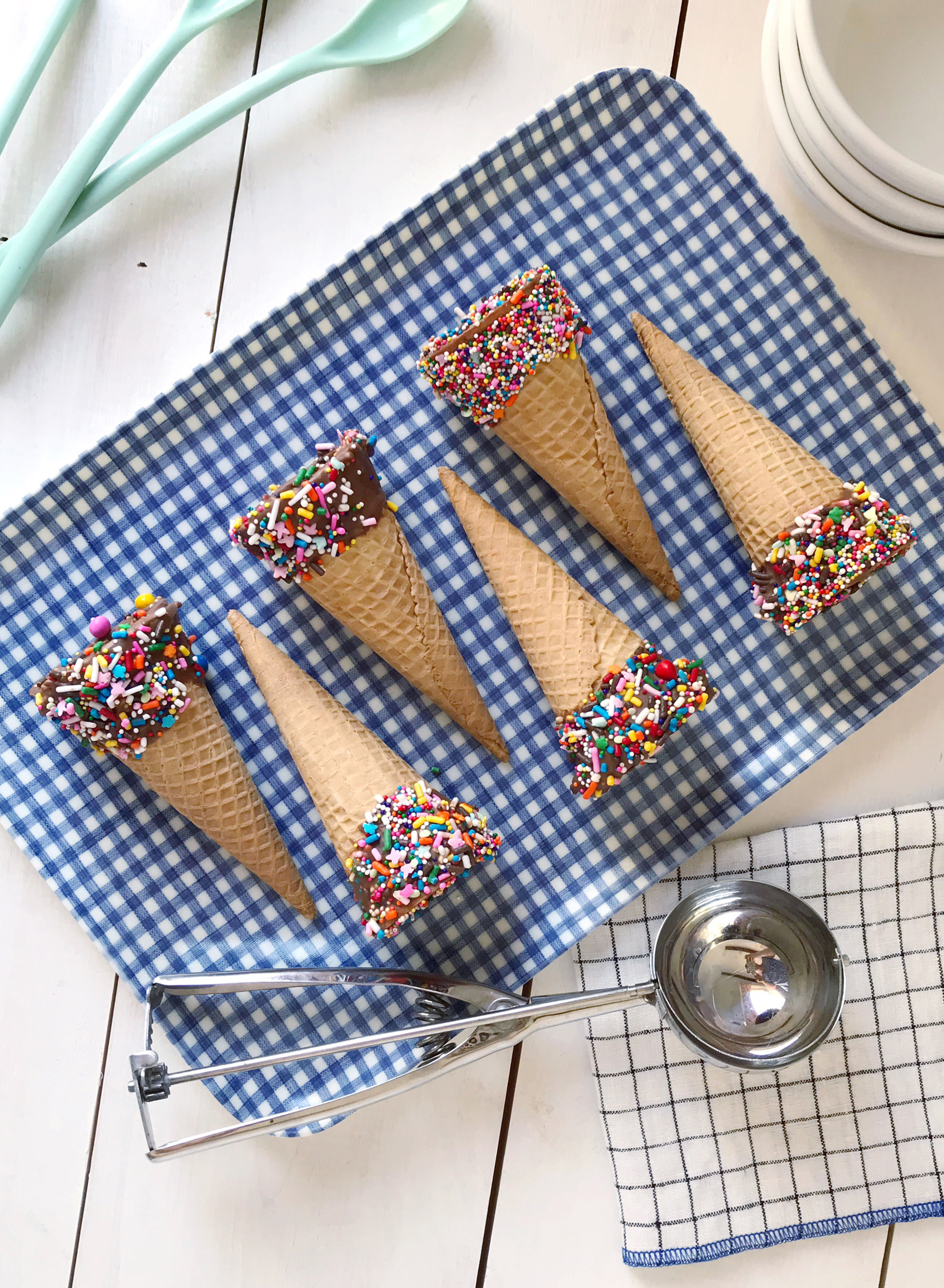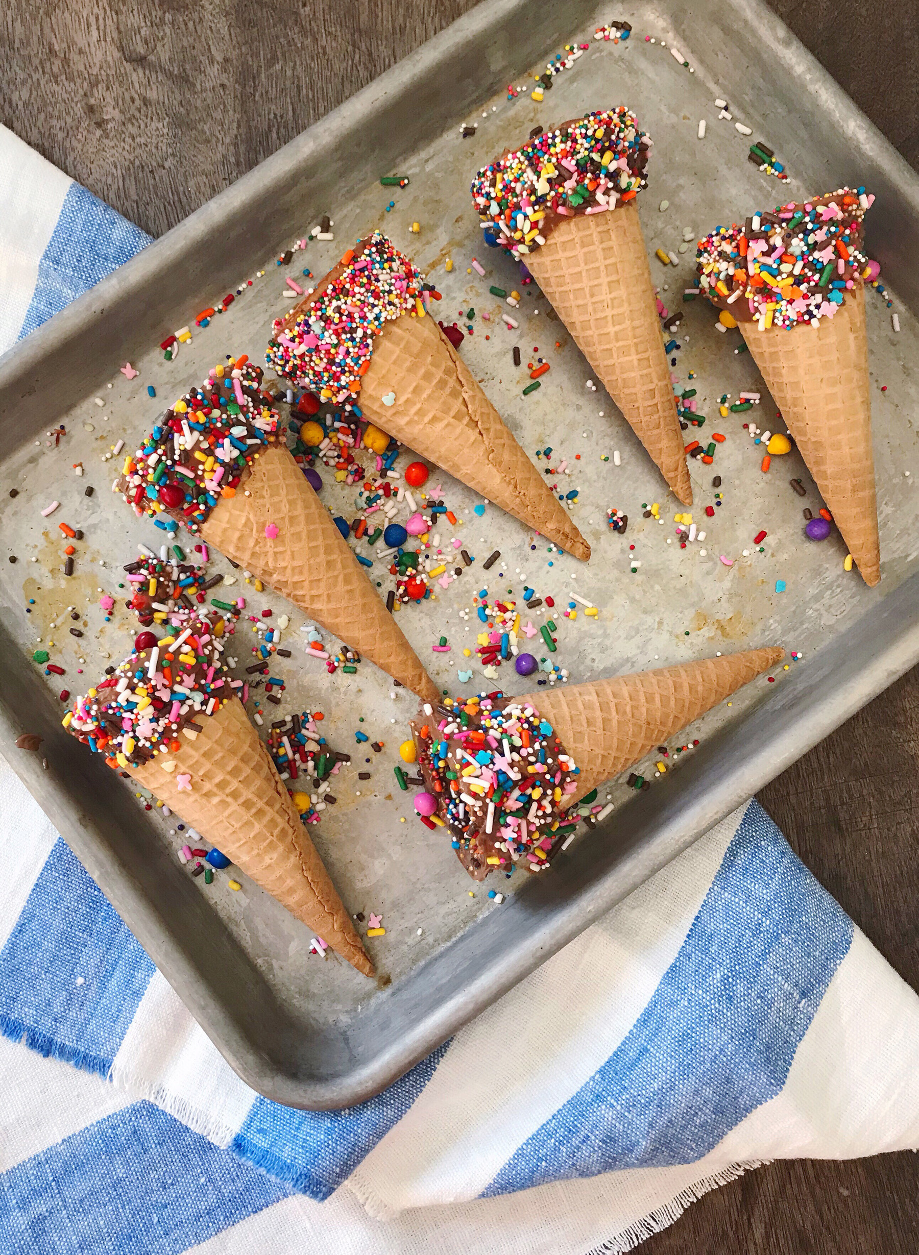 We had some friends over for a very small, casual BBQ. It was a last minute get together, and I didn’t want to spend a ton of time in the kitchen since it’s been so very hot out lately. I made a few quick side dishes, my husband was in charge of smoking a brisket on the grill outside, and all that was left to think about was dessert. Given the soaring high temperatures, I decided to get some ice cream from our favorite spot (Hornstra Farm if you’re local!), and ice cream cones for serving. Jane is very into ice cream cones right now — she is fascinated by being able to both hold the cone and eat it. I get her fascination — what a wonderful, practical, and delicious invention! I decided since it was a special occasion that I would jazz the cones up a bit and dunk them in chocolate and sprinkles.