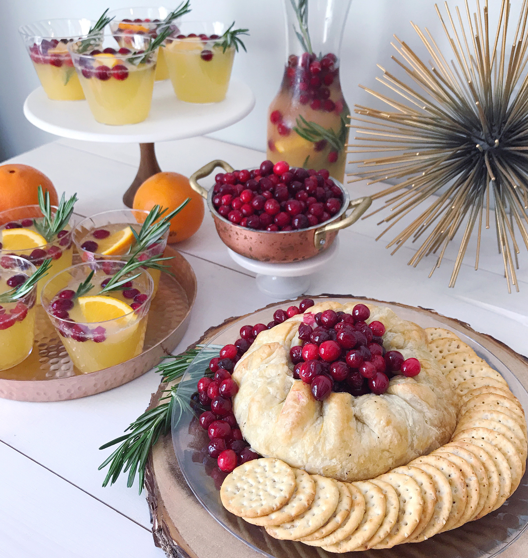 As the holiday season starts off, I love dusting off the entertaining skills and brainstorming new ways to celebrate with family, food and drinks! When I’m coming up with new recipe ideas, I always like to start with in-season ingredients. Around Thanksgiving and into the Christmas season, there is nothing tastier (and local to my area!) than using cranberries in recipes. I’ve found countless ways to add them into my entertaining mix in the past and continue to find new ideas for incorporating them into drinks, appetizers and décor.This holiday season, I thought it would be fun to try two new cranberry-driven concepts that are perfect for entertaining. A cranberry-ginger punch cocktail to serve to my guests, paired with a cranberry-glazed baked brie filled with juicy berries and nuts.To make the punch, I muddled cranberries, oranges, and a bit of rosemary and sugar together and combined it with a dash of orange juice, some ginger beer and vodka over ice. The sweet citrus of the oranges, tartness of the cranberries and bite of the ginger beer are a tasty combination for a holiday-flavored punch. I would love to pour all of the ingredients in a giant punch bowl, but really, who owns a punch bowl anymore? I’m all for cutting down on serving pieces that collect dust in my pantry, and instead approaching the punch with a more modern serving approach. I make one batch and pre-pour it into Chinet® Cut Crystal® cups so that guests can grab the cocktails off the bar. It looks festive with the drinks garnished on display! You can make a second batch in a pitcher and leave it out for refills when guests are ready for another pour.To pair with the cranberry-flavored cocktail, I made a complementary snack – a spin on a classic holiday appetizer: Baked Brie. I combined cranberries, brown sugar and a bit of the orange zest (to pull in the citrus flavor of the cocktail) in a saucepan to create a topping for the baked brie. Wrapped in pastry dough and baked, I topped the brie with the cranberry mixture and some chopped pecans for more flavor and texture. The result is that warm, gooey cheese that I love to slice into at a holiday party. I hate cleaning up that amazing melted cheese off of plates though at the end of an event, so I serve it on Chinet Cut Crystal plates. It looks polished on the table and saves me the headache of scraping cheese off my serving dishes after everyone has gone home for the night – just pop it in the recycling bin instead! You can even use these plates as a buffer on top of a charger that isn’t normally safe for food, like the one I used here – a slice of a tree stump for a rustic, natural look.For both the cocktail and the baked brie, I added a few rosemary sprigs for garnishes, which is one of my favorite holiday season tricks. They smell delicious and have that pine-look that feels right on point with my holiday decorations. Get the cocktail recipe below and tell me what’s on your holiday menu in the comments!