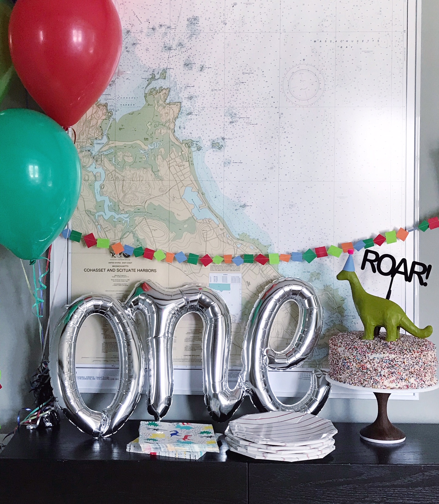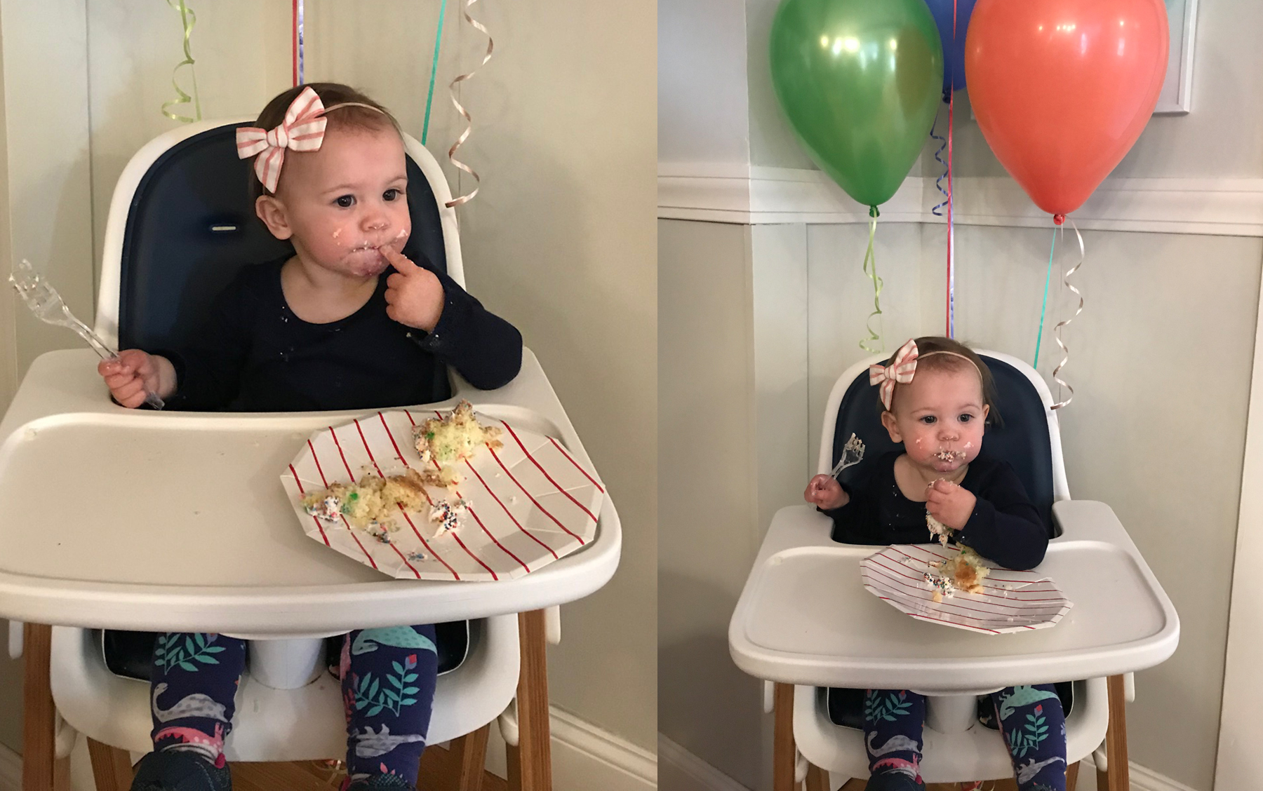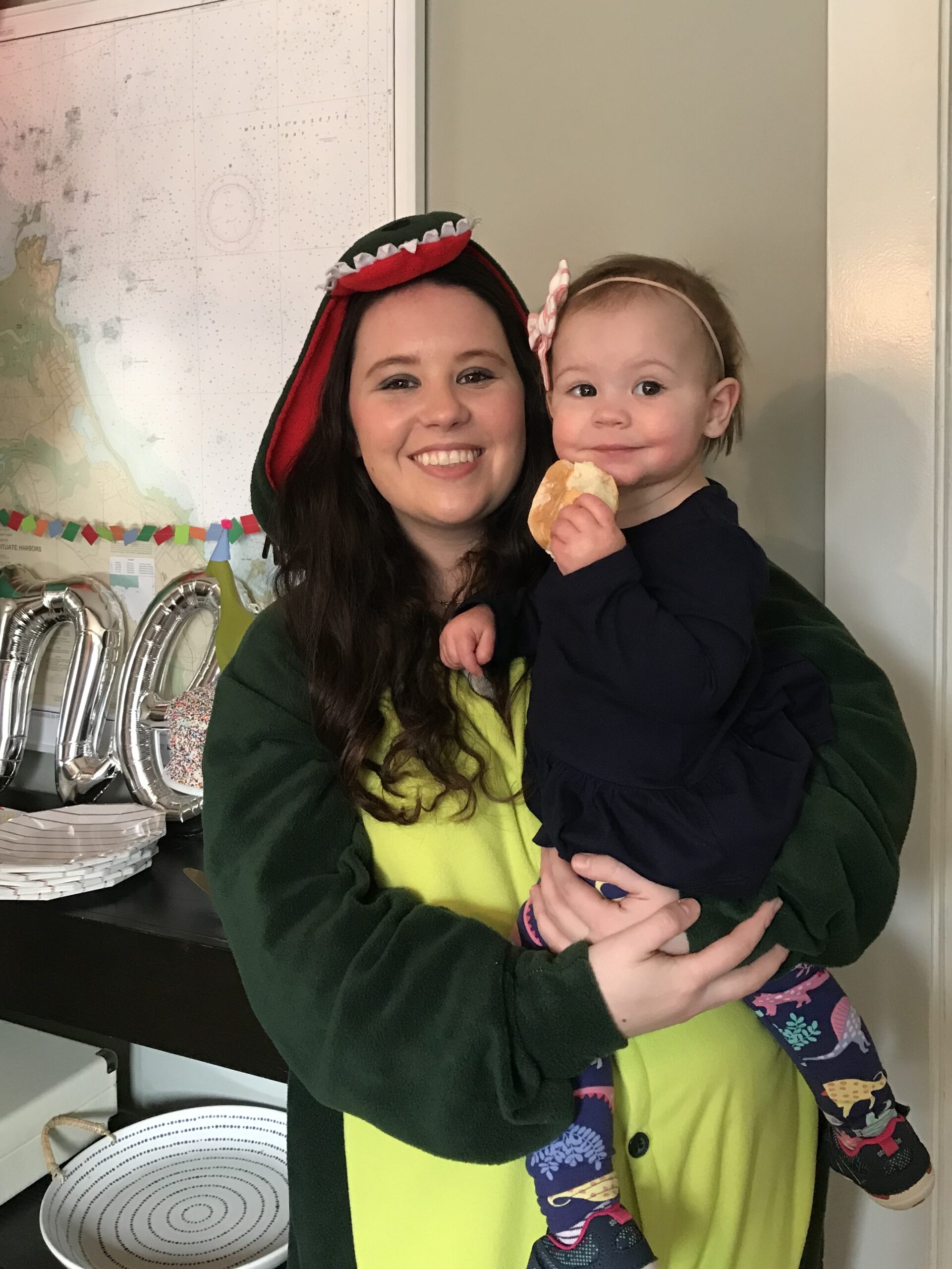 When I was still pregnant with Jane, my family was joking around and asking me if I had a theme for her first birthday party yet. Oh, they joked, but I honestly already had been thinking about how fun it would be to get to throw birthday parties for her. Over the last year, I tossed around idea after idea, and finally settled on a theme fit for our sassy, funny, little daughter who loved to say RAWR: dinosaurs. Jane loves books about dinosaurs, the toy dinosaurs at our local library are the first thing she crawls to when we visit, and she believes that all animals, no matter how big or small, say “roar” just like the dinosaurs. So a dinosaur themed party was an easy and obvious choice! We had our immediate family come over for the celebration, and a few of our friends who have young kids around Jane’s age. It was pretty much the cutest thing ever to see her and her little buddies running around with party hats on (they were loving chasing the walking dinosaur balloon!). I DIY’ed a few simple dinosaur-themed decorations by using my Silhouette machine to cut out tiny paper dinosaurs for homemade garlands. The garland color scheme was pulled from the most darling paper napkins with a modern dinosaur print on them. I made some extra garland and dinosaur cut-outs to decorate a menu for the lunch buffet, and used small glass vases with eucalyptus leaves in them to decorate the tables. The greenery was really simple, but had that wild-prehistoric look to it!In Jane’s playroom, I set up a table with some stuffed dinosaur party favors so that her little buddies could adopt their very own dinosaur. I found the stuffed dinosaurs in the Target dollar-bin (and credit goes to my mom who went to 4 different Target stores to find them all, thanks mom!). Above the party favor table I made a little photo wall with all of the monthly photos I’ve taken of Jane. Those darn photos became so much work once she started to squirm and move, so I’m glad to have been able to display them and give them their moment to shine! For the menu, I went with a barbecue theme. We had pulled pork sliders (I used the Pioneer Woman’s recipe and converted it to cook in my InstantPot)and my homemade mac and cheese with crushed BBQ potato chips on top. On the side I made a skillet of roasted bacon brussels sprouts, a sriracha coleslaw, cheddar-chive cornbread, and put out a variety of pickles and cruditè. Of course, it’s not a birthday party without cake! Funfetti is a tradition in our household, and was an absolute must-have for Jane’s first birthday. I made a double-batch so I could layer it high on my favorite AHeirloom cake stand, covered it in rainbow sprinkles, and then went over the top with cake toppers! I made a green party-hat adorned dinosaur and paired it with the modern ROAR! cake topper from Geese and Ganders. Jane loved it, and kept pointing to the dinosaur long after the cake cutting was over because she thought there might be some more icing she could lick off the bottom of the feet.Everyone got in on the fun. My hilarious sister bought a dinosaur costume and changed into it during the party. Both adults and children thought it was hilarious. My mom brought Jane some dinosaur leggings to wear for her birthday out. Even Jane’s beloved stuffed puppy that she brings everywhere was feeling the festivities and got a party hat!The highlight of the day was seeing her face light up when everyone sang happy birthday, she totally got that it was all for her, and it basically made my heart burst. She is so very lucky to have so many people who love her this much. And she’s also so very lucky we let her eat all that cake, but you only turn one once! Happy birthday Janie!