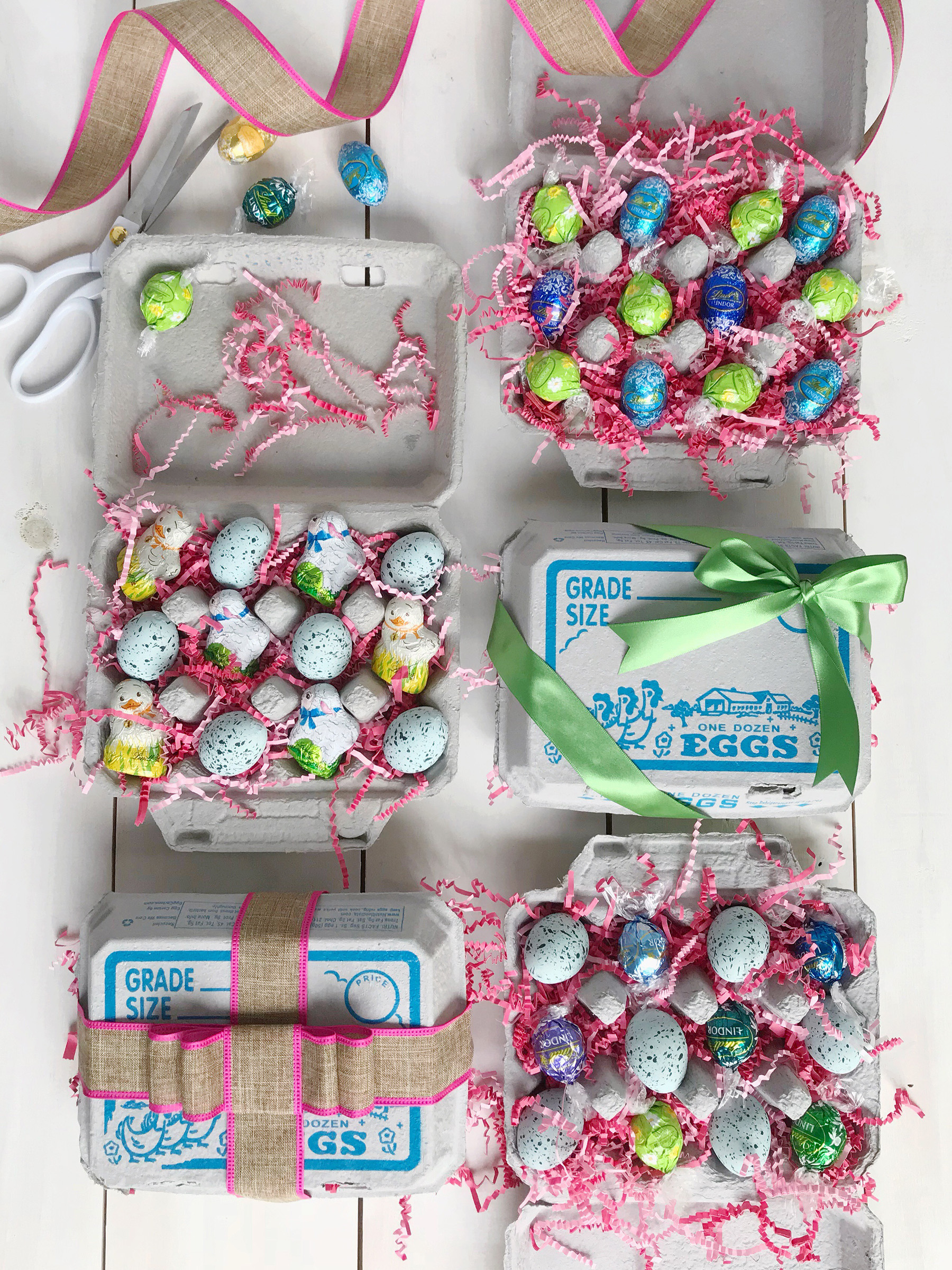 Can you believe Easter is next weekend? It snuck up on me, which means this week I’m making sure Jane has a cute dress to wear, finishing up her Easter basket, and figuring out what I’m going to bring to my in-law’s dinner! One item already marked off my Easter prep list is coming up with a cute (and oh so simple!) hostess gift idea made with egg cartons and some chocolates.