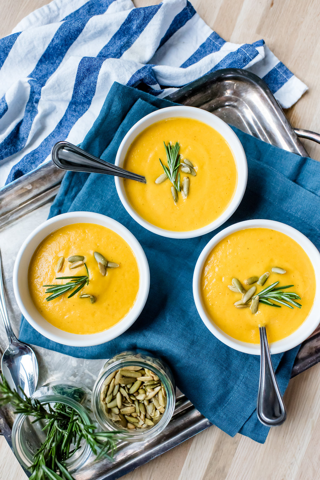 - Once the mixture is nearly smooth, add in warmed chicken broth and cream and pulse for an additional 30-60 seconds to combine. Serve hot with crusty bread, add a swirl of crème fraiche, fresh herbs or salty roasted pepitas for garnishes