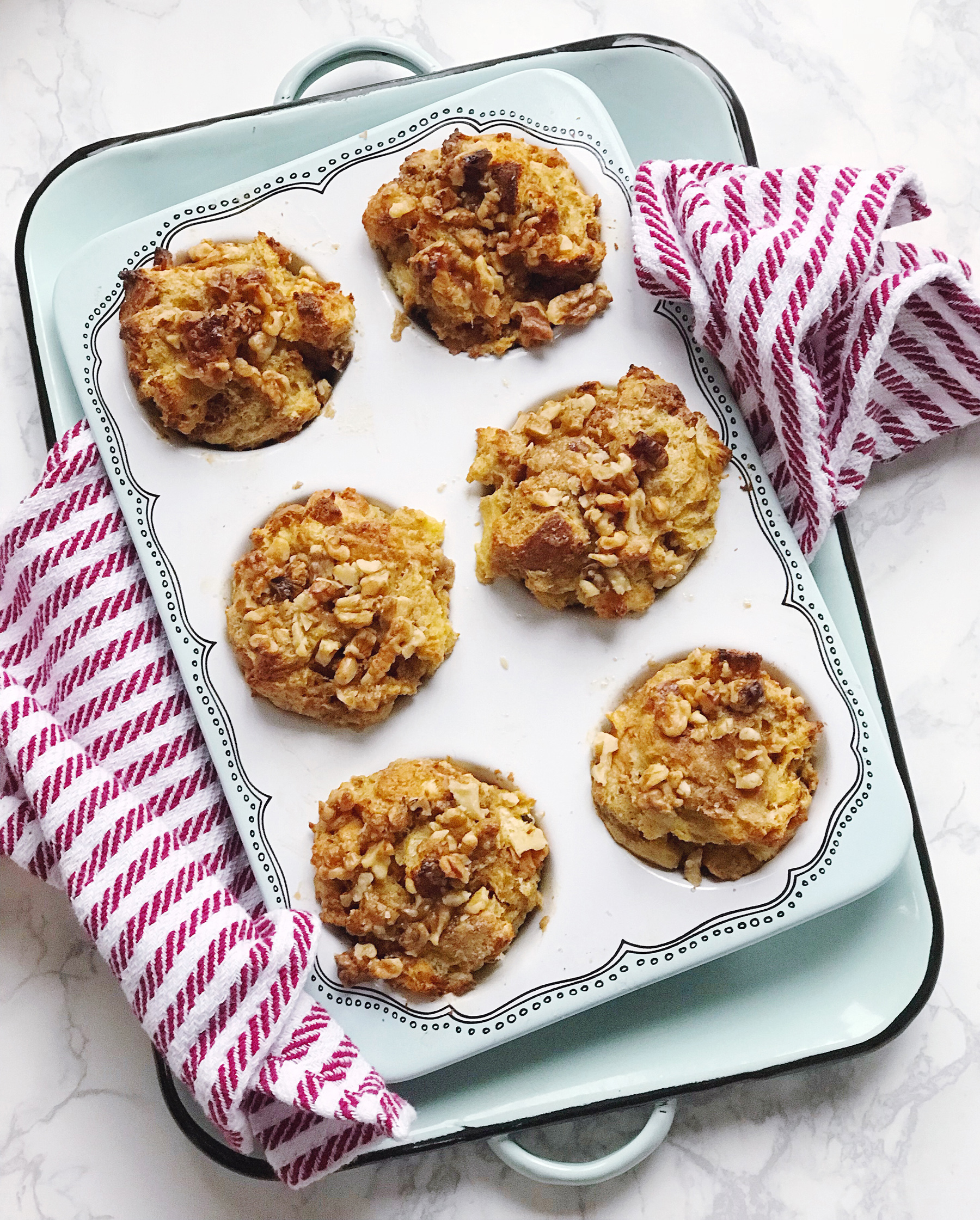 - Scoop the walnut crumbles onto the top of each muffin, pressing down slightly to get the nuts to stick to the bread.