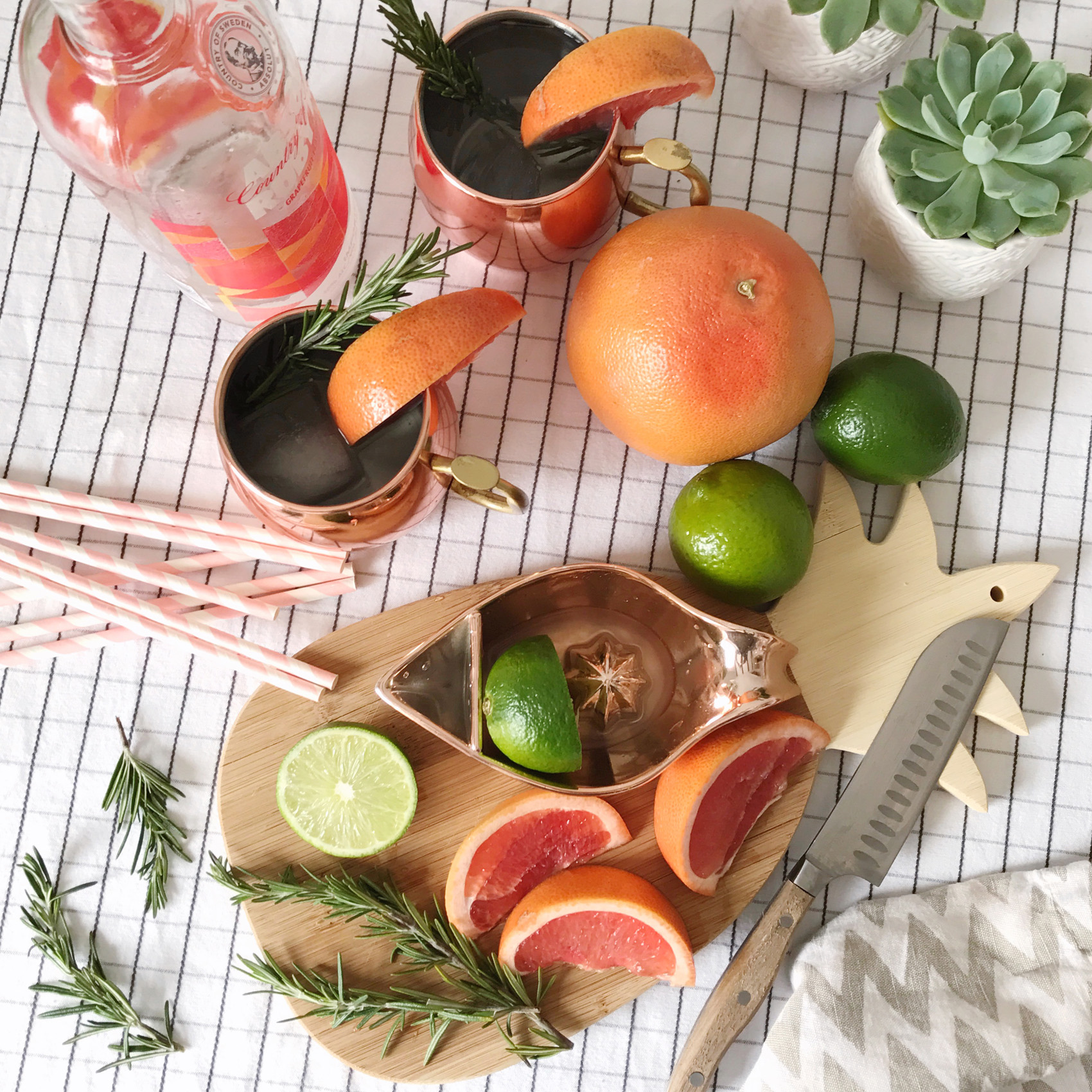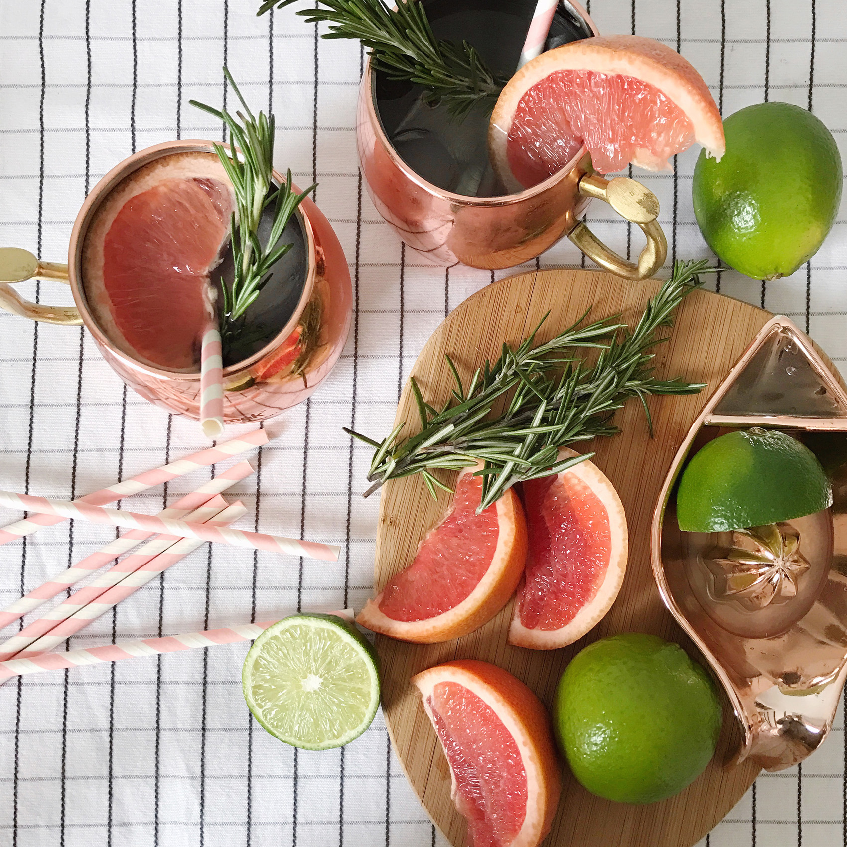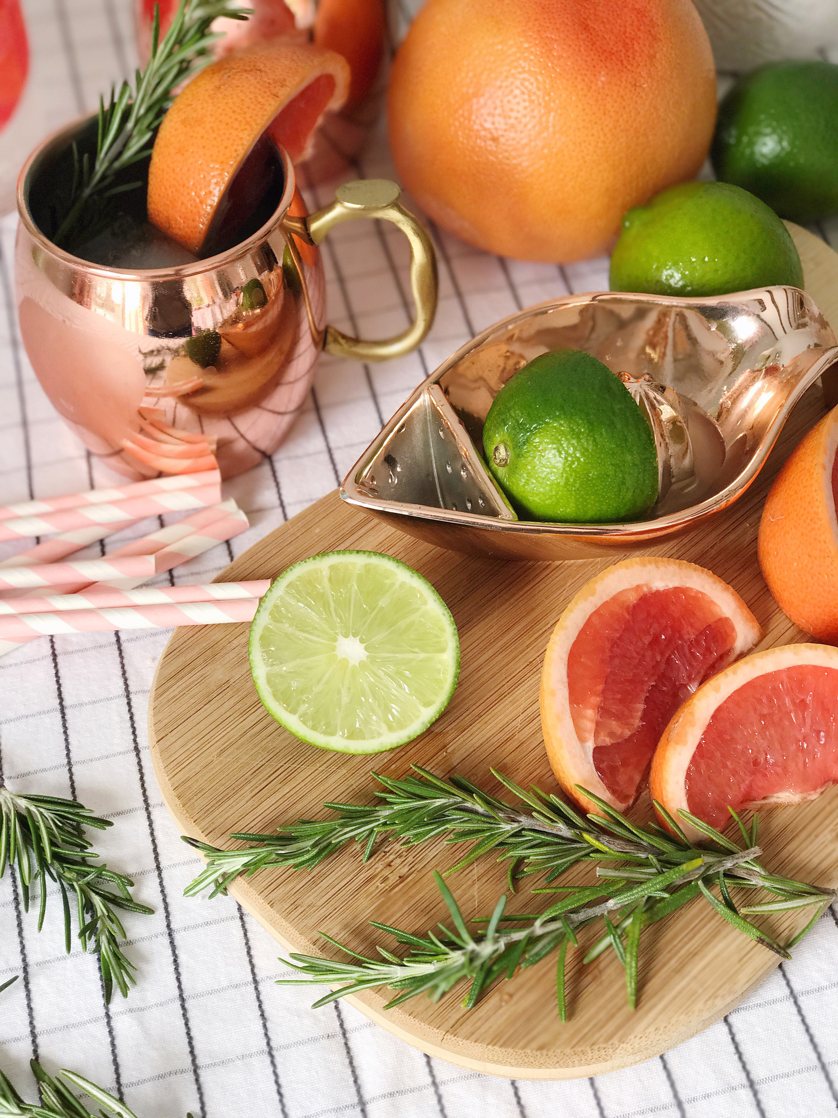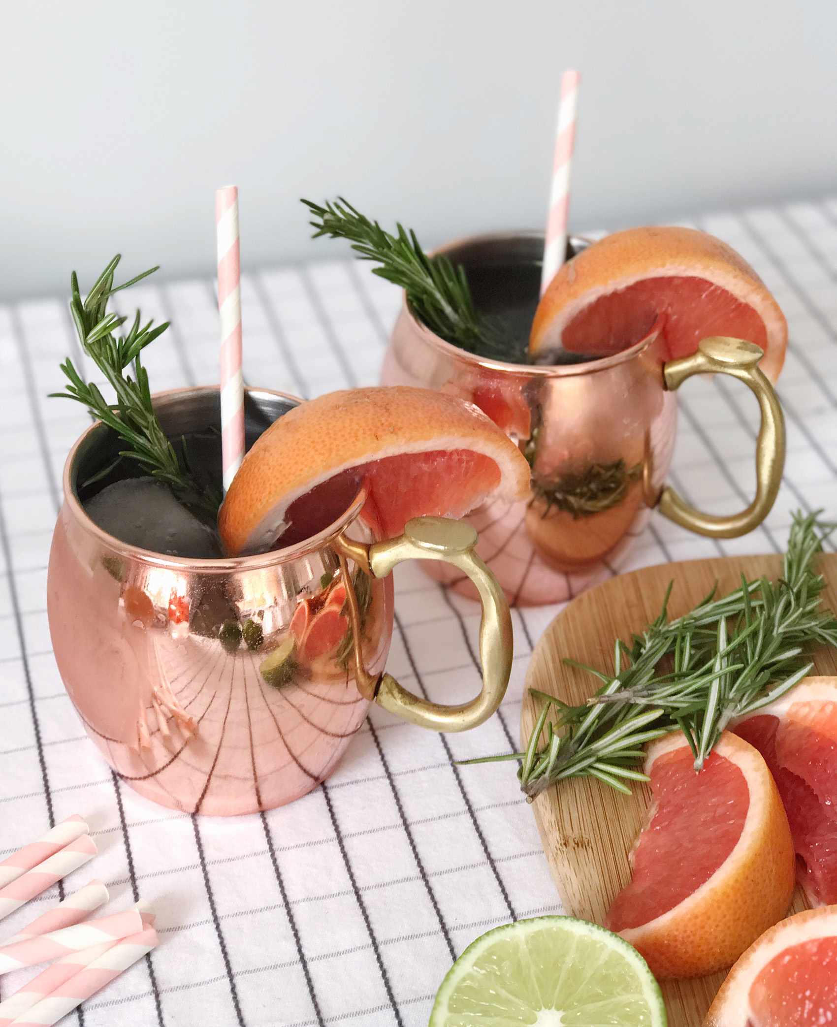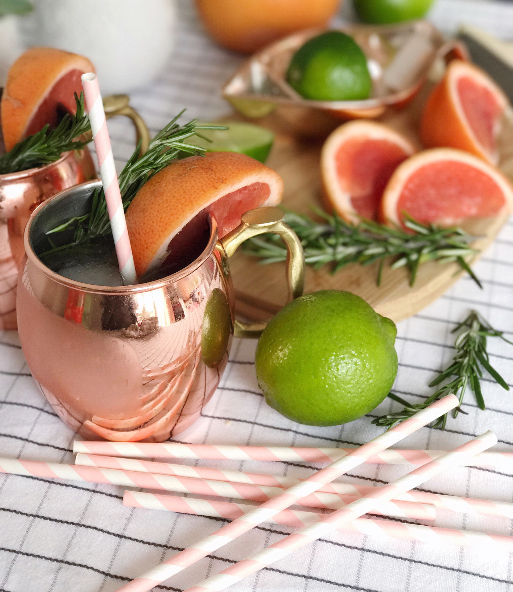 A few weeks ago we had some friends over for brunch and I decided last minute that I wanted to whip up a cocktail to go with our meal. I keep a pretty well stocked bar cart, so my options were wide open to anything that would pair with the citrus I had on hand. A juicy, bright grapefruit was on my counter, and a few limes leftover from a recipe my husband had made. By chance I popped open the freezer and saw I had a bottle of grapefruit vodka that must have been in there since last spring before I was pregnant. With these ingredients in mind, I had my eye on a Moscow mule with a twist! I used the grapefruit vodka and fresh citrus to mix up a tart-version of this classic drink, and finished it off with a few springs of rosemary and some fresh grapefruit wedges for the prettiest looking cocktail. These are going to be on heavy rotation this spring, I’m hooked!