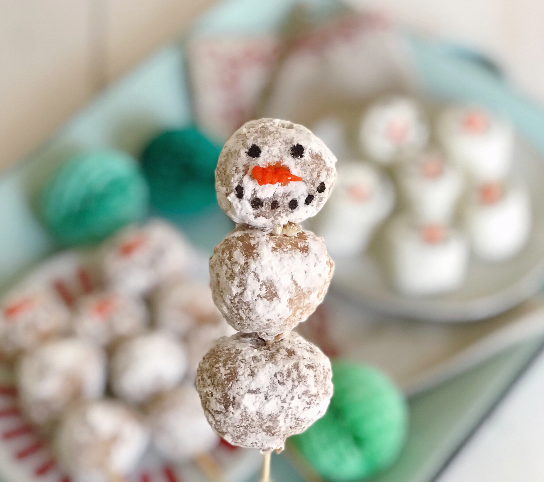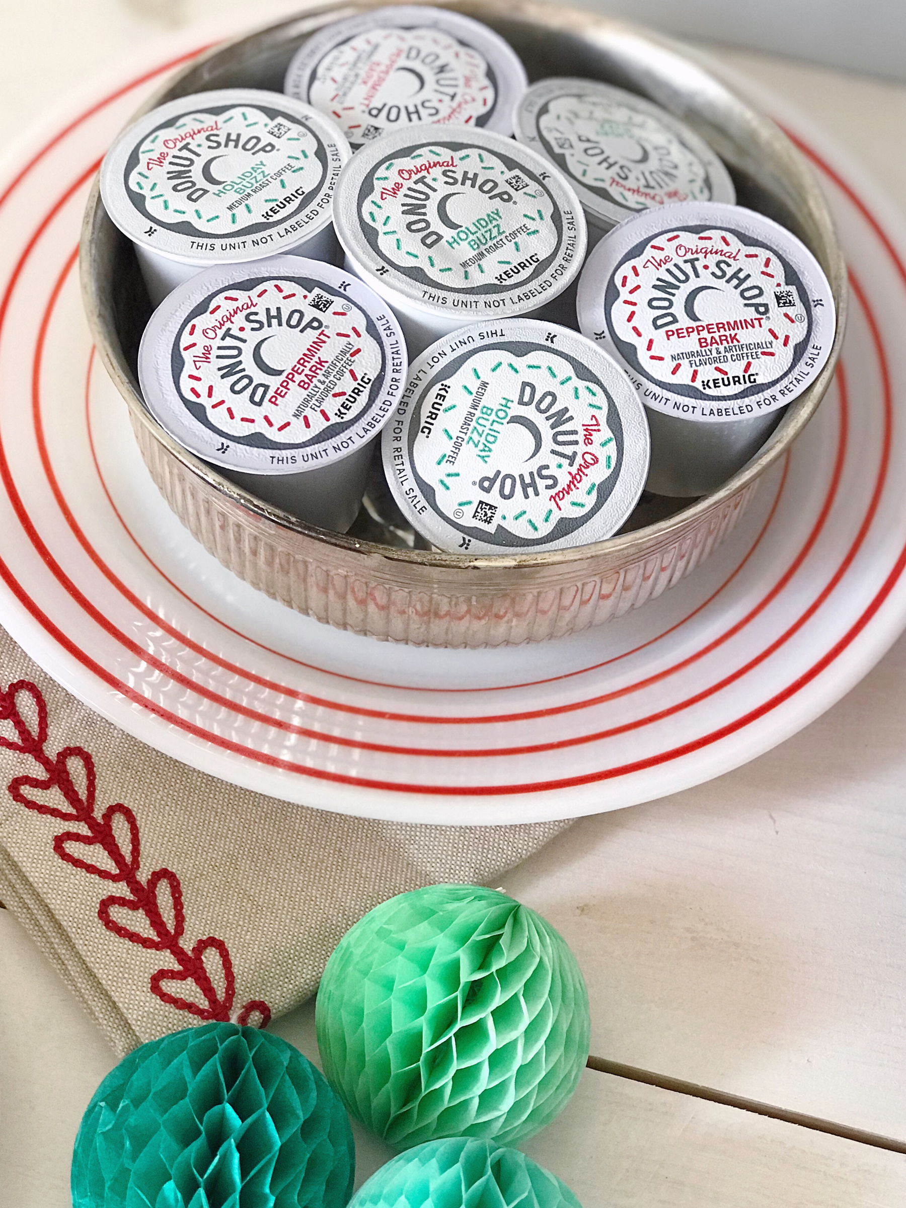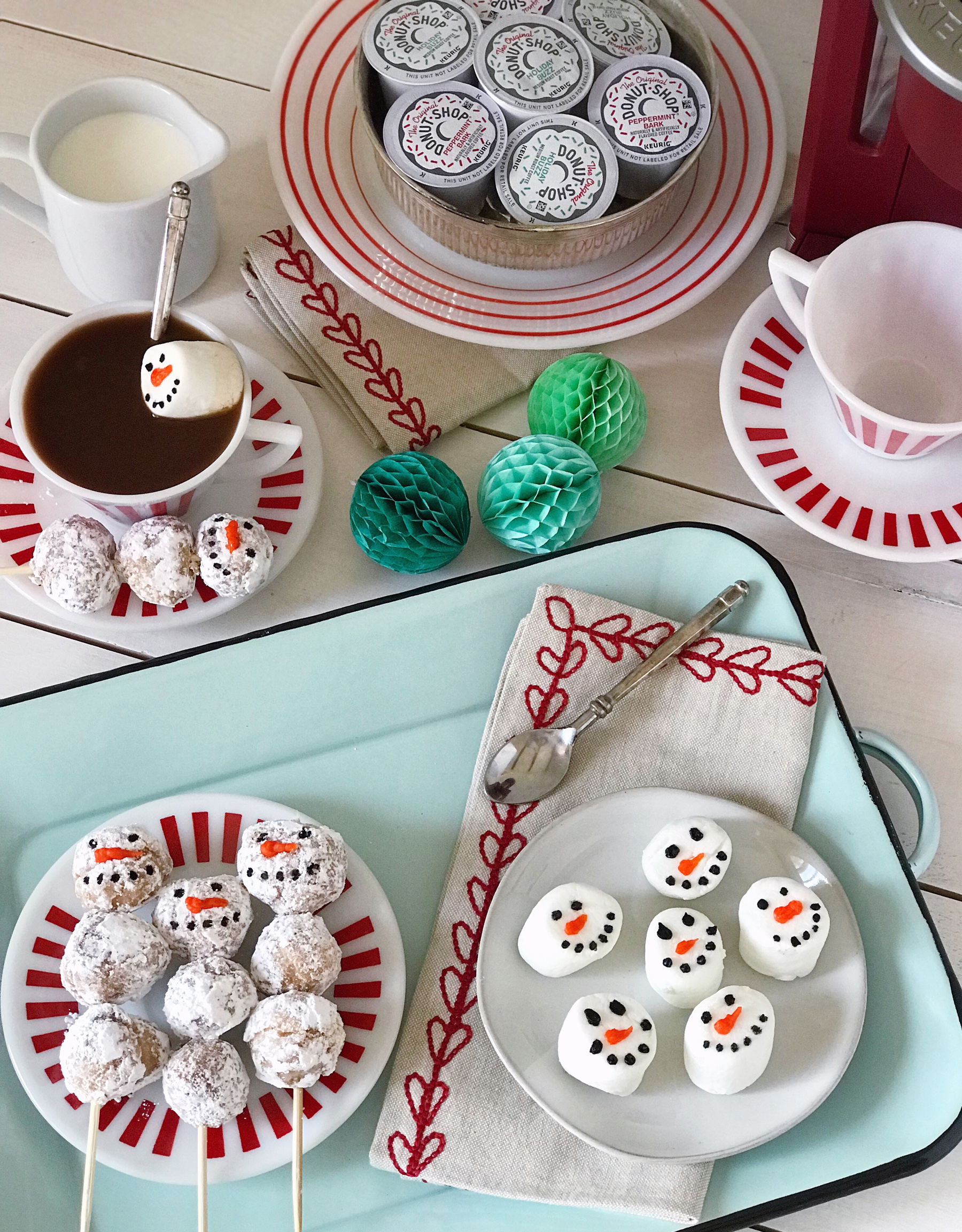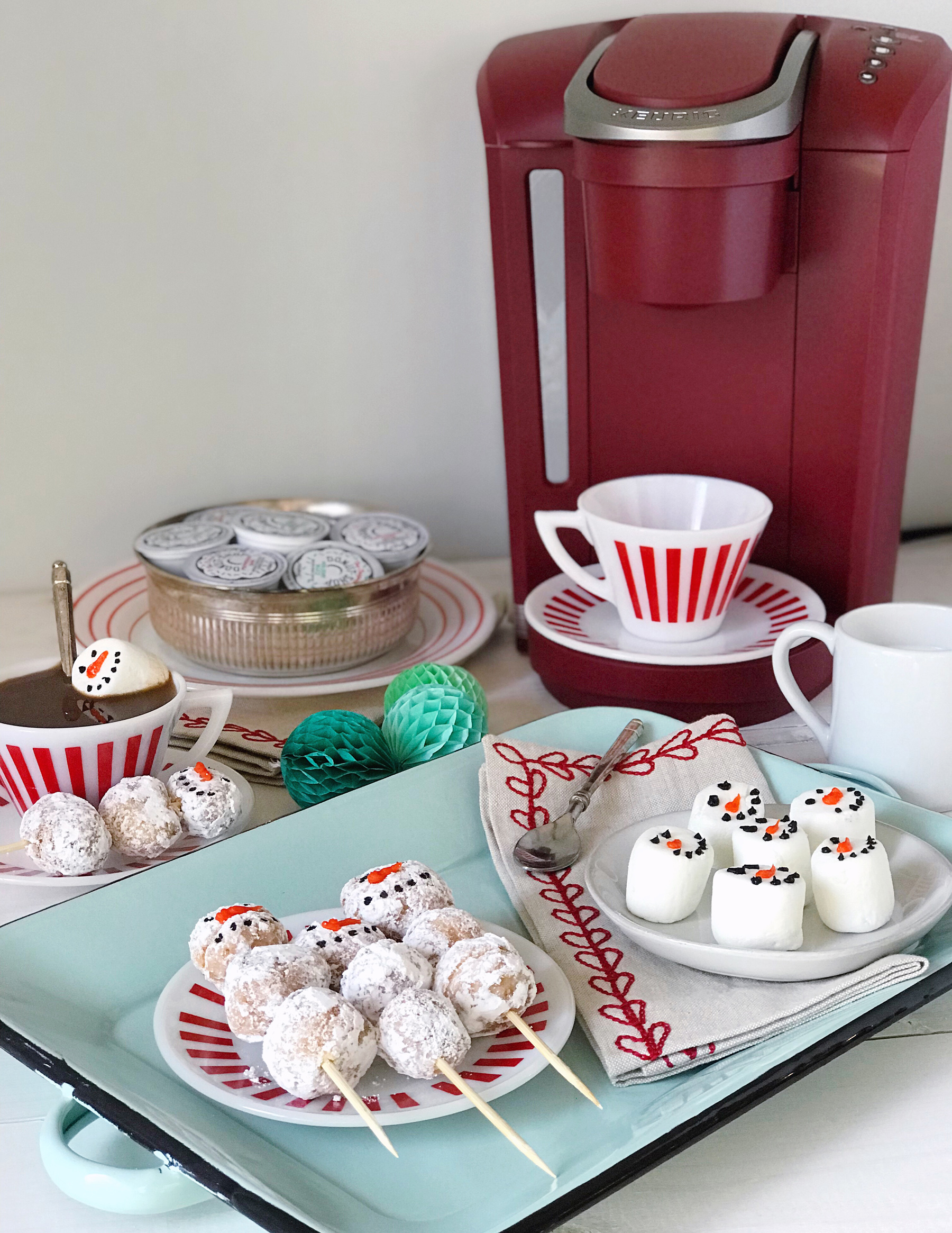 The days have gotten shorter, the wreaths and lights are going up around the neighborhood, and this week I finally broke down and pulled out our basket of hats and mittens for the cold weather; it feels like winter! In the summer we have tons of friends and family visit us — living by the beach lures them in! When we have friends and family stay for the weekend this time of year though, I find that we spend a lot more time cozied up inside our house enjoying slow mornings full of brunch and pajamas and lounging on the couch. Given that we spend a bit more time at home during these chilly holiday weekends, I’ve been brainstorming fun ways to make our mornings with houseguests a bit more special.Putting out a help-yourself style coffee bar is one of my favorite ways to make my family feel welcome when they stay over. To dress up my Keurig® coffee station for the holidays (and maybe even a few cozy snow days) I gave it a winter-inspired update. I started with some seasonally flavored brews like The Original Donut Shop® Peppermint Bark coffee and Holiday Buzz® coffee K-Cup® pods. I love the labels on these, so festive (you could pair them with the new Keurig® K-Select™ coffee maker for a really nice holiday gift!). Guests can pick their favorite beverage varieties and then select their coffee strength using the Strong button to personalize their own drinks. I also pulled out a set of my vintage red and white coffee cups and saucers; I love getting to use these this time of year!Alongside the coffee station, I made some winter-inspired sweet treats to go along with our drinks. Coffee and donuts go together like peanut butter and jelly, so I picked up a box of store-bought powdered donut holes for the coffee station. I took three donut holes and threaded them on bamboo skewers, and added little snowman faces to the top donut with icing. Black icing for the coal eyes and mouth, and of course a bit of orange icing for the carrot nose! I used the same icing trick on a bag of jumbo marshmallows to serve on a plate with the warm drinks; I love this idea for serving with hot cocoa on a snow day, too. All that’s left to do is to build a fire, brew our coffee, and snack on some sweet and snowy treats when our family arrives!
