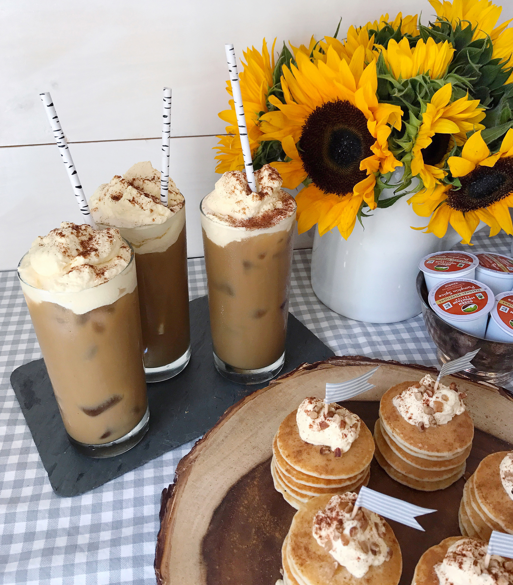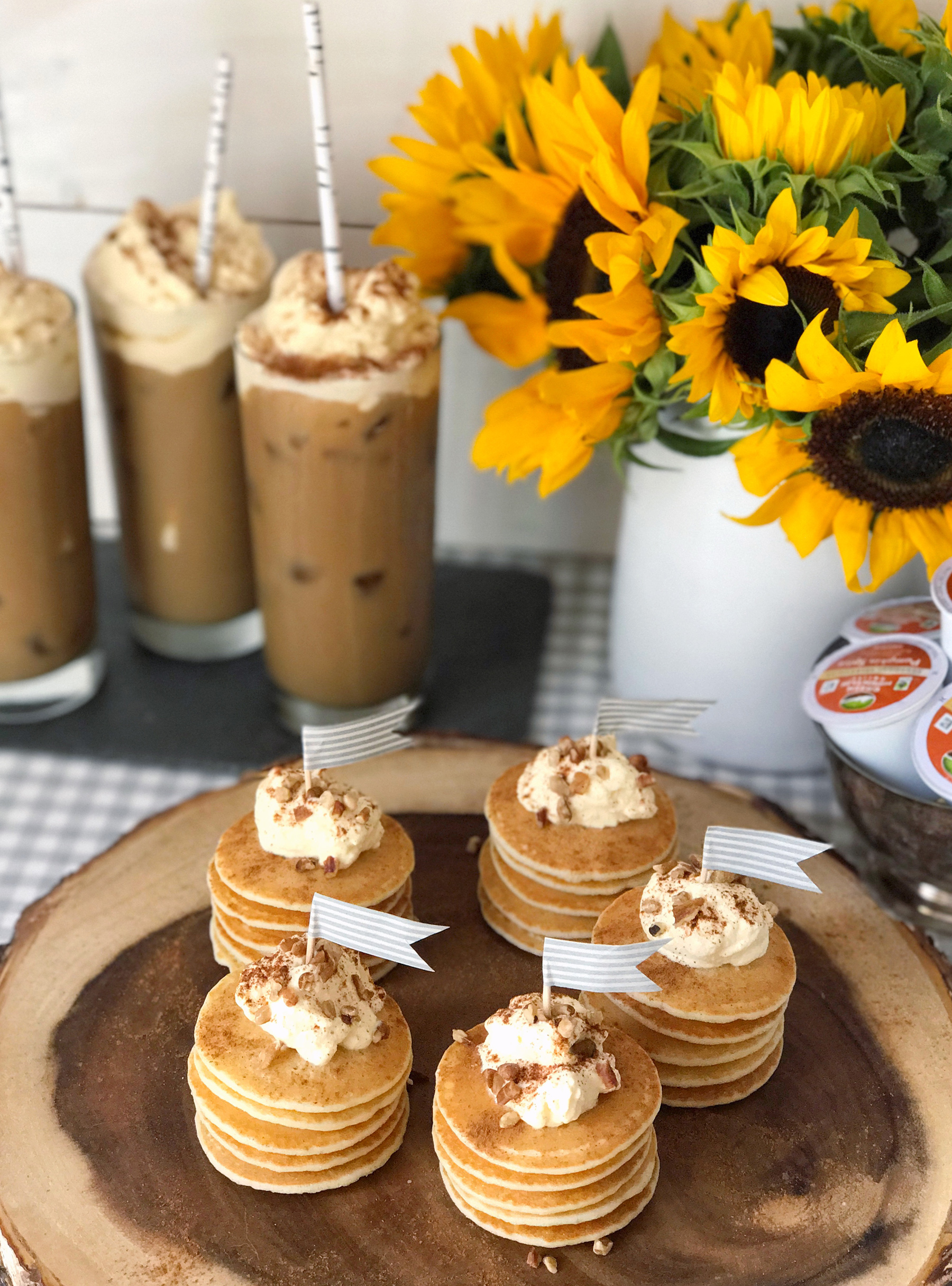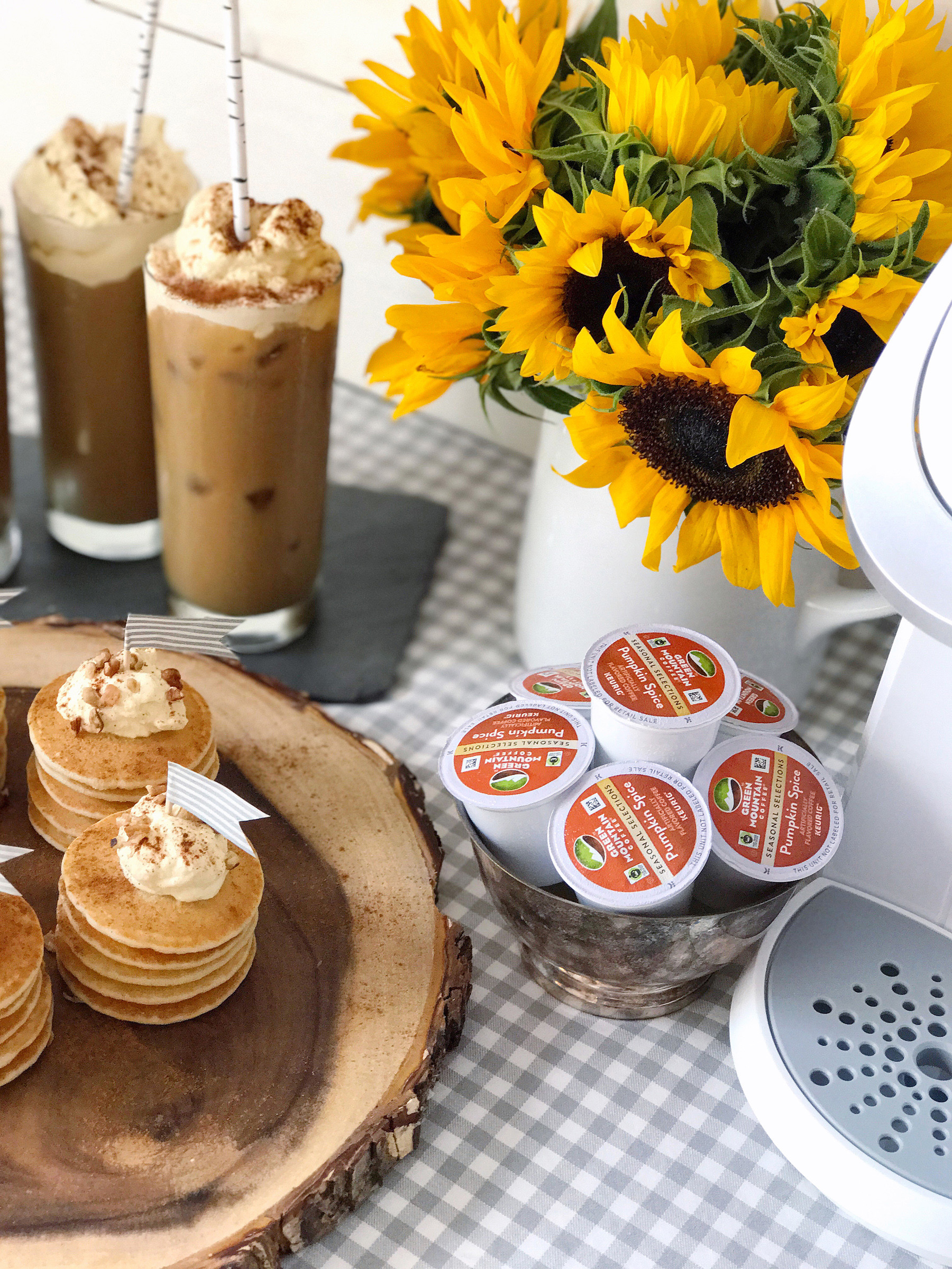 Alright, folks. I’m going to say something controversial: I’m really excited for fall this year. I know, I know, we still have a few weeks of warm summer weather to enjoy and I shouldn’t wish it away. But as soon as I walk into a big box store and see those aisles of fresh school supplies and plaid scarves and cozy sweaters I get so thrilled. Not to mention those fall flavors that are popping up on shelves too, tis the season for pumpkin spice after all!If you’re a summer fan though, don’t worry. I read that meteorologists are predicting an unseasonably warm fall. I’ve got the perfect solution to make fans of both seasons happy: you can have your pumpkin spice and your iced drinks too! I have a few fun ideas for adding the pumpkin spice flavor to an easy, and festive weekend brunch display even when the weather is still warm.Let’s start with the iced pumpkin spice coffee: I made a few cups of this essential fall flavored drink with my Keurig® K250 Coffee Maker and Green Mountain Coffee® Pumpkin Spice Coffee K-Cup pods. If you’ve got time, place the coffee in a pitcher and chill it in the fridge before serving. If you want to serve it immediately from the Keurig® K250 Coffee Maker, consider making a batch of Green Mountain Coffee® Pumpkin Spice Coffee the night before and freezing it in ice cub trays. When you want to cool down the warmer coffee quickly, simply pour it over the pumpkin spice ice cubes so that you keep the delicious flavoring and don’t water down your drink. It’s a quick little trick that will impress your guests and make for some extra delicious Green Mountain Coffee® Pumpkin Spice flavored drinks.To add a bit more of that pumpkin spice flavor to the mix, I topped each iced coffee with a dollop of pumpkin-spice whipped cream. Whipped cream is one of the easiest things to make, and you can alter the flavor with a few tiny mix-ins to enhance your coffee drinks. In this batch, I combined one cup of heavy whipping cream with one tablespoon of confectioners sugar, two tablespoons of pumpkin puree, and a few dashes of cinnamon and nutmeg. Use a hand mixer to blend it all together until soft peaks form, and use it to top off your Green Mountain Coffee® Pumpkin Spice iced coffee drink.Since I made that tasty pumpkin-spice flavored whipped cream, I used it to add the same seasonal flavors to a simple stack of mini-pancakes for an easy brunch-time snack. These stacks of mini-pancakes are a favorite entertaining trick of mine: you can find small frozen pancakes in the freezer section of your grocery store. Heat them up before guests arrive and display them on a tray stacked up high with a scoop of the pumpkin spice whipped cream, a dash of extra cinnamon, and chopped nuts for extra flavor and texture. A cute little toothpick flag holds the stacks in place and makes for a festive bite-sized brunch addition.So tell me, are you ready for fall? Or are you hanging onto your iced coffee and sunshine filled days of summer?