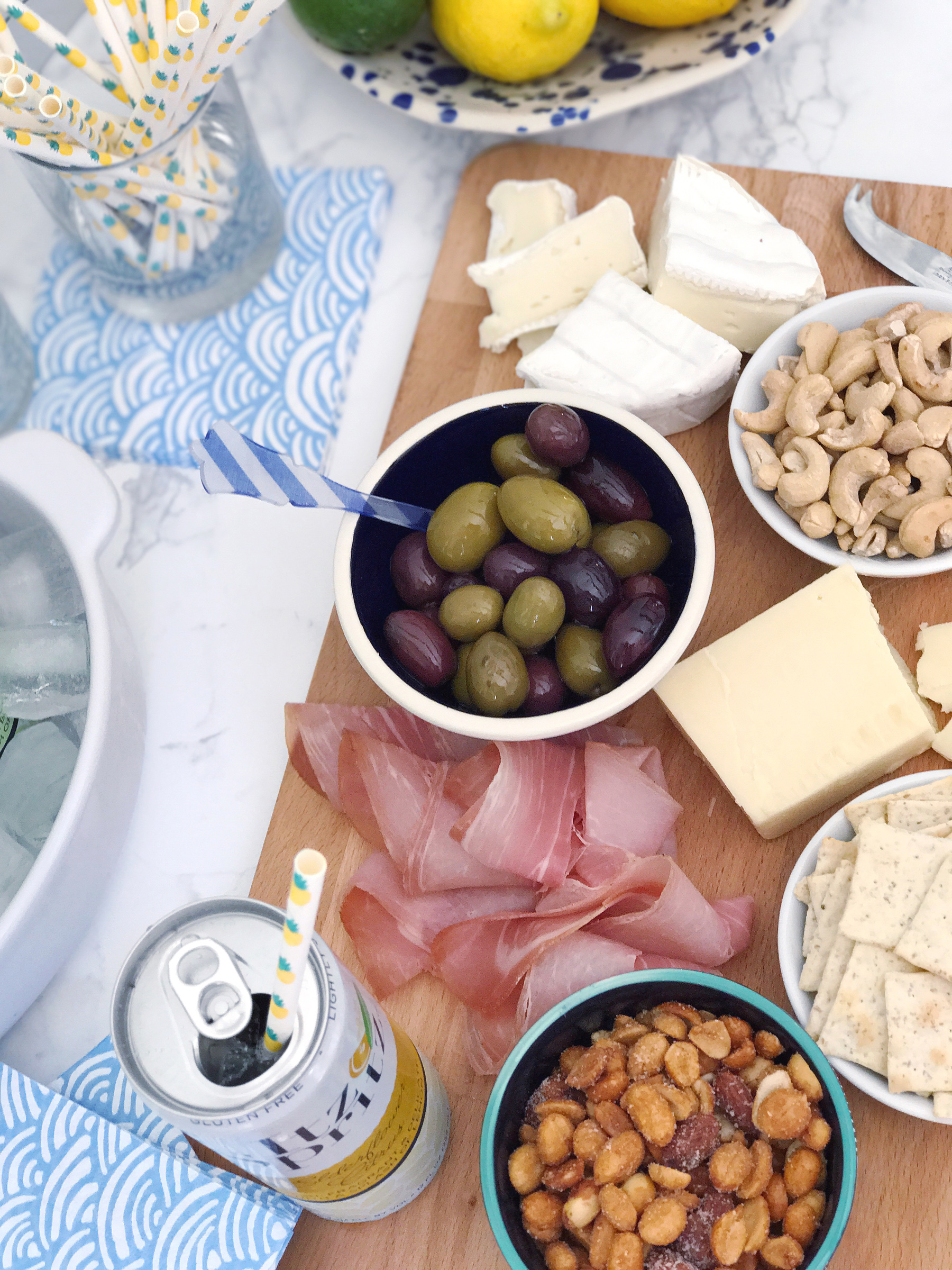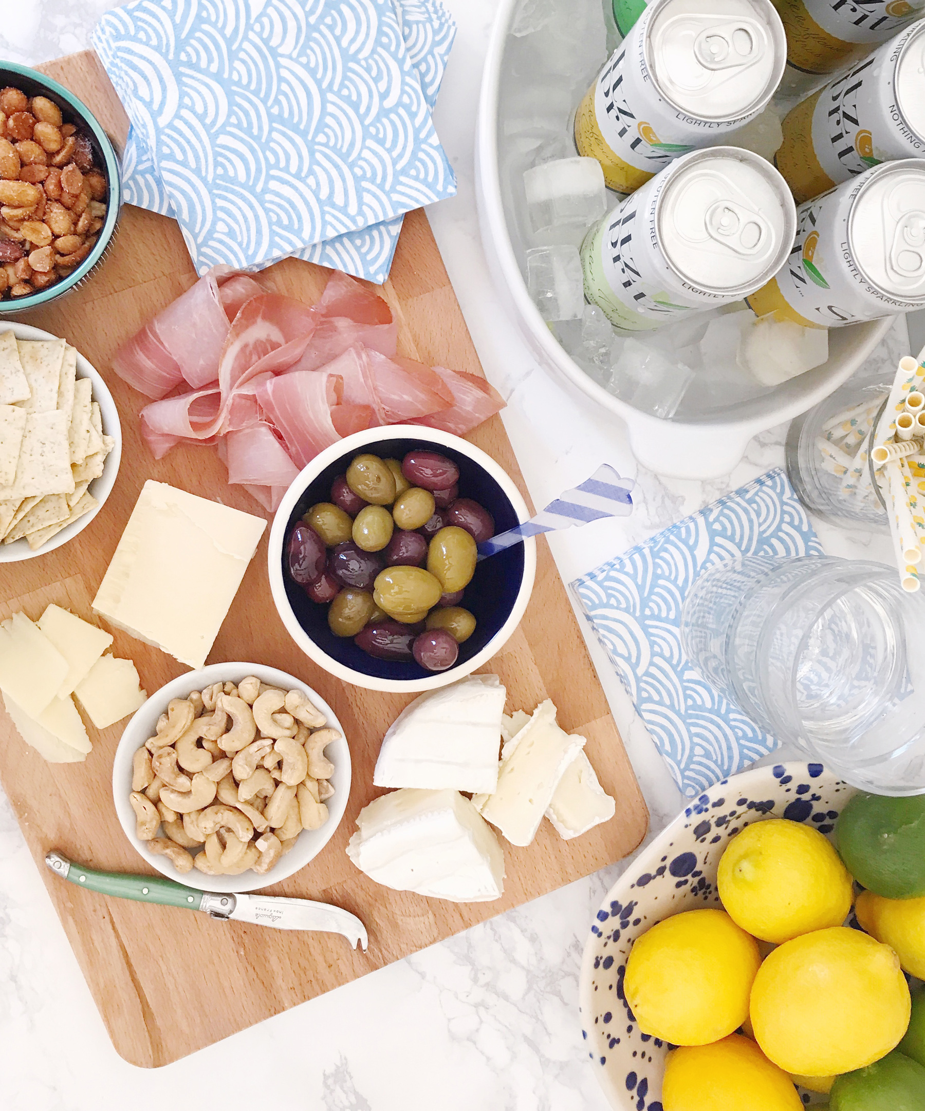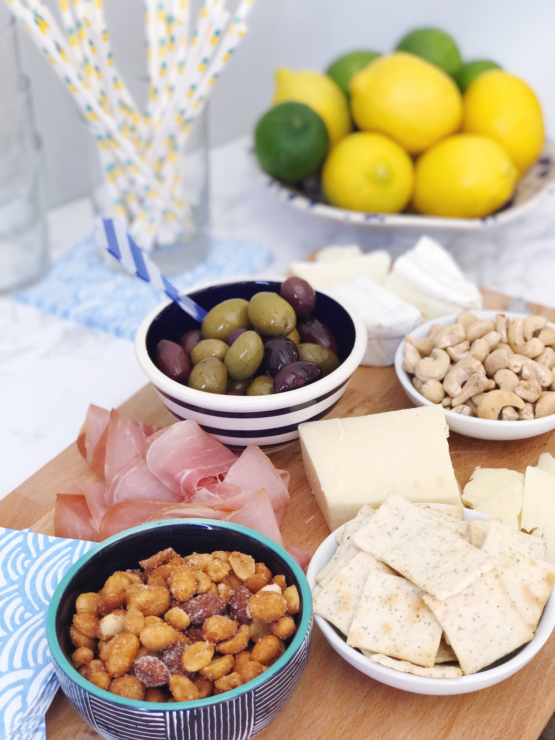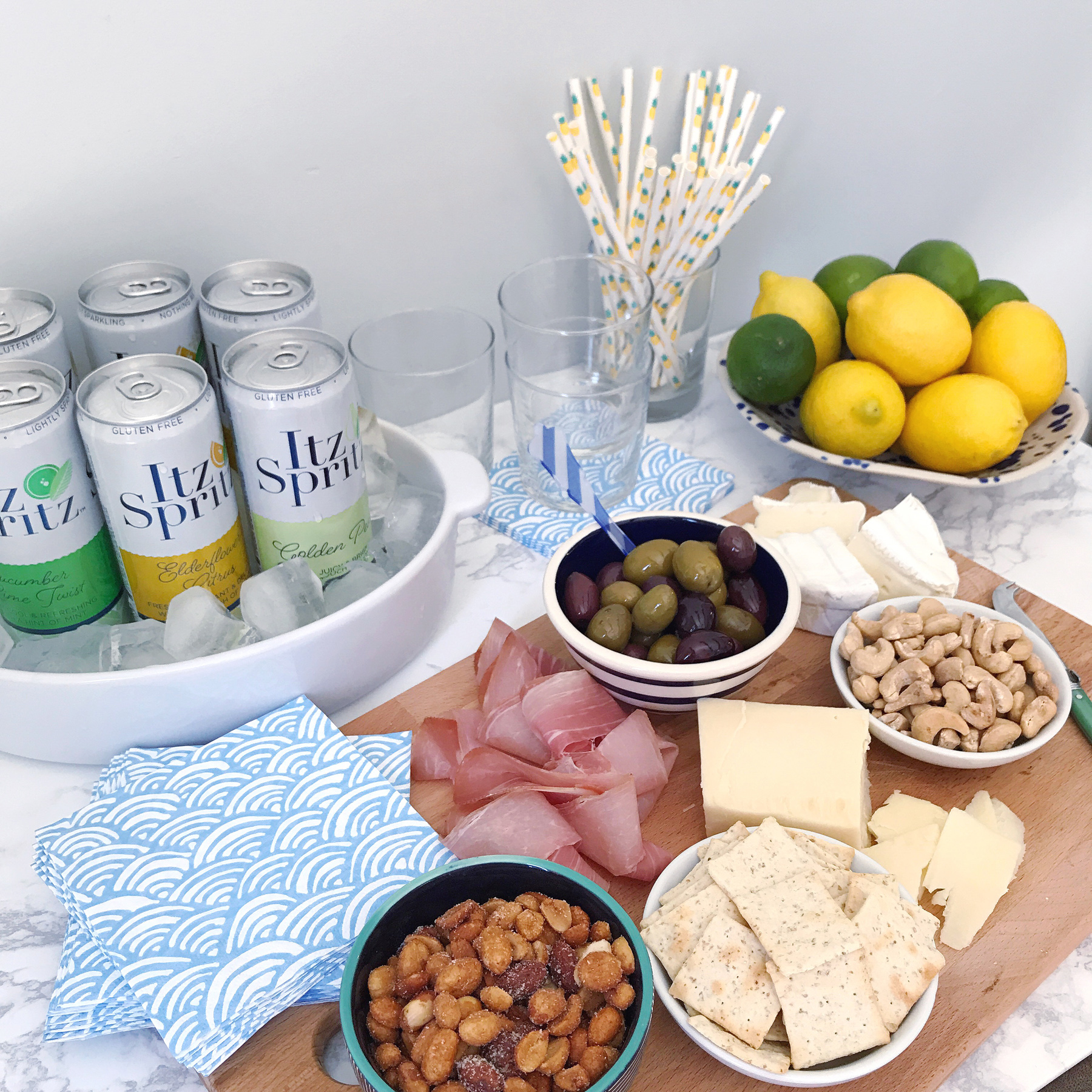 Simple Drinks. I keep several bottles of sparkling water on the shelves in our kitchen – they’re super cute décor and make for a universally appealing non-alcoholic drink to offer guests. Most weeks in the summer I keep a bowl of citrus on the counter and can squeeze some fresh juice into the glasses. A stocked bar cart is a luxury to have, but for last-minute entertaining I don’t want to spend a ton of time scheming up cocktails. Keeping some chilled drinks like Itz Spritz alcoholic-spritzers in the fridge are a perfect solution though! Anytime you can cut down on prep-work and cut right to serving and chatting with your guests is a good choice in my book. I just pour them over ice and pop in a festive paper straw and they’re ready to serve (plus they have really tasty, unique flavors: cucumber lime twist, golden pear, and my favorite the elderflower citrus, yes please!). Pantry Party Supplies. I have a borderline insane addiction to collecting party supplies, so I’m always prepared with seasonal cocktail napkins and festive straws to match my drinks and appetizers. If you don’t collect party supplies like I do, a nice set of linen cocktail napkins on your bar is a great evergreen solution that you can use year round. We also have a ton of specialty glassware for every type of cocktail you can imagine, but some simple, versatile low tumblers are my favorite glassware to rely on for casual entertaining – they’re always clean in our glassware cabinet for quick access!For last minute entertaining, it’s all about keeping things easy, casual, and welcoming. Do you have any pantry-staples you lean on for surprise guests? Share them with me in the comments!