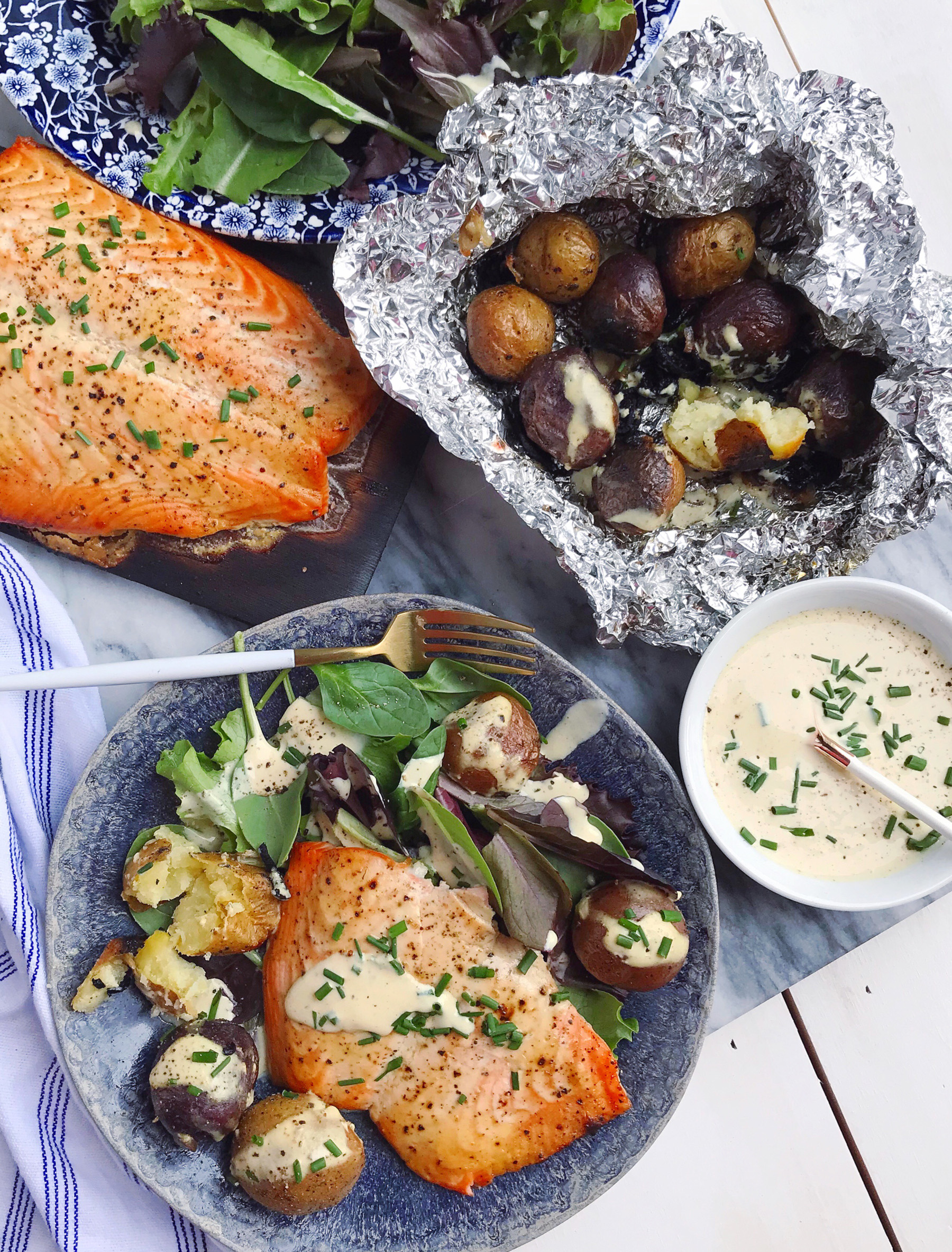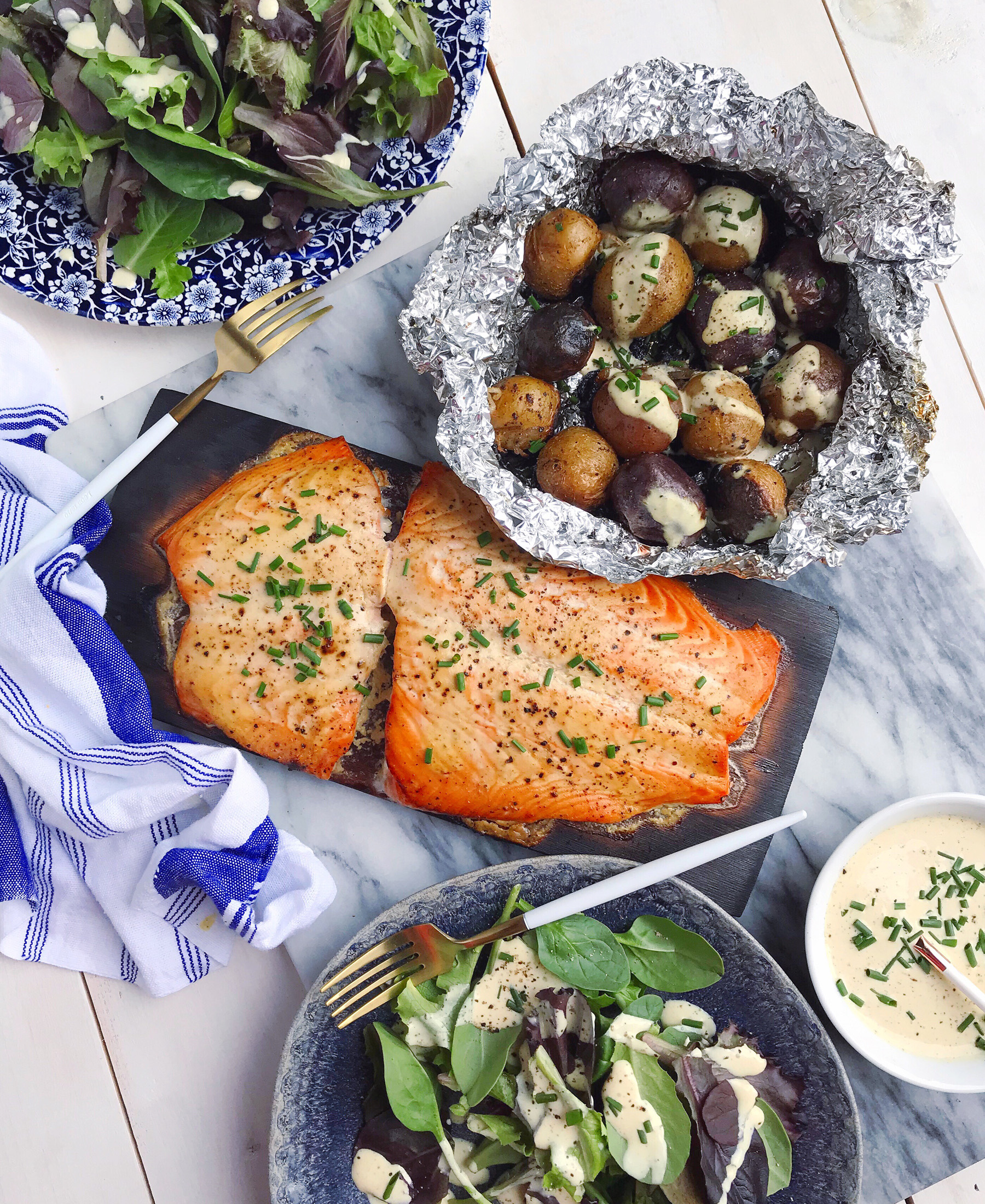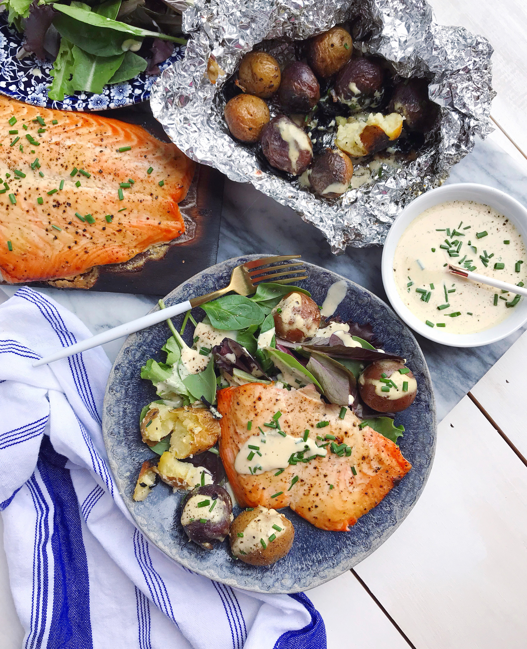 As soon as the weather turns warm, we are on an all-grilling-all-the-time dinner kick! I’ve been making grilled chicken, charring up steaks, skewering shrimp, and kabob-ing just about every vegetable under the sun for the past few weeks. After all of these delicious grilled meals, I’ve been thinking of ways to push myself outside my comfort zone and experiment with some new dishes that are packed with flavor from this cooking method. Every time I pass the fish counter at my grocery store, I notice a display of cedar planks and finally decided to give them a try with this new dish: cedar grilled salmon and potatoes with creamy lemon Dijon.