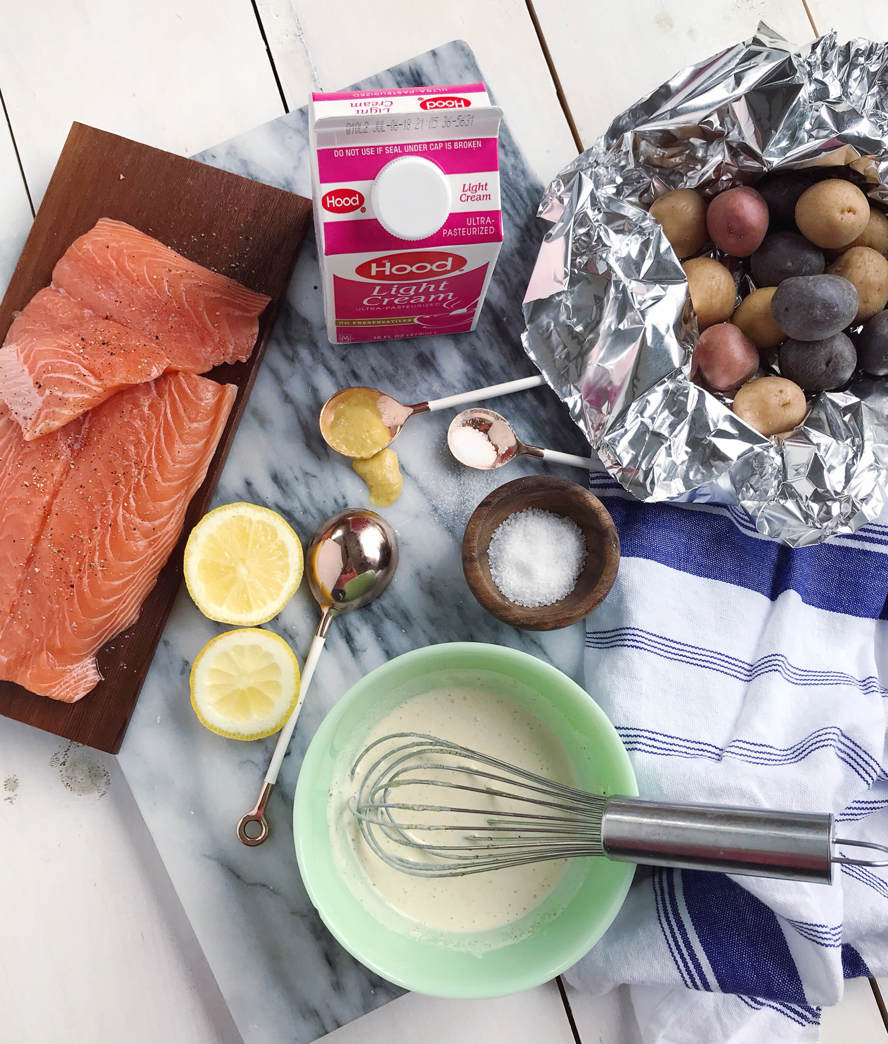 I think the key to this dish, and why I’ll be making it again often, is the sauce! I made one sauce – a creamy lemon Dijon vinaigrette – out of a few simple ingredients like Hood Light Cream, a good Dijon mustard, fresh lemon juice, and some red vinegar. Then I used that sauce throughout the meal to tie all of the elements together – it marinated the salmon, dressed the salad, and is drizzled on top of the crispy new potatoes. The Hood Light Cream gives the sauce the creamy, smooth texture, and the tart citrus of the lemon juice balances out the bold taste of the Dijon mustard. It also has lots of cracked black pepper in it, and a bit of sugar to balance all of the flavor notes.