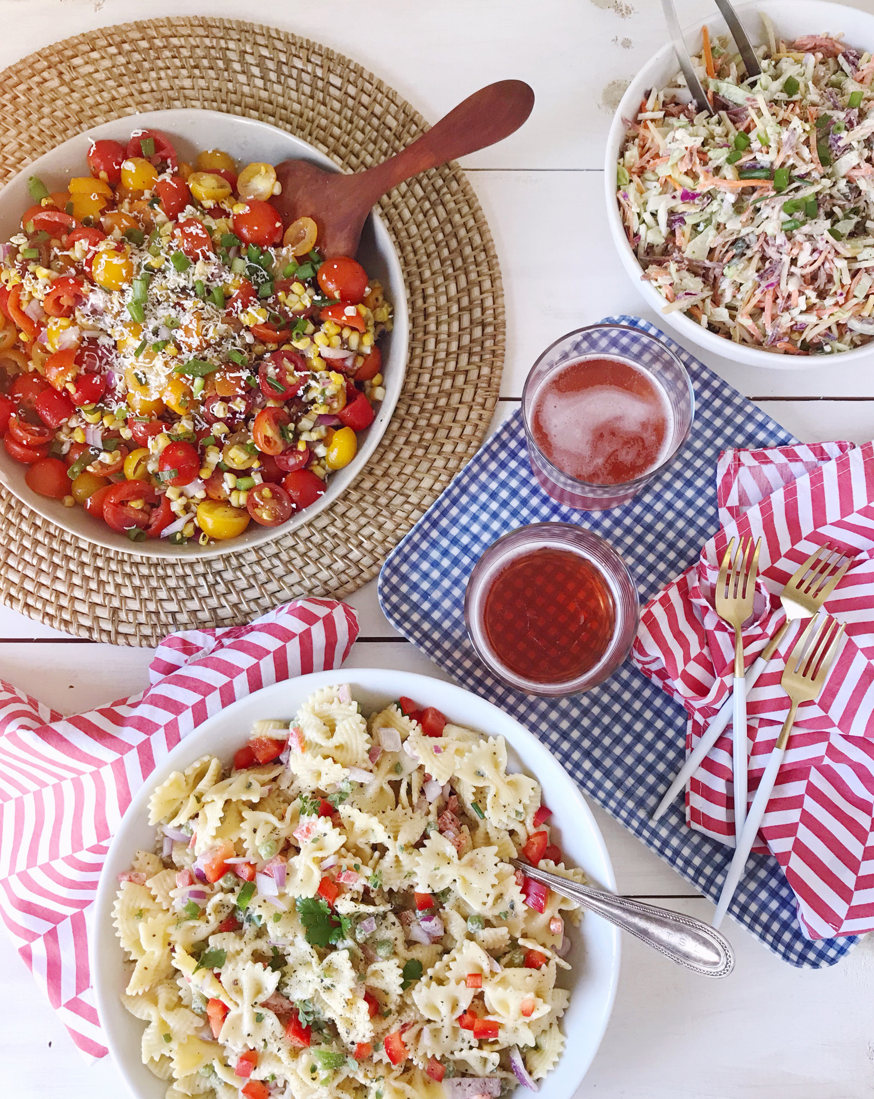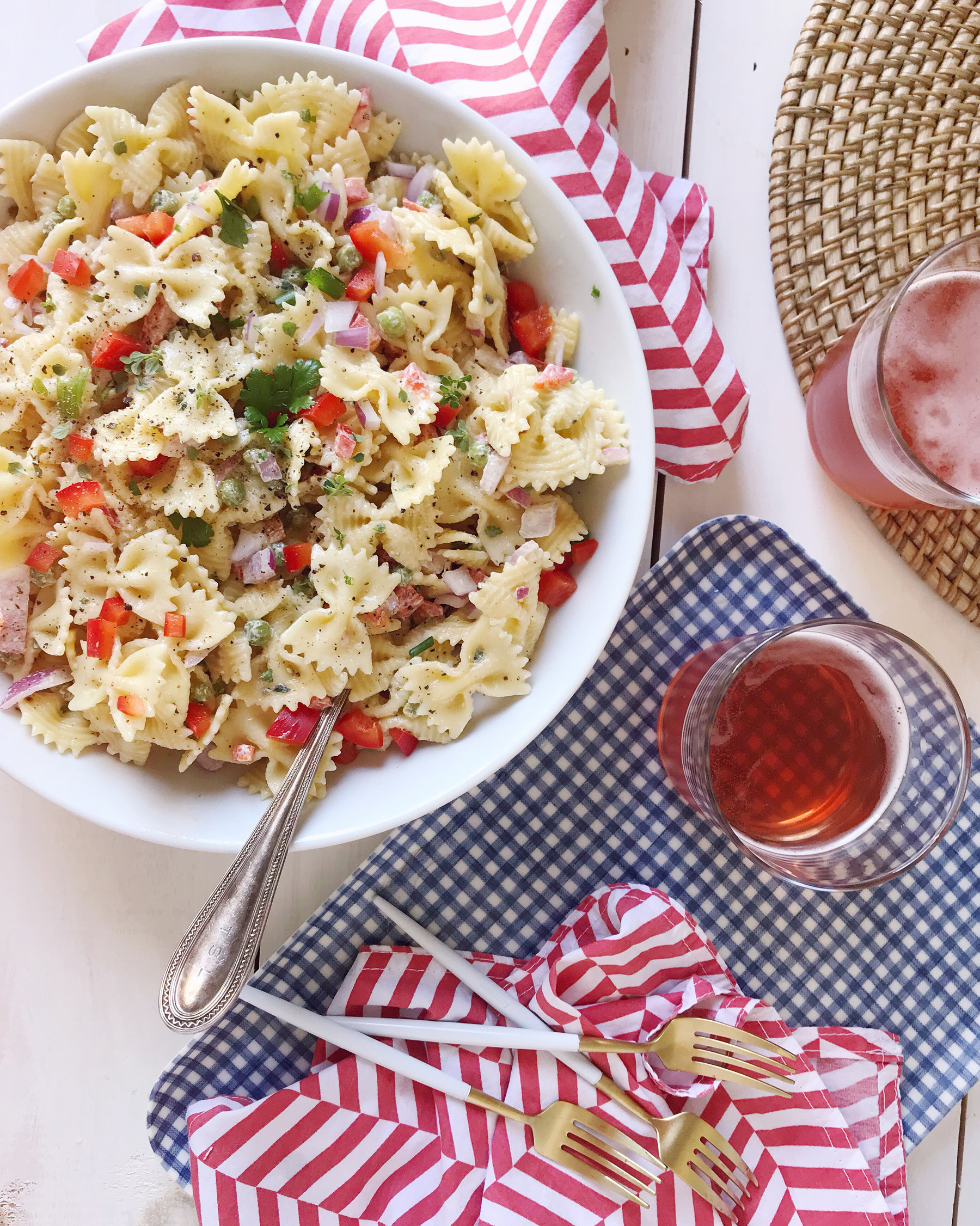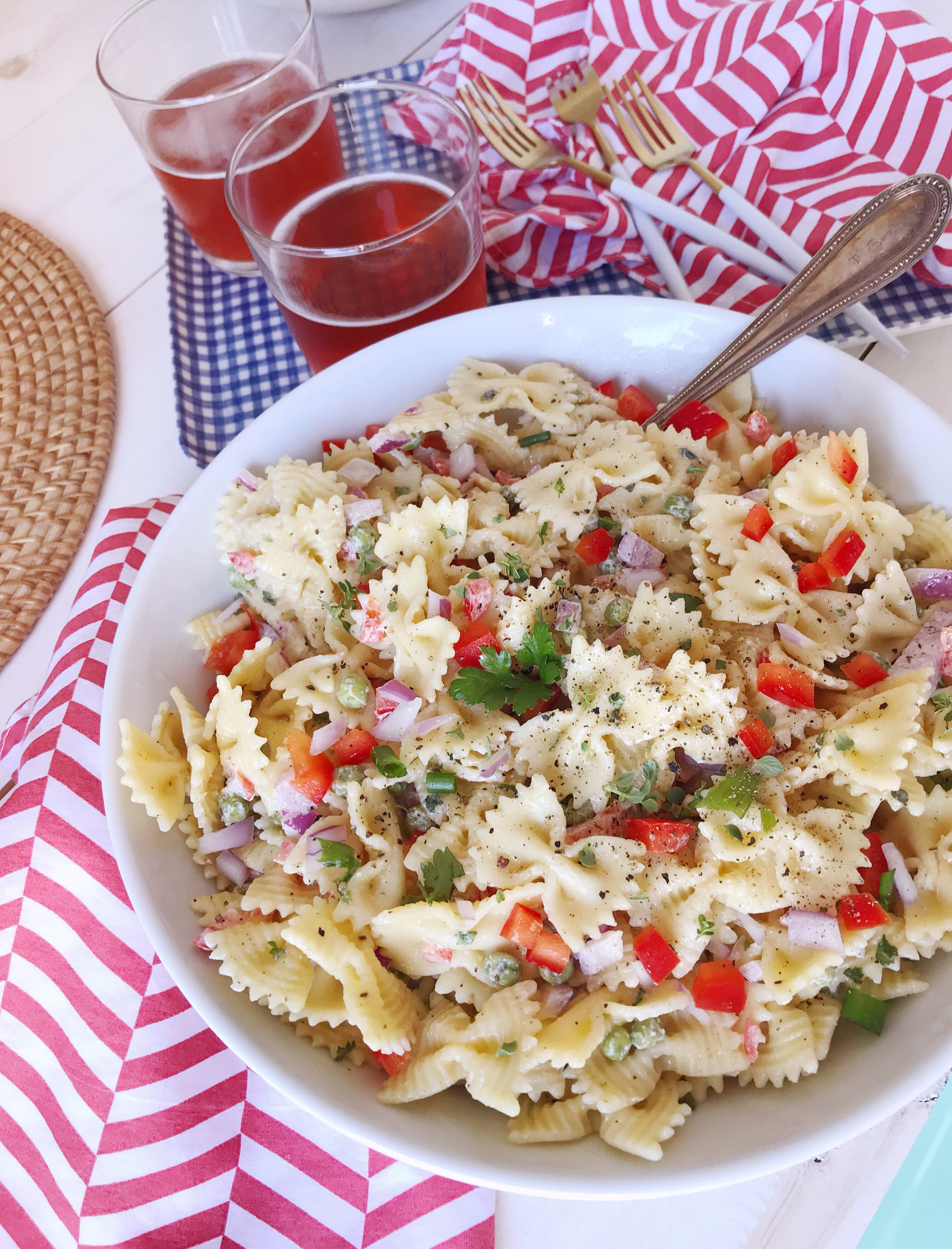 We have been on a non-stop BBQ menu rotation the past few weeks between the Fourth of July celebrations, hosting a friend’s bridal shower, and my husband’s newfound hobby: cooking in his new Kamado-style smoker. There are zero complaints over here, I love all of the outdoor cooking and dining. I have found though, that my usual BBQ-side repertoire was getting a little bit stale. In an effort to mix it up, I decided to give a fresh spin to one of my favorite BBQ side — macaroni salad. I love a classic macaroni salad but have been looking for something a bit more grown-up and a tad bit lighter for these warm weather al fresco dinners. This version has a lemon-herb dressing that I made with tons of fresh herbs from the garden and bright citrus combined with Dijon and mayonnaise. For color and crunch I mixed in red peppers and red onions, and loads of cracked black pepper and peas. I’m definitely going to be adding this one to future BBQ menus! Get the recipe below: