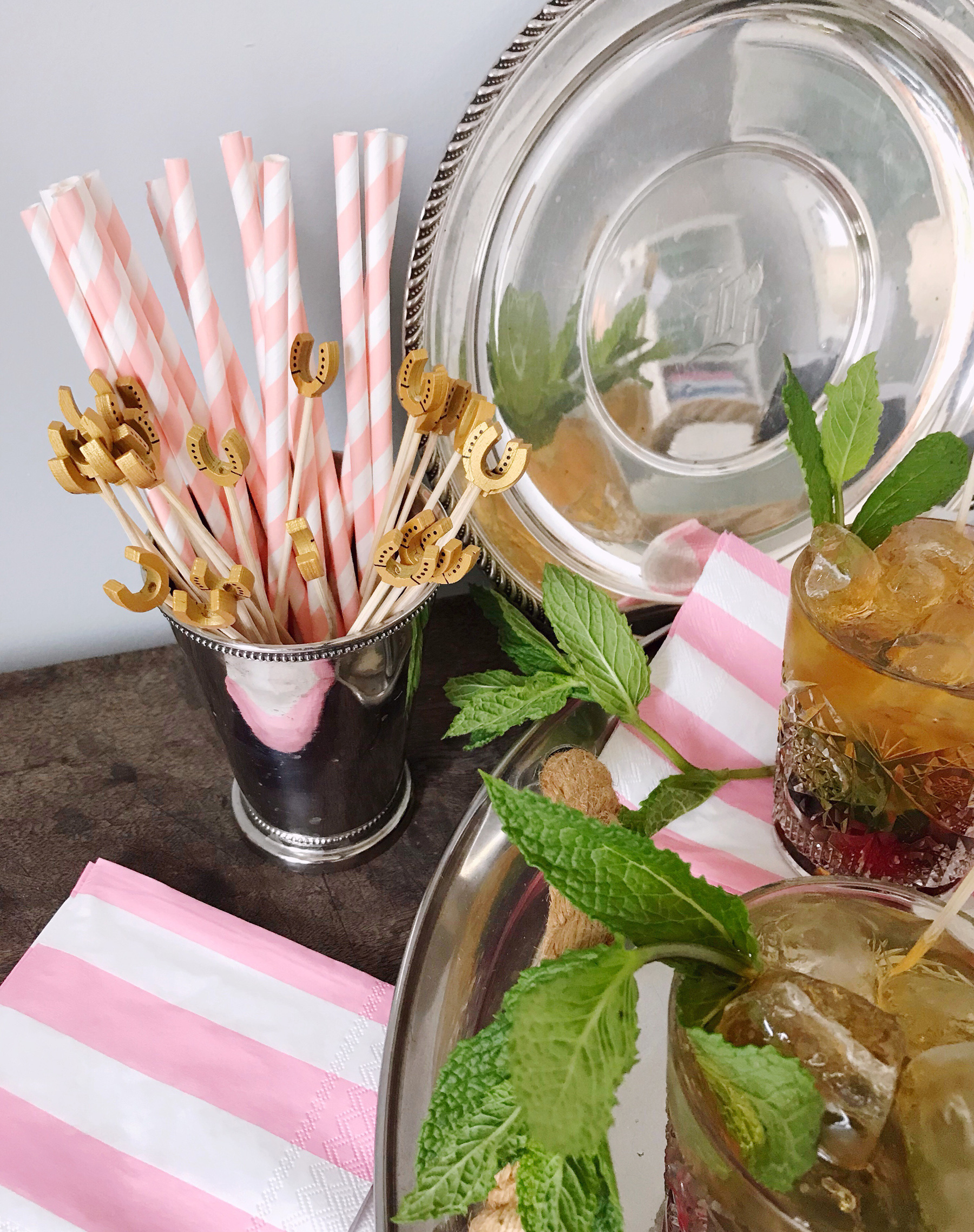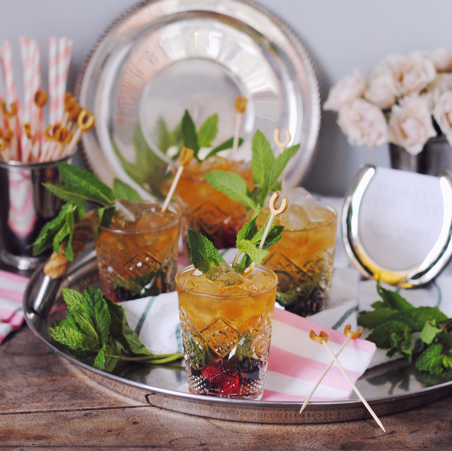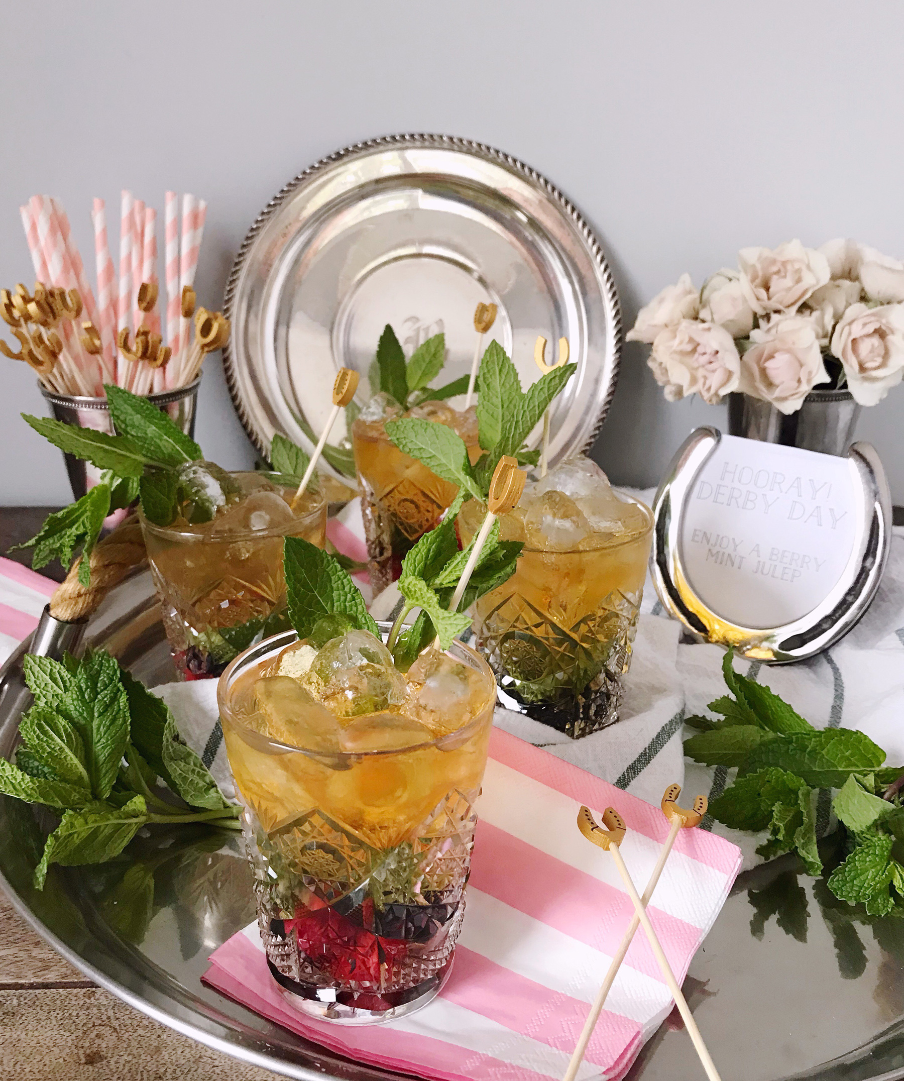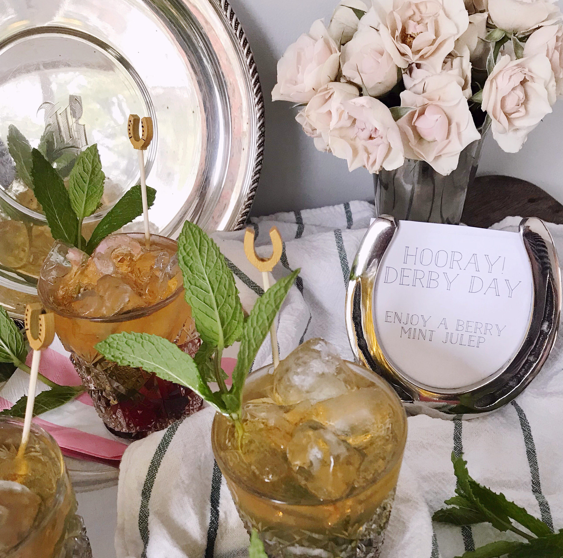 Can we all agree on one thing? The absolute best reason to watch the Kentucky Derby is so that you can have an solid reason to mix up an ice cold mint julep! I realized this week that the derby is coming up in a few weeks, and decided to try my hand at mixing up a berry-muddled version of this classic cocktail. The most delicious mint julep I’ve ever tasted was made at the Greenbrier Resort in West Virginia — the drink was brimming with crushed ice, fresh mint leaves, and a pretty dusting of powdered sugar — YUM! I gave the derby staple a slight spin with some muddled mixed berries in the bottom of vintage cut crystal glasses that my mother-in-law just passed down to me, and gave them some Kate-flair with horseshoe drink stirrers too! Scroll down for the full recipe.
