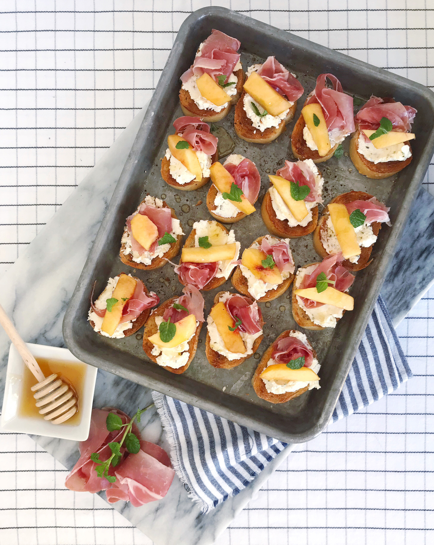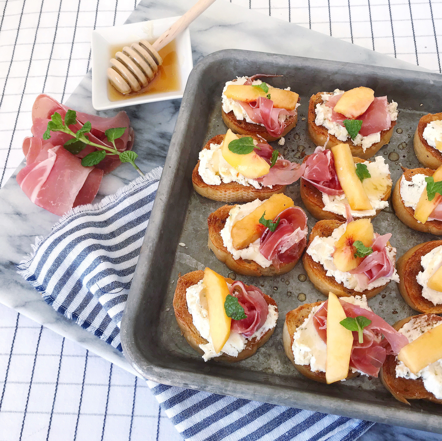 - Add a half a piece of prosciutto and a slice of peach to each toast, and then lightly drizzle with honey.