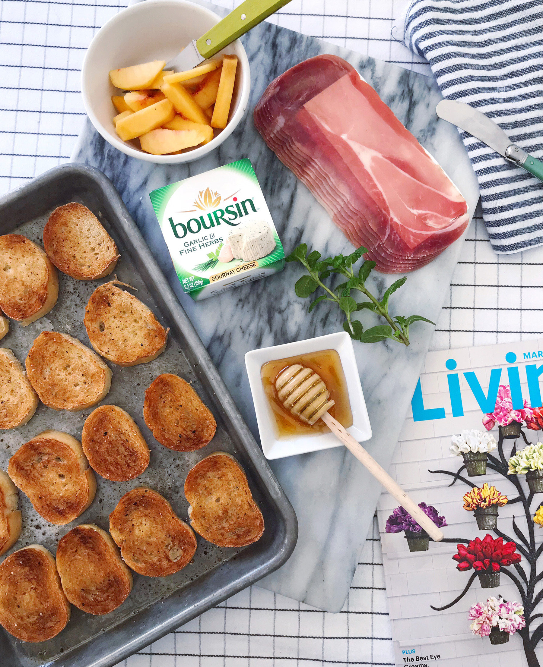 My tiny toast recipe came from balancing lots of sweet and salty flavors to balance the Garlic & Fine Herbs cheese, all while making sure there was lots of color to make the appetizer pop. To start, I toasted slices of a small baguette under the broiler; each toast was lightly drizzled with olive oil and cracked black pepper before heading into the oven. Then I spread the Garlic & Fine Herbs Boursin® Cheese onto the toasts while they were still a little bit warm. Each toast was topped with a thin slice of prosciutto and a small piece of a freshly sliced peach. I finished them off with a drizzle of good honey and some torn fresh mint leaves.