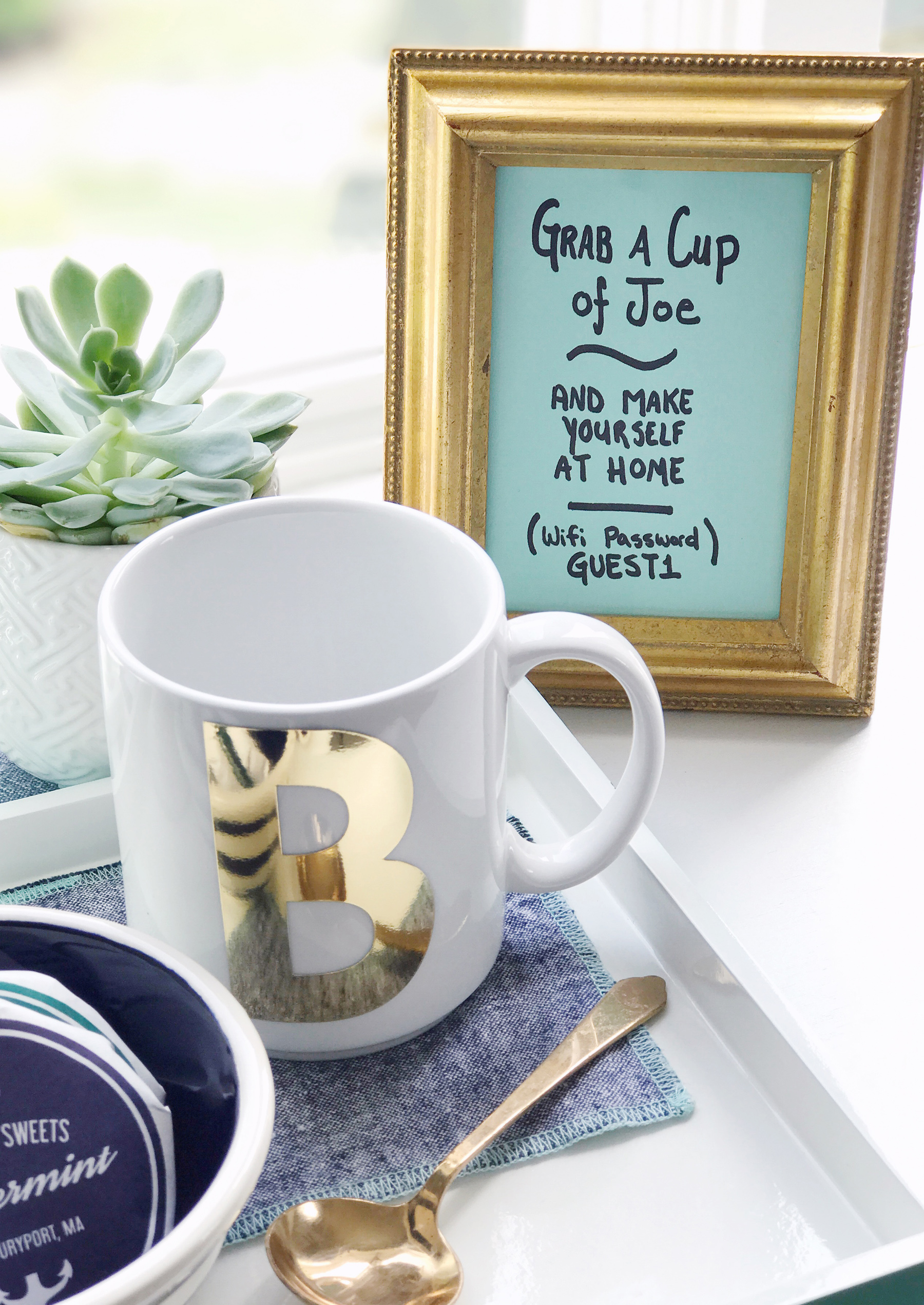 Set up a DIY coffee bar. I am a coffee addict (seriously, it’s bad) and brew some fresh the second I wake up in the morning. As a guest, I’d love to have a hot cup of coffee while I’m getting ready before coming downstairs to meet the rest of the crew. I picked out the most adorable Keurig® K250 Coffee Maker in “Oasis,” a minty-green color that is perfect for a quick cup of joe that guests can brew themselves. It’s fun to include some seasonal coffee options too, and Green Mountain Coffee® Summer Sunrise® Blend K-Cup® pods made it in my set-up for upcoming guests!