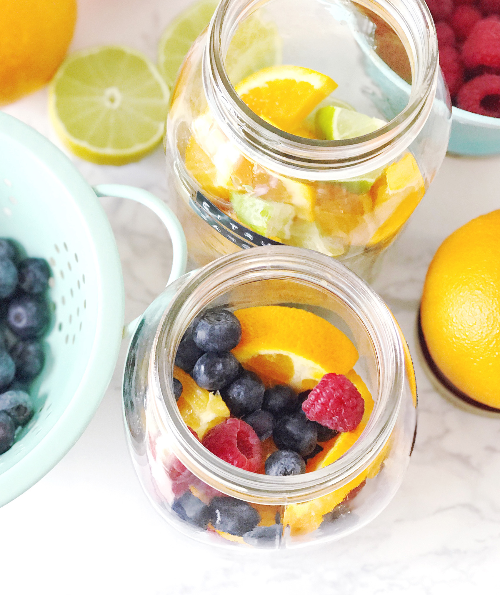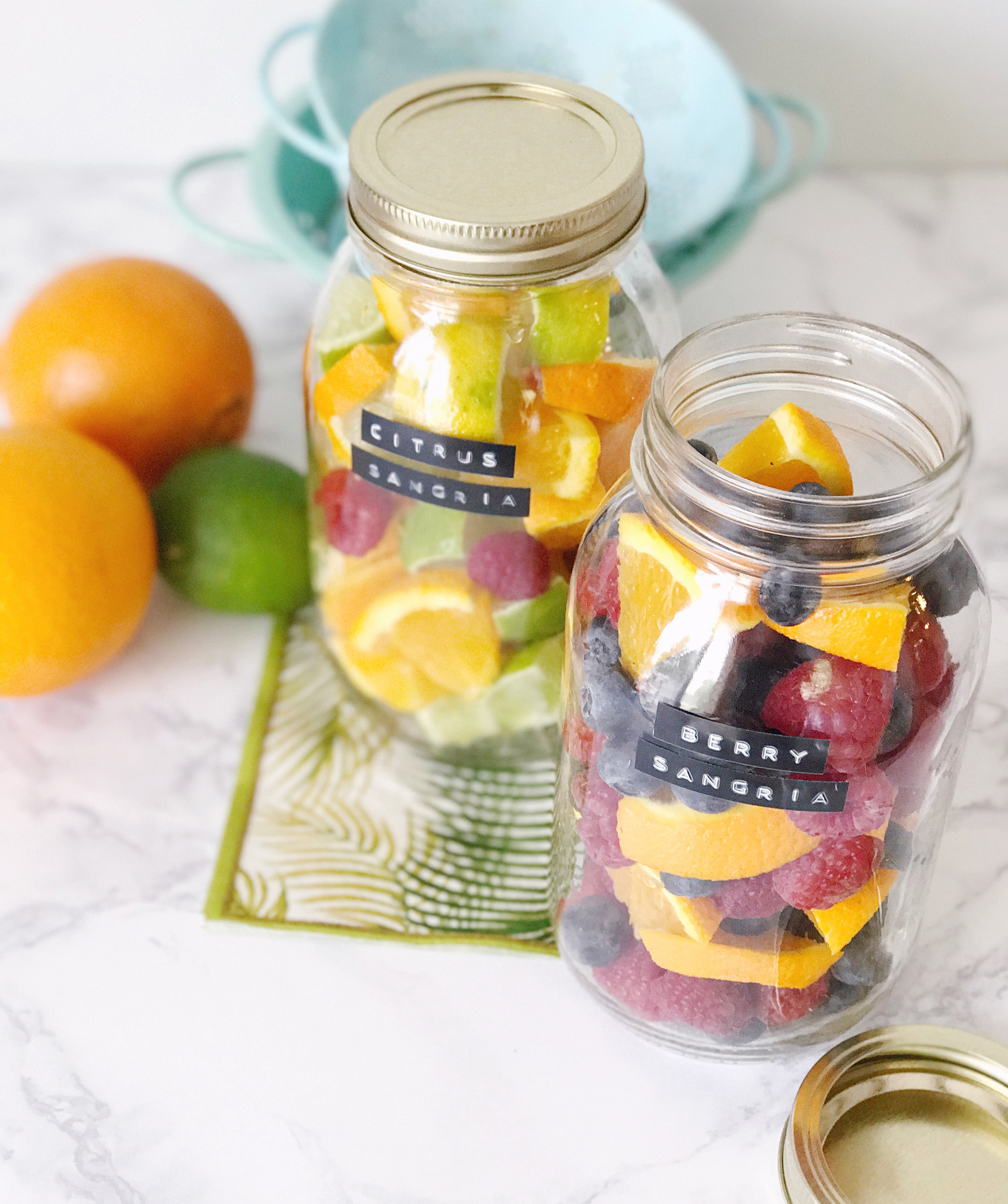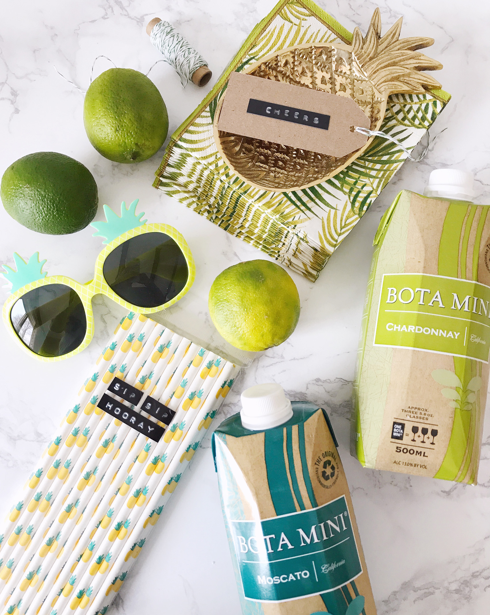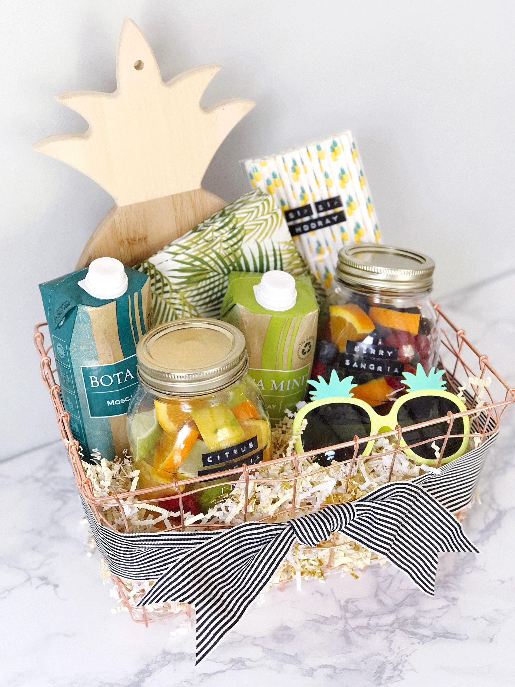 When I say hostess gift, what’s your go-to idea? I bet it’s wine! I love giving a bottle of wine when I get invited somewhere for dinner, or a bottle of bubbly for brunch. I was thinking recently about ways to jazz up this traditional hostess gift with something a bit more fun and unexpected. Warmer weather is right around the corner, and I love a glass of fruity, crisp white sangria. My DIY light bulb went off and I thought how fun it would be to make a sangria kit to bring along to parties.Making the sangria base is almost foolproof; I mixed and matched a few combinations of fruits in mason jars to create different sangria flavors. Orange slices, blueberries and raspberries in one, and a ton of different types of citrus in the other. Add a little bit of water and just a teaspoon of sugar into the jars before sealing them up to create a sweet simple syrup out of the fruits. I labeled each jar with some old-school black and white labels from my label maker too!For wines, I chose some Bota Mini flavors that can be mixed and matched with the fruit bases. I love these wines for their convenient (and colorful!) packaging — they’re 100% recyclable, how cool is that? They’re great quality wines to serve as a base for the sangria. Plus we love to bring cocktails to the beach in the summer for an evening happy hour or pizza night date and they’re a great alternative to bringing glass (and a corkscrew!) to the beach. They travel well, and look so cute in my sangria kit basket! To finish the kit off, I added in a few little extra festive details like party napkins, fun paper straws, a cutting board for adding in some extra fresh fruits. It all came together in a modern copper wire basket for a hostess gift that goes above and beyond! But it’s so darn cute and tasty, I just might keep this one for myself