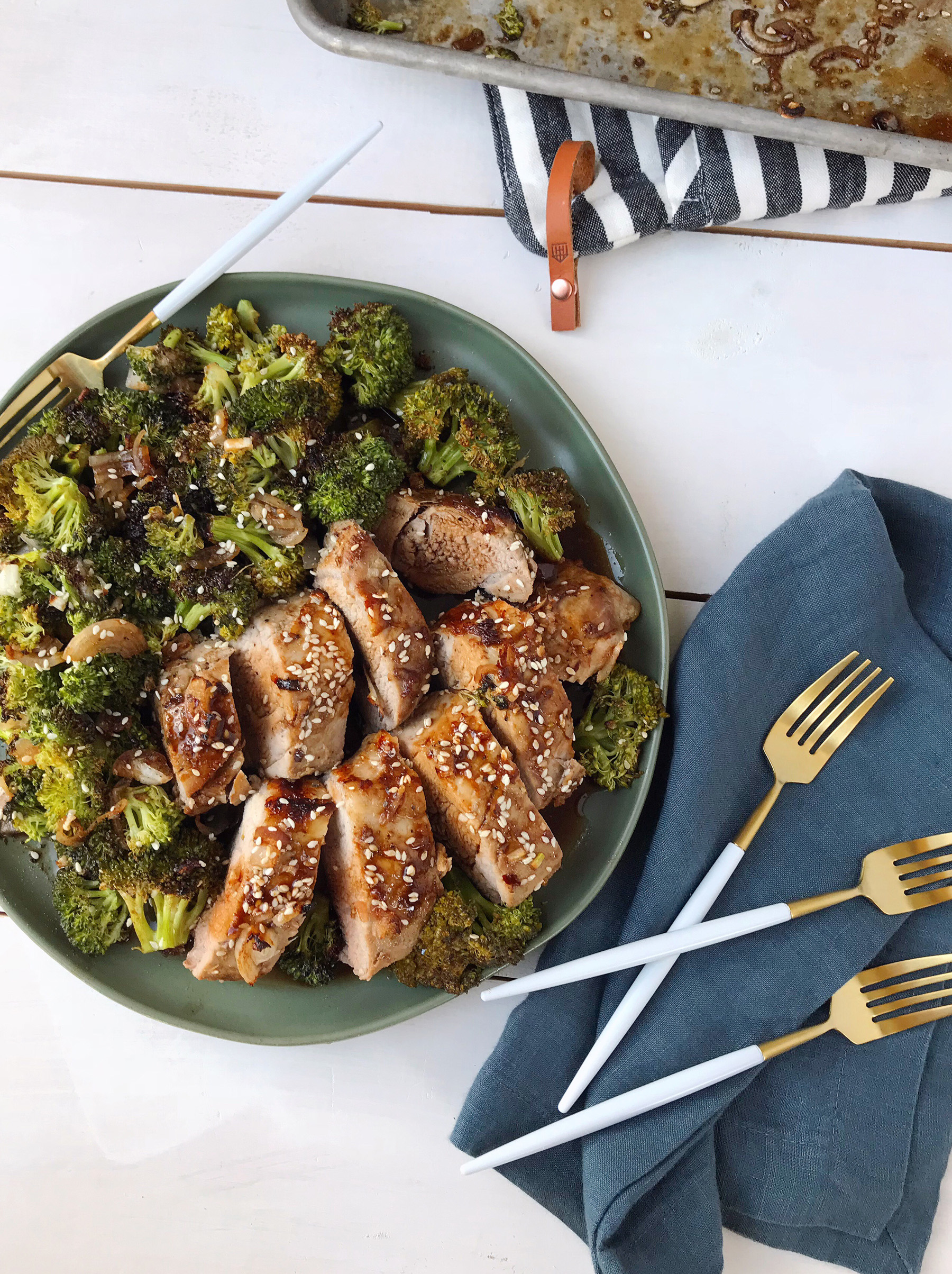 - One the pork is fully cooked, pull the pan out of the oven and disperse the sesame seeds over the tenderloin and broccoli. Return to the oven and broil for 1 minute.