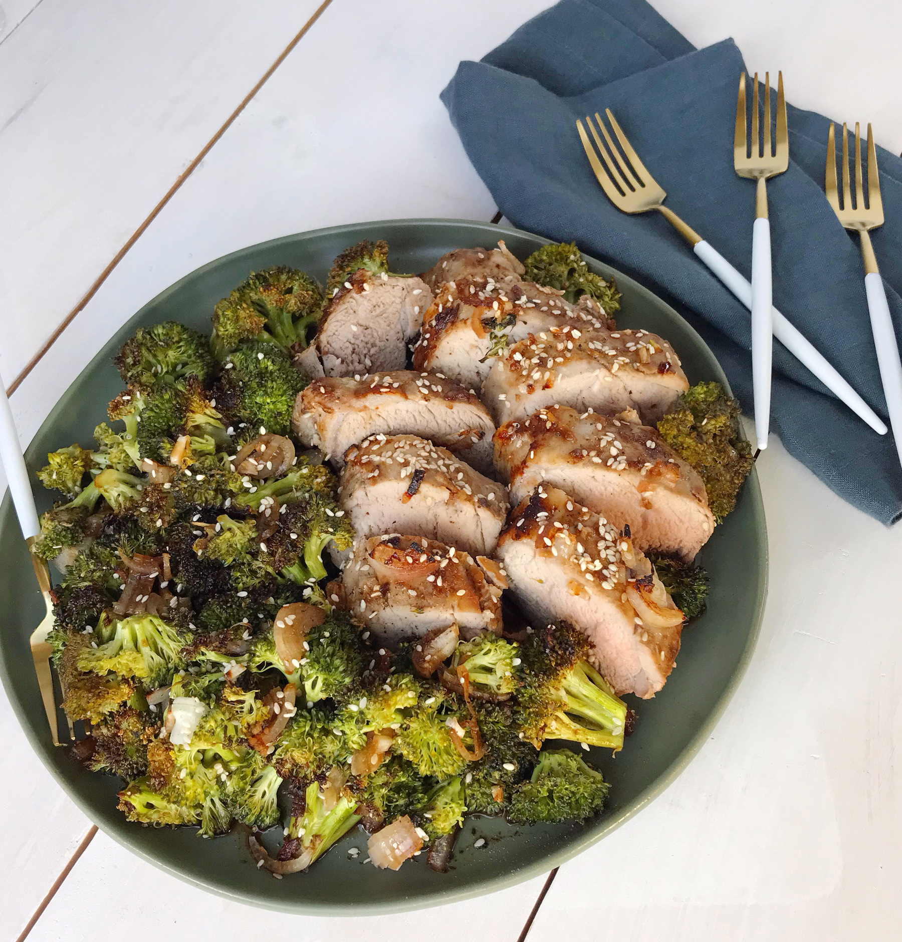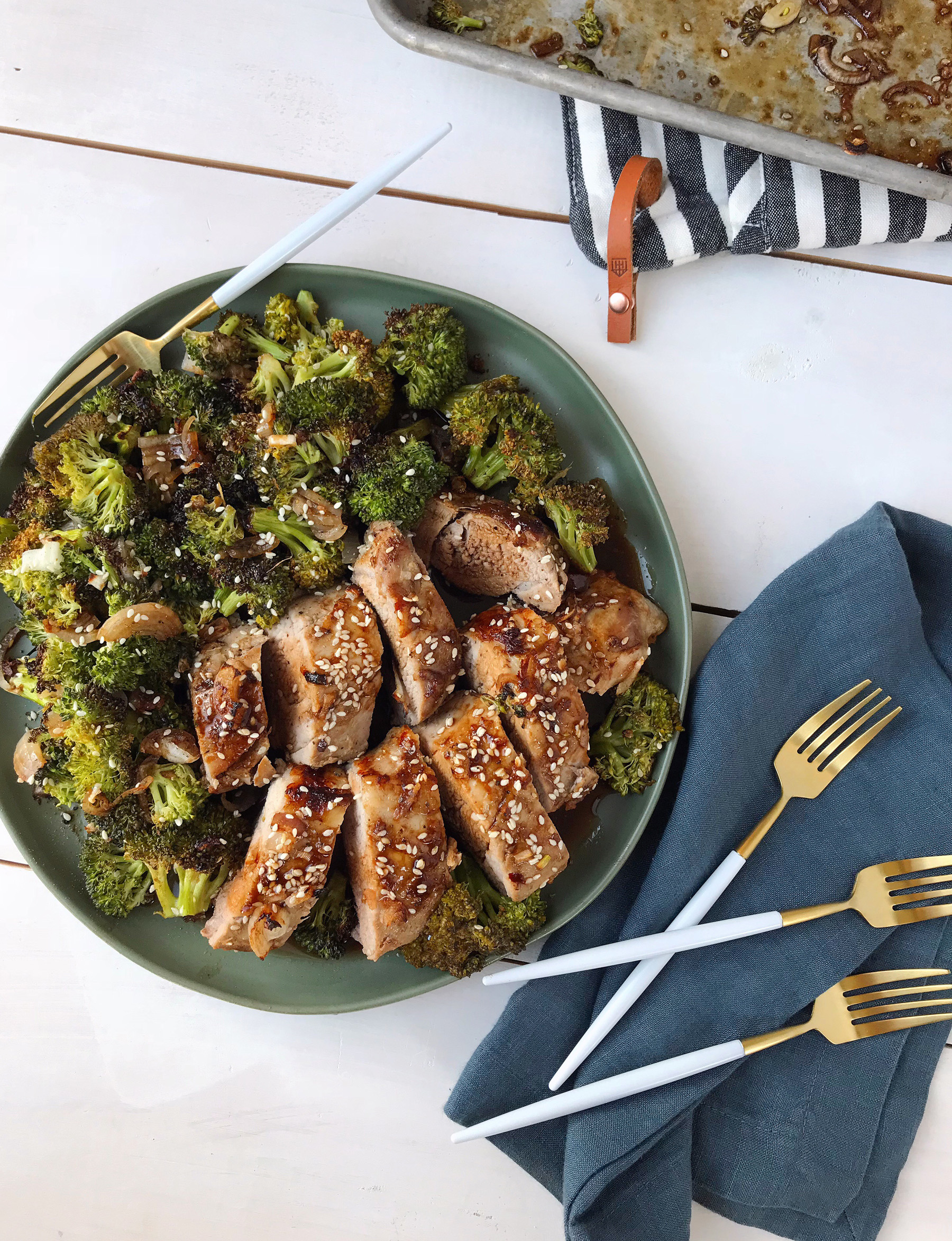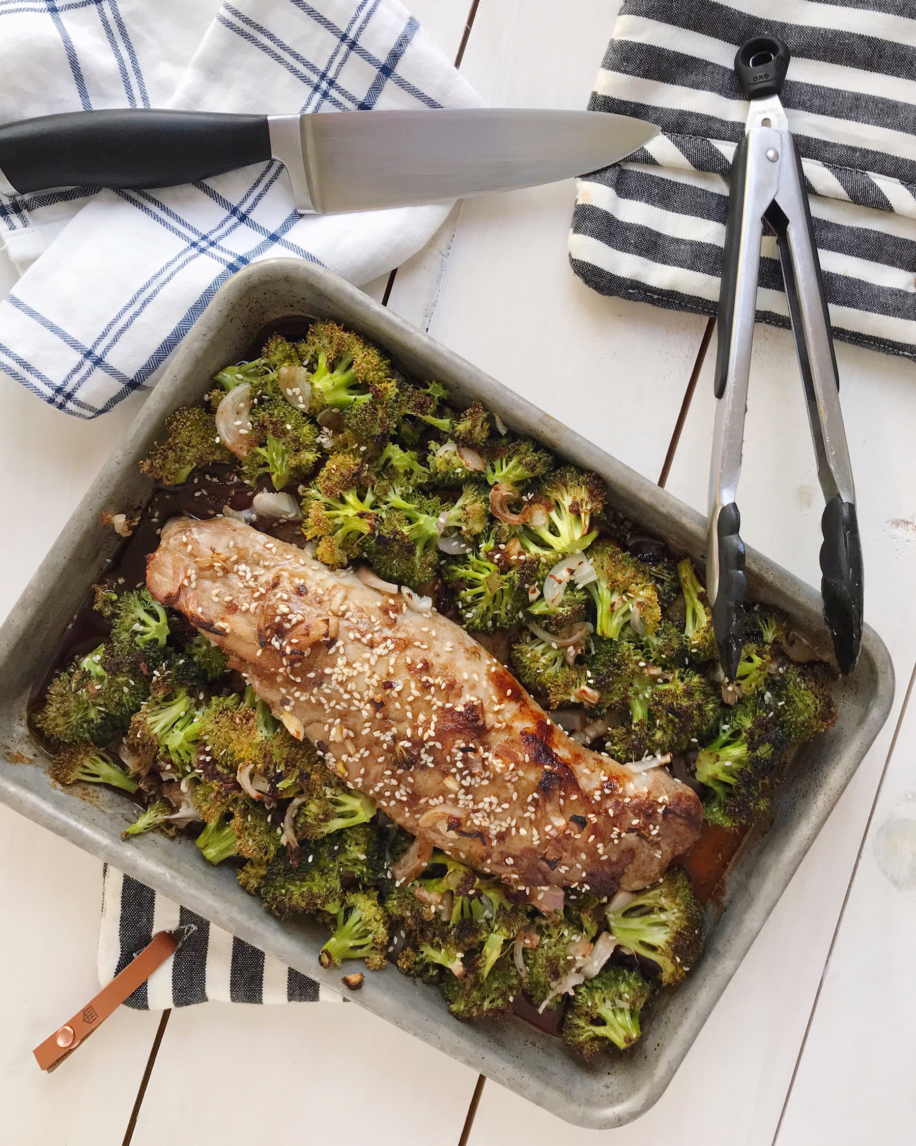 Roasted pork tenderloin is one of our go-to weeknight dinners because it’s pretty quick and easy to prepare, and usually gives us some delicious leftovers for lunch the next day. So I challenged myself to give this weeknight meal mainstay a new spin, with a healthy veggie side to complete the meal. I marinated the pork in soy sauce, sesame oil, and lots of fresh ginger in garlic to give it flavor. Then after cooking the pork halfway through, I added on some broccoli and shallots in the same dressing for the final cooking time. I love how it came out, and I also love that it was all contained to one pan. Doing less dishes always makes the meal a bit more delicious in my opinion! Get the full recipe below:
