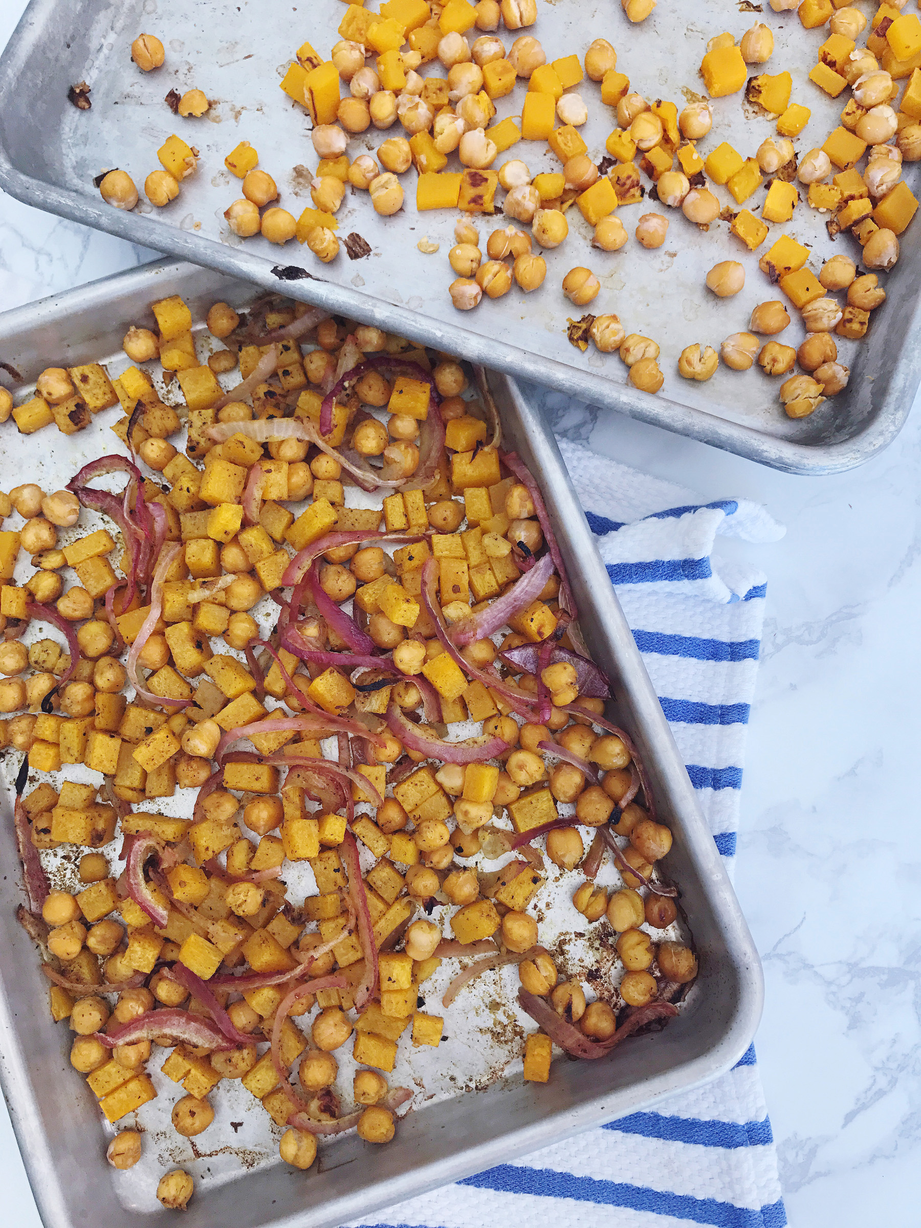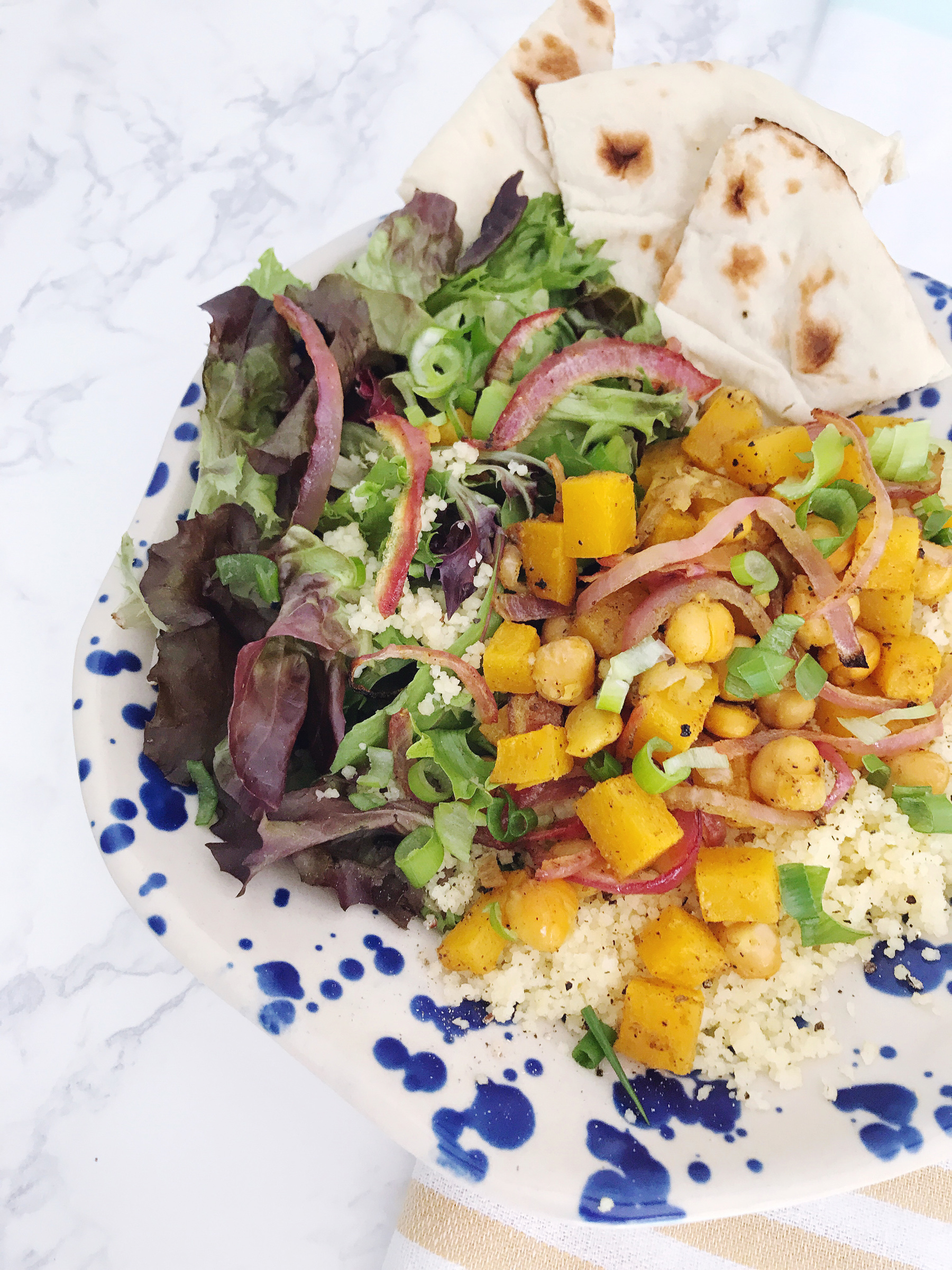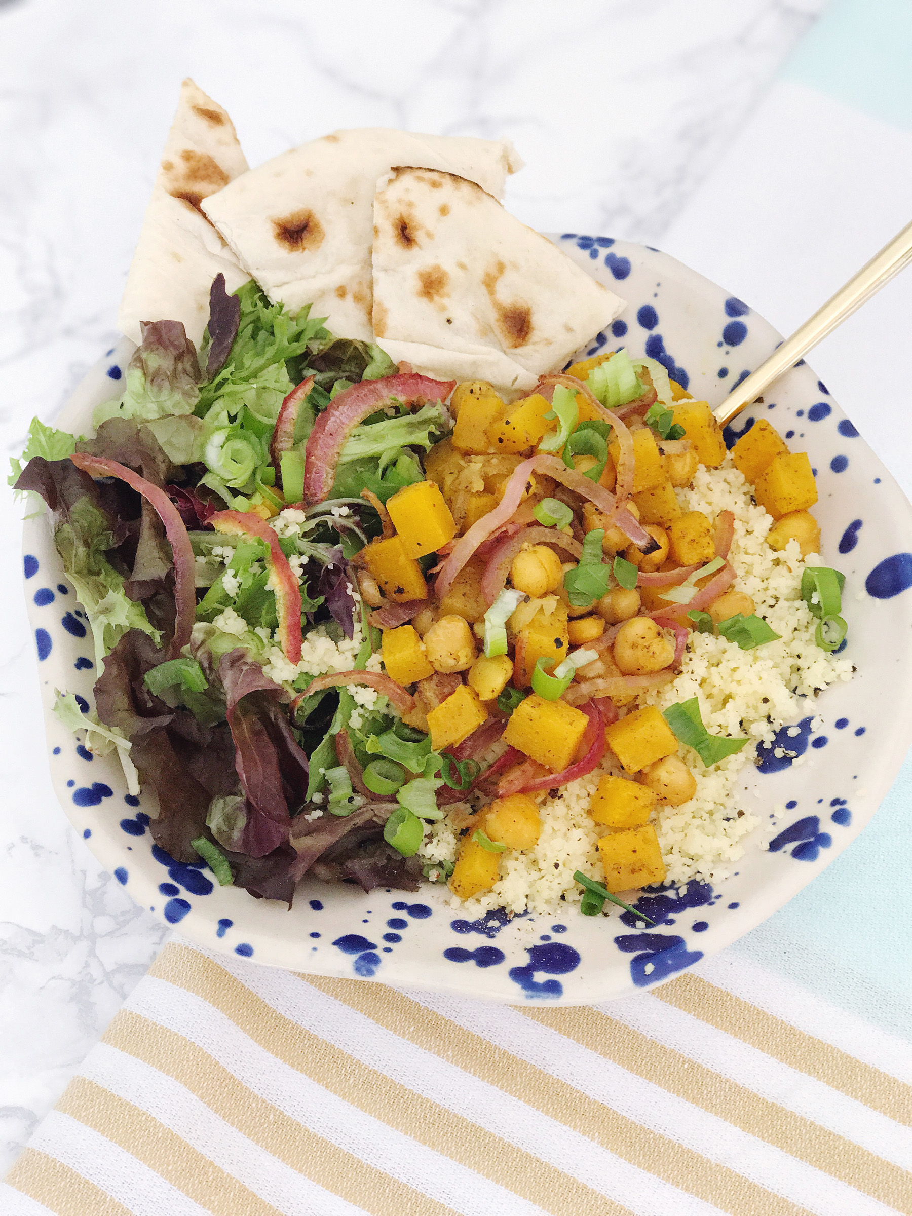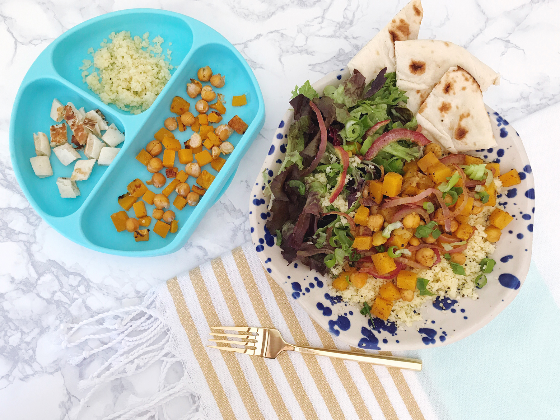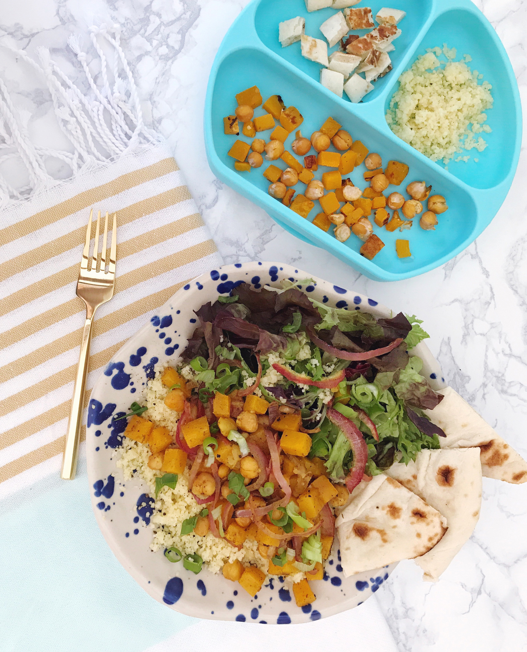 Life with a baby can be hectic at best, but lunch with a baby may be one of the most hectic parts of the day! I realized recently that during our busy schedule, juggling work and naptimes and errands, I’ve been skipping lunches lately (or worse, choosing terribly unhealthy options on-the-go). My friends at Peapod asked me to come with some easy lunch recipes that both mom and baby can enjoy, and it felt like the perfect time to try something new for our lunch routine!I love the popularity of grain and salad bowls that have popped up on lunch menus everywhere recently, and decided to take that concept and highlight some ingredients that I love and that work for my toothless-7-month-old-foodie! I started by roasting some butternut squash, chickpeas, and red onion in flavorful spices and with some lemon juice and olive oil, reserving a bit of the squash and chickpea mixture without the spices or onions for a kid-friendly snack.After all of the veggies were roasted and full of flavor, I tossed mine with a bit of couscous for a grain in the bowl, mixed greens for some colorful crunch, and drizzled the whole thing with a bit more olive oil and lemon juice. It was simple, fresh, and really versatile. You can serve it hot or cold, with a bit of naan on the side for scooping up the couscous and veggies, and even mix in other toppings like marinated olives or some fresh scallions.For Jane’s kid-friendly portion, I served up the cooled chickpeas and butternut squash bite-sized pieces, a scoop of the couscous, and bits of a piece of naan (which is her favorite!). She gobbled up the whole thing, plucking out the sweet bits of squash and mashing the soft, flavorful chickpeas. She also loved the texture of her couscous (warning: you may need to vacuum after kids get into the couscous!). The best part? It was a healthy meal that we could both enjoy! Get the full recipe below: