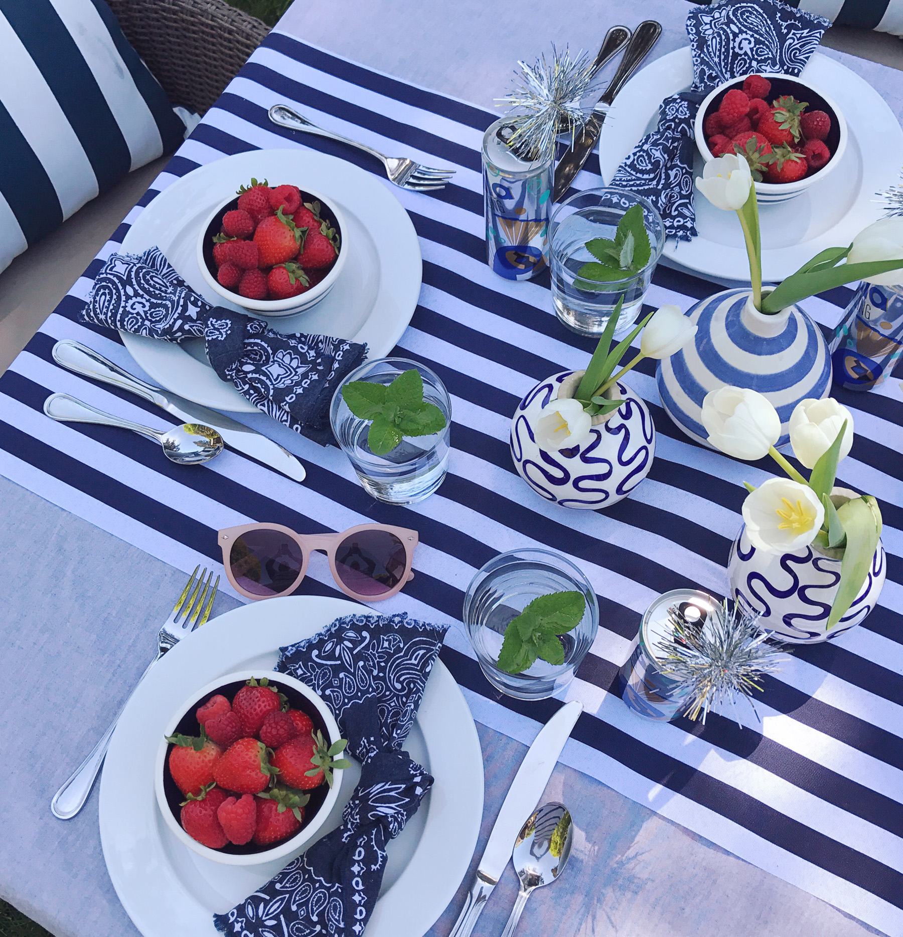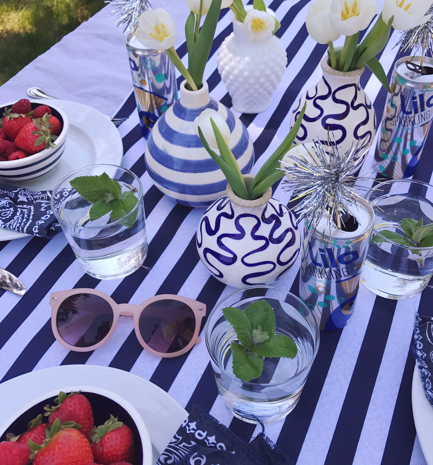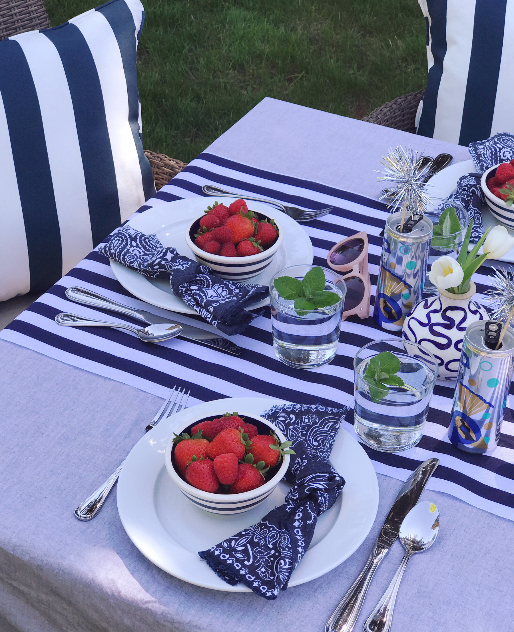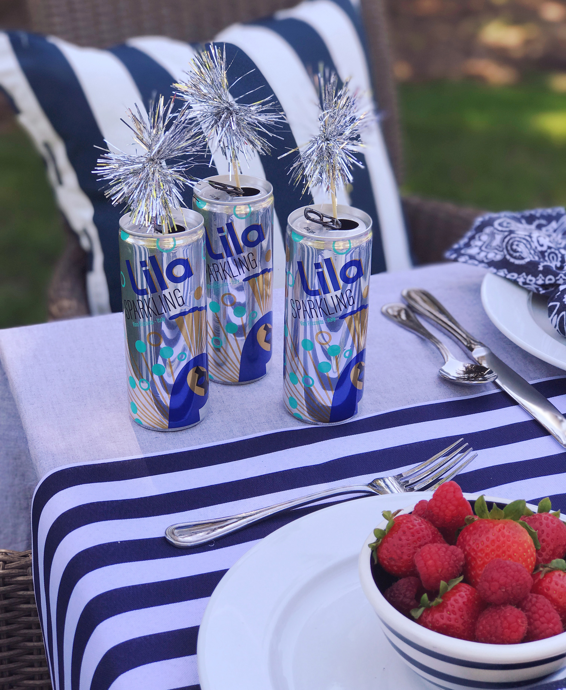 The temperature hit 80 degrees yesterday and I’m now summer-crazed. It might be that we were a bit cooped up this winter with a newborn? Or maybe it’s the fact that I’m working for myself this year and know I’ll have a bit more flexibility to spend time outside. Whatever it is, I’m so excited for summer. Last night Mike and I were sitting on the couch talking about how we want to host a big clambake this summer. We also pulled all of our outdoor furniture out of the shed and got our yard set up for dining al fresco. Jane even had a little quality time playing on a blanket in the grass. Summer is the best. I have a few favorite tricks I lean on for setting up an easy, casual summer party, and as we gear up for Memorial Day weekend, I thought it would be the perfect time to share a few of them!No Fuss tablecloths. I’m a big believer that nothing you use for entertaining should be precious. If you’re worried about spills or things breaking, then there’s really no point in using it all. For table linens, simple in my opinion is always better. My secret weapon for outdoor tablecloths: yardage of inexpensive chambray fabric. You can buy this at the fabric store for just a few dollars a yard, it looks great for red white and blue-themed occasions, and you won’t even blink if it gets covered in ketchup and mustard. I added a table runner to this set-up, and it’s actually a piece of super-wide ribbon from my craft store.“Firework” drink stirrers. Save that tinsel from Christmas for Memorial Day and the Fourth of July to make “firework” drink stirrers. Just a snip of tinsel and a touch of got glue on the end of a skewer and you’ve got the easiest DIY drink stirrers for your tablescape. I popped these inside cans of Lila sparkling wines, keeping with the sparkler theme! These are great for summer entertaining, we toss them in our cooler to bring to the beach, and love that they’re glass-free for outdoor entertaining. Plus an ice cold can of sparkling wine really hits the spot when the temperatures rise! Bandana napkins. Cloth napkins can be a bit formal for barbeques, so I have a huge pile of bandanas I’ve cut into napkins and use for summer entertaining. I made a whole video about ways to use them last summer in fact! They’re inexpensive, easy to toss in the wash and clean, and they come in so many colors to match your tablescape. These vintage-looking navy ones are my favorite for a patriotic looking color-scheme.Bud Vases. Clean and simple is the name of the game for outdoor entertaining. Instead of a large formal arrangement, I like to use a handful of bud vases on the table. One bunch of $5 tulips from Trader Joes and 4-5 bud vases makes for a perfect grouping. A variety of glass jars is a good alternative if you don’t have a giant collection of bud vases like me (#hoarder).Bowls of Berries. Summer berries are the best color and a few bowls of them on the table do double duty as décor and a bright, fresh snack while guests are waiting for their meal. Pop one on each plate when you’re setting the table, and add a place card on a toothpick inside the bowl of berries for assigned seating!I’ve got a million more ideas, but these are a few of my tried and true tricks. I can’t wait to put them to use with this warm weather! What’s on your schedule for Memorial Day weekend celebrations? Share them with me in the comments!