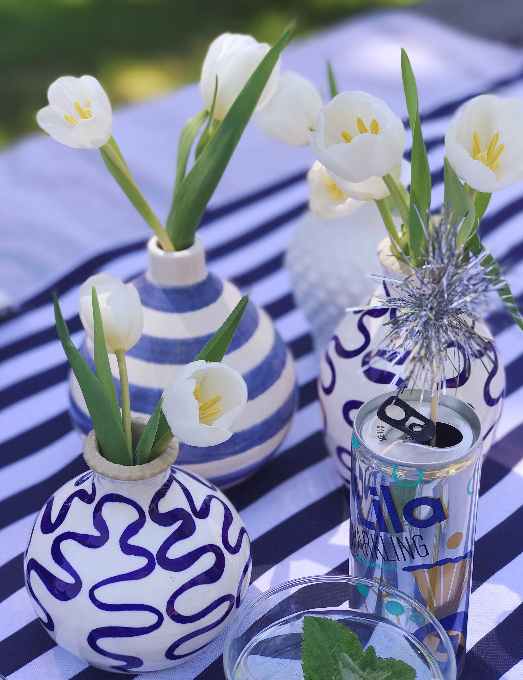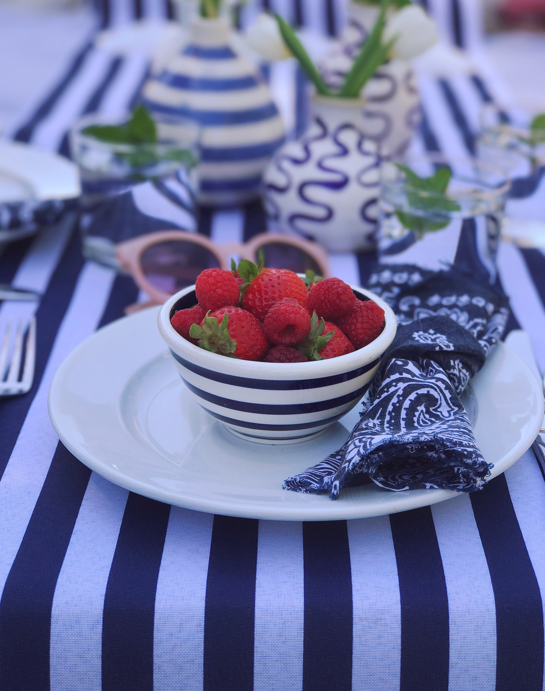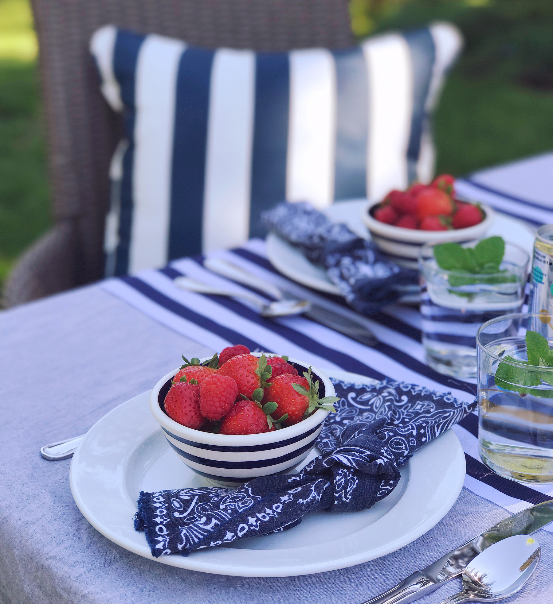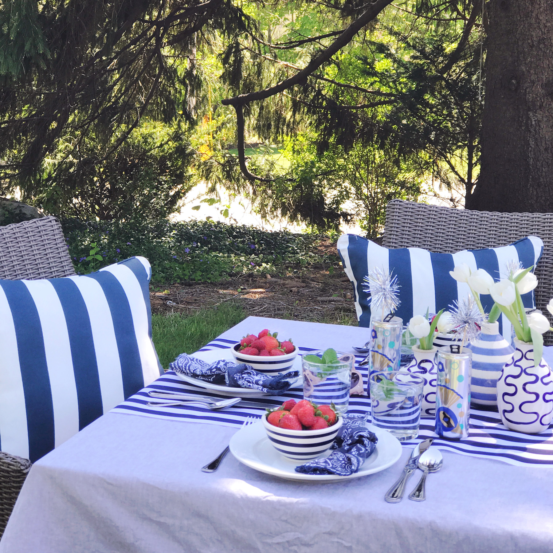 The temperature hit 80 degrees yesterday and I’m now summer-crazed. It might be that we were a bit cooped up this winter with a newborn? Or maybe it’s the fact that I’m working for myself this year and know I’ll have a bit more flexibility to spend time outside. Whatever it is, I’m so excited for summer. Last night Mike and I were sitting on the couch talking about how we want to host a big clambake this summer. We also pulled all of our outdoor furniture out of the shed and got our yard set up for dining al fresco. Jane even had a little quality time playing on a blanket in the grass. Summer is the best. I have a few favorite tricks I lean on for setting up an easy, casual summer party, and as we gear up for Memorial Day weekend, I thought it would be the perfect time to share a few of them!No Fuss tablecloths. I’m a big believer that nothing you use for entertaining should be precious. If you’re worried about spills or things breaking, then there’s really no point in using it all. For table linens, simple in my opinion is always better. My secret weapon for outdoor tablecloths: yardage of inexpensive chambray fabric. You can buy this at the fabric store for just a few dollars a yard, it looks great for red white and blue-themed occasions, and you won’t even blink if it gets covered in ketchup and mustard. I added a table runner to this set-up, and it’s actually a piece of super-wide ribbon from my craft store.“Firework” drink stirrers. Save that tinsel from Christmas for Memorial Day and the Fourth of July to make “firework” drink stirrers. Just a snip of tinsel and a touch of got glue on the end of a skewer and you’ve got the easiest DIY drink stirrers for your tablescape. I popped these inside cans of Lila sparkling wines, keeping with the sparkler theme! These are great for summer entertaining, we toss them in our cooler to bring to the beach, and love that they’re glass-free for outdoor entertaining. Plus an ice cold can of sparkling wine really hits the spot when the temperatures rise! Bandana napkins. Cloth napkins can be a bit formal for barbeques, so I have a huge pile of bandanas I’ve cut into napkins and use for summer entertaining. I made a whole video about ways to use them last summer in fact! They’re inexpensive, easy to toss in the wash and clean, and they come in so many colors to match your tablescape. These vintage-looking navy ones are my favorite for a patriotic looking color-scheme.Bud Vases. Clean and simple is the name of the game for outdoor entertaining. Instead of a large formal arrangement, I like to use a handful of bud vases on the table. One bunch of $5 tulips from Trader Joes and 4-5 bud vases makes for a perfect grouping. A variety of glass jars is a good alternative if you don’t have a giant collection of bud vases like me (#hoarder).Bowls of Berries. Summer berries are the best color and a few bowls of them on the table do double duty as décor and a bright, fresh snack while guests are waiting for their meal. Pop one on each plate when you’re setting the table, and add a place card on a toothpick inside the bowl of berries for assigned seating!I’ve got a million more ideas, but these are a few of my tried and true tricks. I can’t wait to put them to use with this warm weather! What’s on your schedule for Memorial Day weekend celebrations? Share them with me in the comments!