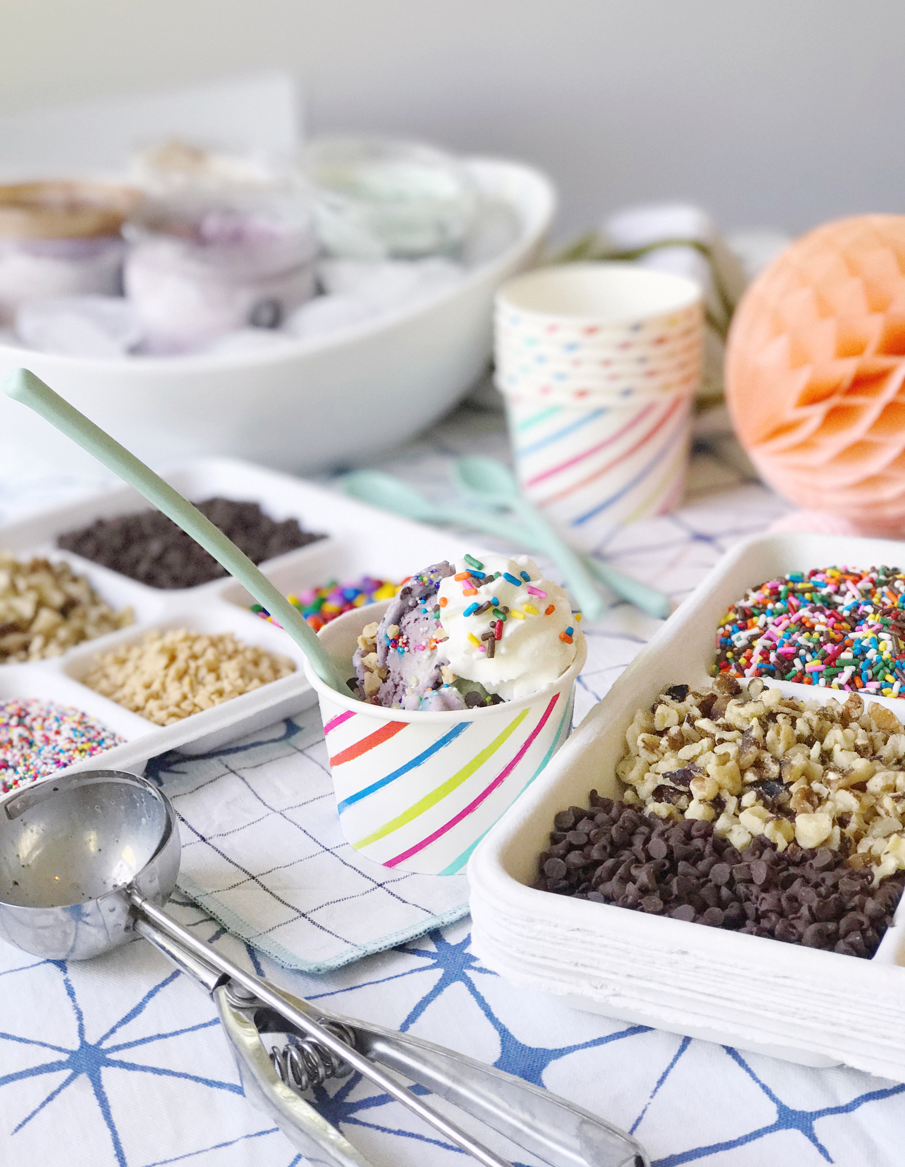 I think just last week I was crossing my fingers and toes that summer weather would arrive, and then just like that 90-degree temperatures rolled in and I’m already complaining about the heat. Funny how that happens, right? I did find a few fun ways to cool off from the heat wave while recently visiting family though. We dipped our toes in my cousin’s pool, enjoyed some evening time on my parent’s new farmhouse porch, and decided to host a little ice cream sundae party over the weekend. Setting up an ice cream sundae bar has to be the easiest – and impressive – dessert option when you’re entertaining. I thought I’d share a few tricks for how I set up my own ice cream sundae bar when I host, just in case you get the craving for one this summer too!Start with the Ice Cream, of course! We eat with our eyes first, so I always look for a variety of the prettiest ice cream colors. A black raspberry has that rich purple tone, and a tasty mint chocolate chip is the perfect cool color. A chocolate variety and vanilla variety are always classics to have on hand too – we went with chocolate fudge brownie and vanilla cookie dough on this particular occasion. Keep it cool. Ice Cream can melt fast on a warm day (duh, you knew that!). So I fill up an oversized serving bowl with a bit of ice, pack in the ice cream containers, and then add more ice around each pint to keep the whole thing cool. You could even do this before a party and store the whole thing in your freezer before guests arrive – just pop the tops off the containers and you’re ready to serve. Display your toppings. It’s not a sundae without tons of tasty toppings! I love to see all of the pretty sprinkles and nuts and candies displayed for a big visual impact on the dessert table. I like to alternate the more colorful toppings in a divided tray with more natural colored options, or use a variety of tiny bowls (luckily I have quite the collection). It’s also a great way to get kids involved – they can help sort out the snacks and create their own sundae creations. Lay out your tools. A really good ice cream scoop, and a small jar of hot water for warming it up and rinsing it out between flavors is a great idea to have on hand. Some festive ice cream bowls and sundae spoons will finish off your display. And don’t forget to set out some whipped cream and warm salted caramel sauce for the ultimate ice cream creations All that’s left to do is get scooping and enjoy! What’s your go-to sundae combination? I’m always in it for the whipped cream and rainbow sprinkles.