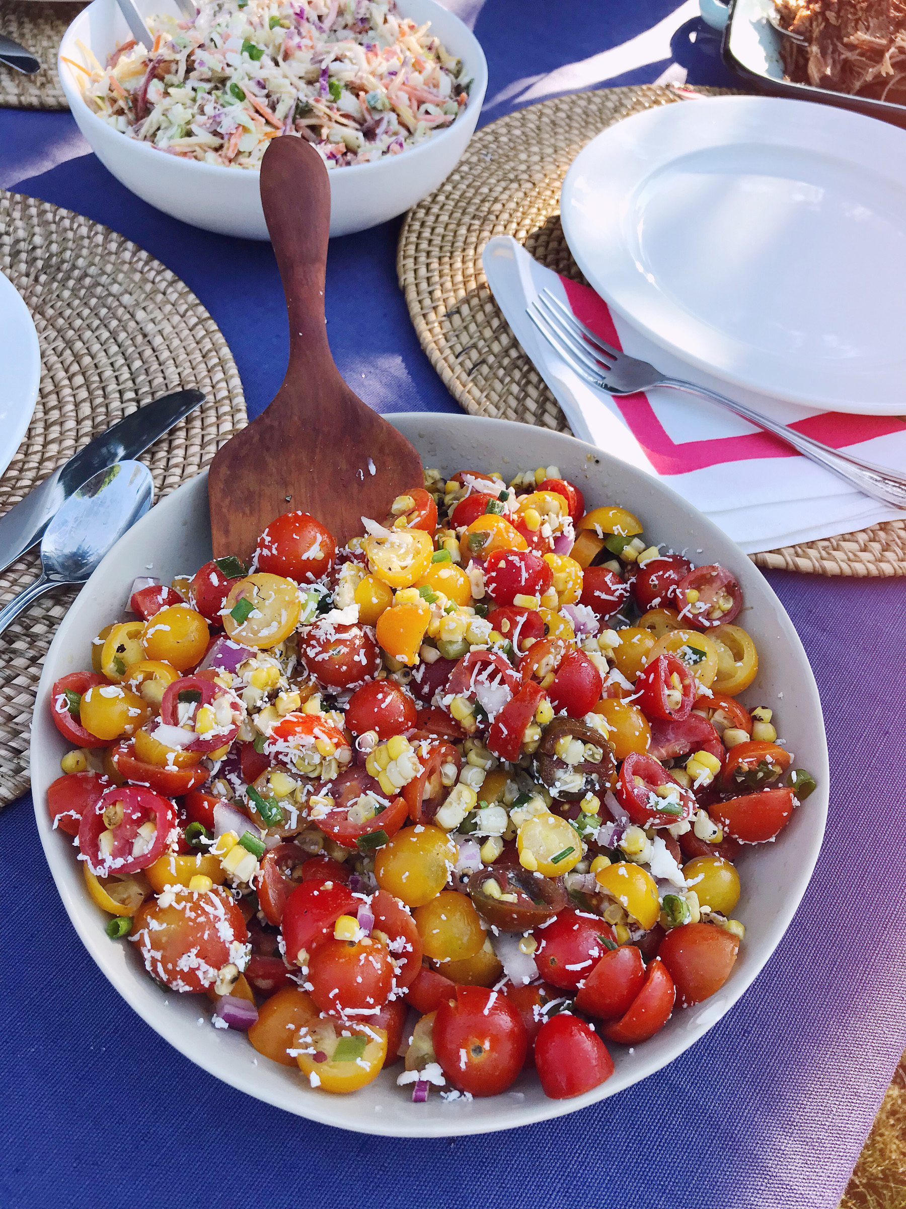 I have been working on perfecting this summery side dish the past few weeks as I’ve made it for holiday BBQs, bridal showers, and a weeknight dinner. Each time it got a little bit better, and gobbled up in a near instant as it hit the table. It’s a simple mixture of ingredients that just happen to taste delicious during the peak of summer — bright mixed tomatoes, sweet grilled corn, and flavorful fresh herbs. My favorite part about this dish is that it tastes better the next day after all of the ingredients have marinated together overnight, so it’s easy to make ahead when you’re entertaining! The leftovers (if you have any!) are equally delicious — I tossed them over a bit of warm pasta for lunch the next day — YUM. Get the recipe below: