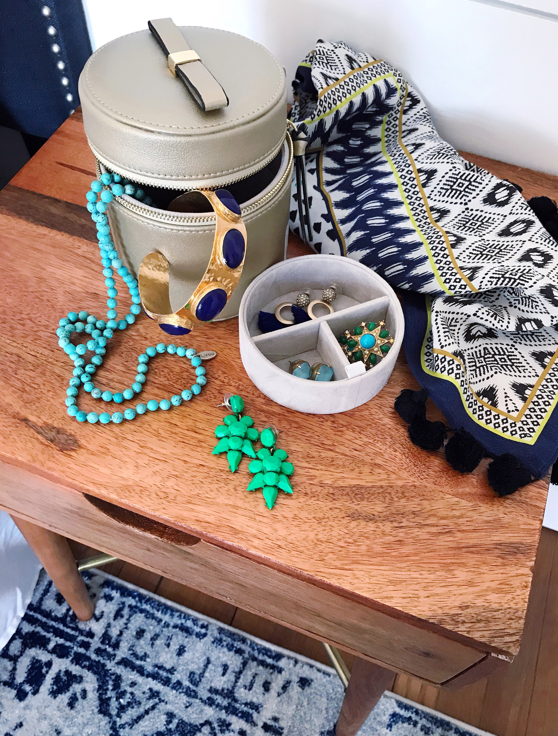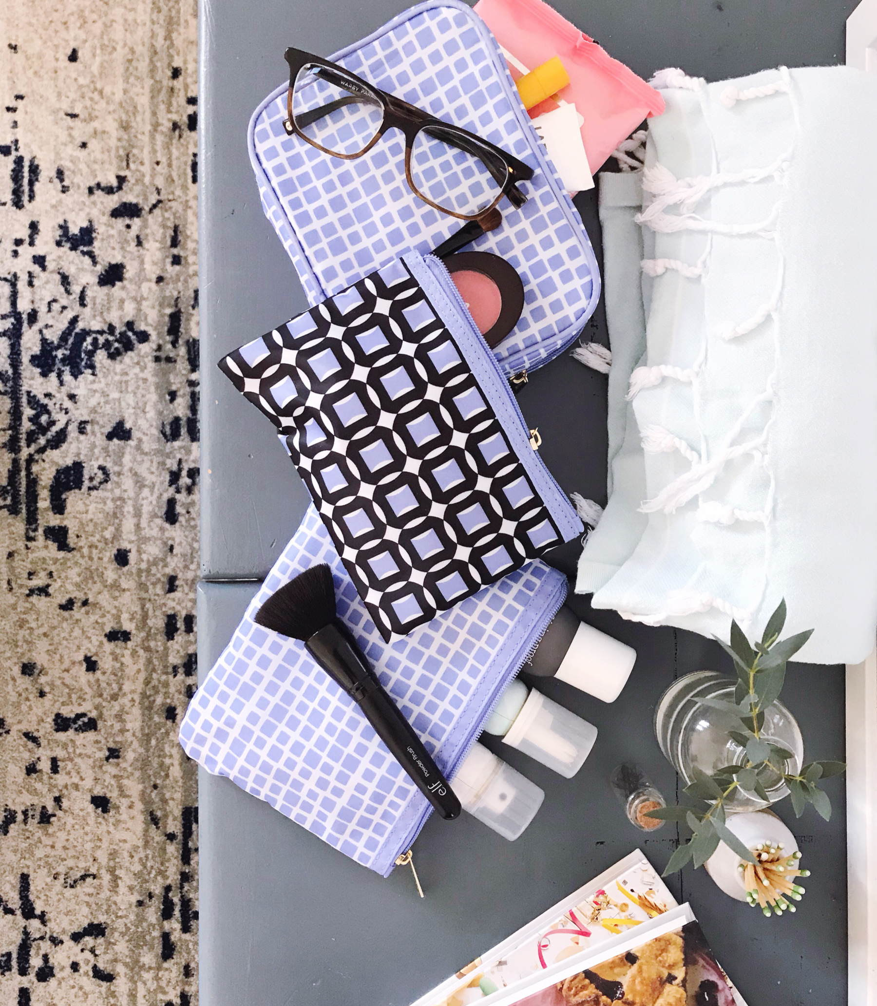 I always start with clothing first, since that makes up the bulk of the packing list on most trips. I recently broke the zipper on my old suitcase and decided it was time to upgrade to some new luggage that didn’t make me crazy every time we traveled. Marshalls is my go-to spot for brand name, high-quality travel items, and I found a really pretty hard-sided rolling suitcase with lux-looking leather details and divided interior compartments. I’m kicking myself for not upgrading earlier, it was such a great value at $79.99 (compared at $129.99) I also found a set of packing cubes when I was in the store, and have heard so many people talk about how great they are for keeping your suitcase organized while you travel so I grabbed a set to try out! Sometimes my husband and I will share a suitcase if we’re just going away for a weekend, so I love how they enable me to divide up the suitcase with each of our clothes.Next come accessories, which I try to keep lean when I’m traveling. I stick to a cohesive color palette so I can mix and match pieces together, and try to pre-plan which pieces will go with which outfits. I tuck them all into a small travel jewelry box, which makes it easy to find in my luggage. I found a small gold leather jewelry box with a pretty little bow on top at Marshalls, and love that the interior tray comes out so I can keep these pieces organized on my nightstand in hotels.I love to streamline all of the make-up and toiletries I’m packing, and divide them into individual zippered pouches. I put one together with my make-up basics, one with stuff for my hair, and the last one with toiletries like toothpaste, face wash, and my contact solution. I found a great set at Marshalls that came with all different sized zippered bags. I love this approach because then if I need to pull my make-up bag out at the airport, I’m not digging through tons of stuff. I just grab the bag I need and go!The last thing I tackle when packing is all of the stuff that will go into my tote bag, which I carry on to a plane or bring in the front seat of the car with me for road trips. Usually this means gathering magazines, my computer, chargers, and my camera. An organized bag is so necessary for me to keep my vacation-mode zen! I found a beautiful leather envelope at Marshalls that keeps magazines, my notebook, and laptop organized and upright in my tote (crumbled magazines that slide to the bottom of your bag are the worst!). Then I use a few small zippered pouches to protect my camera and organize my chargers and cords. I also always bring an external back up battery when I travel (I love finding good surprises like these at the check-out aisle at Marshalls), because I end up using my phone so much when I’m snapping pictures and looking up directions when we’re on the go.After that, all that’s left to do is zip up our bags and hit the road! Are you heading anywhere fun for winter travel?