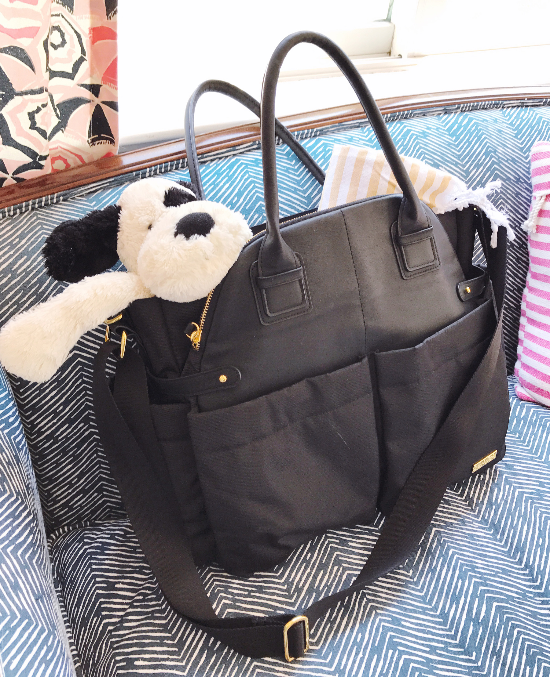 I wrote recently about Jane’s transition to solid foods, and raved about the OXO glass baby food containers. They’re awesome for travel too; in addition to storing her pureed food in them I portion out puff-snacks and formula in the little containers. I also keep a travel baby spoon in a carrying case in our diaper bag for on-the-go eating, and love this SkipHop travel bib. The bib is super cute and it folds up into a teeny-tiny little pouch! Another little tip I’ve used for traveling: filling up a S’well water bottle with warm water so I can make bottles on the go, it keeps the water warm for hours!