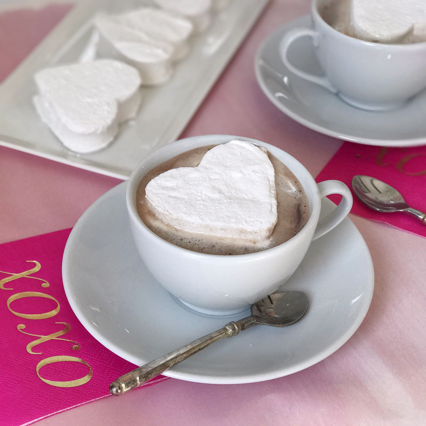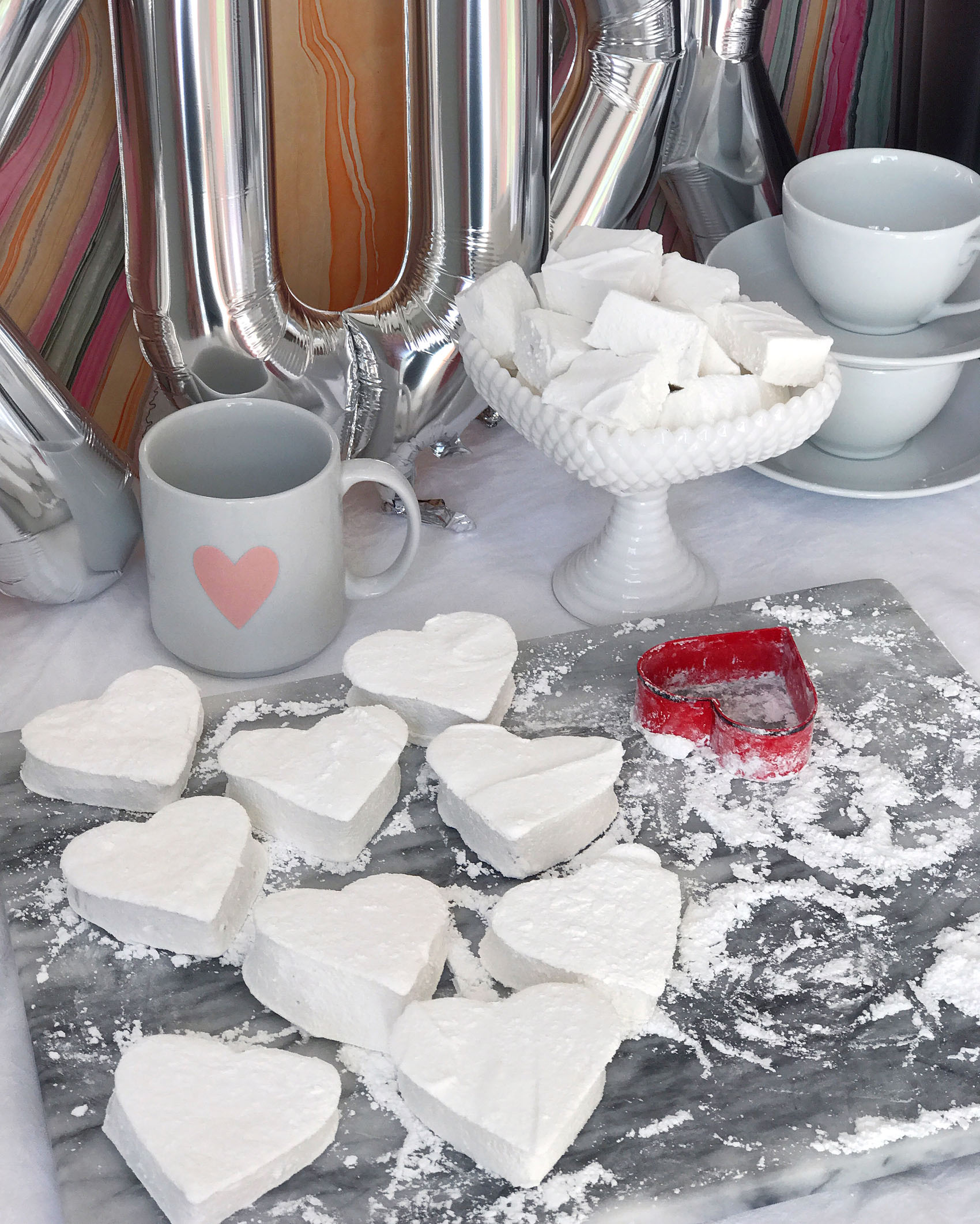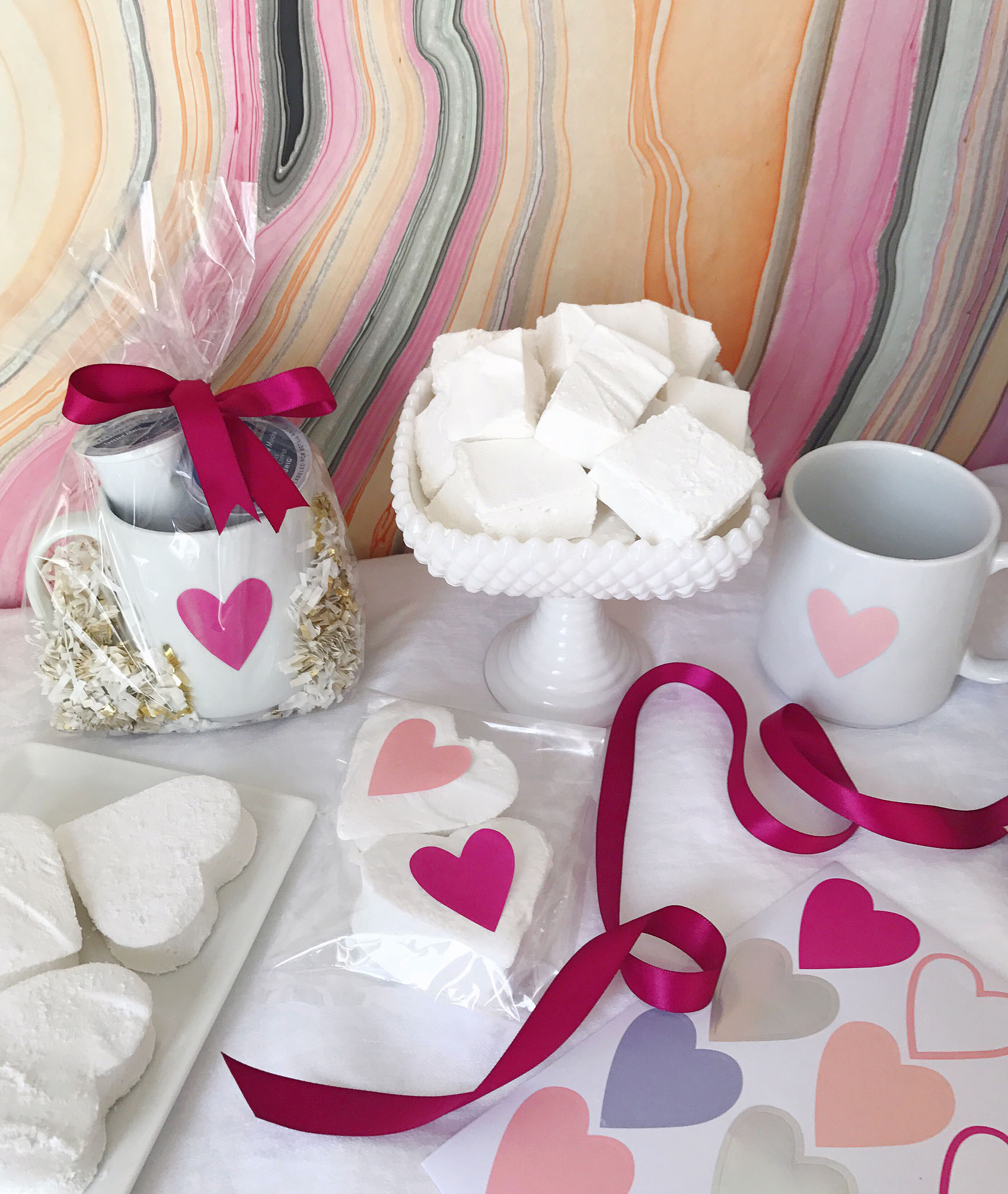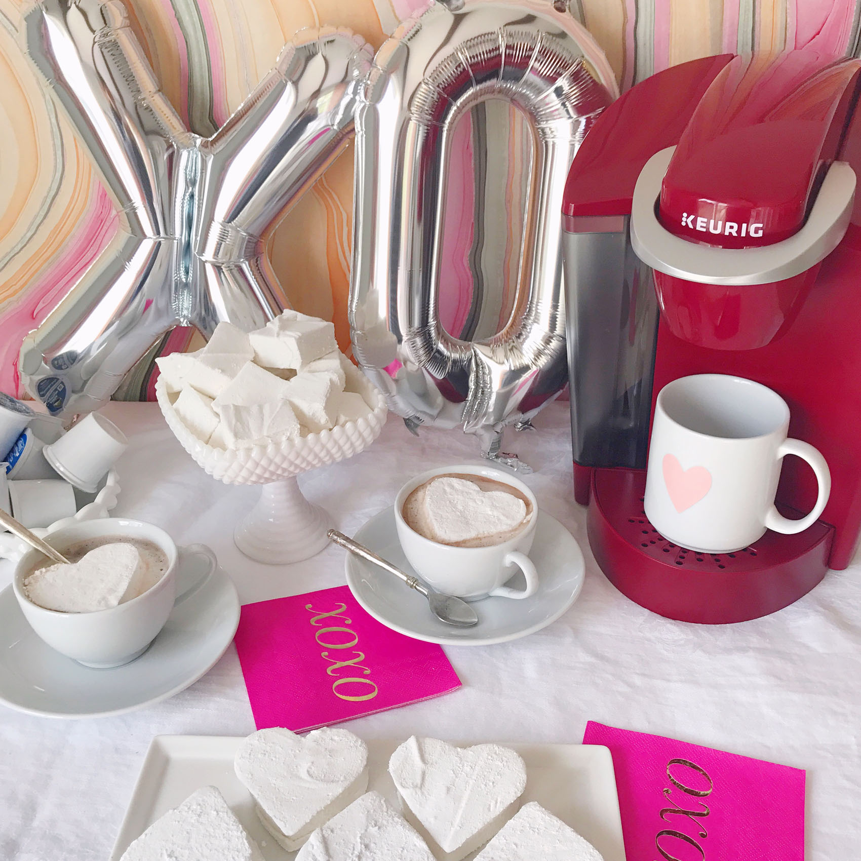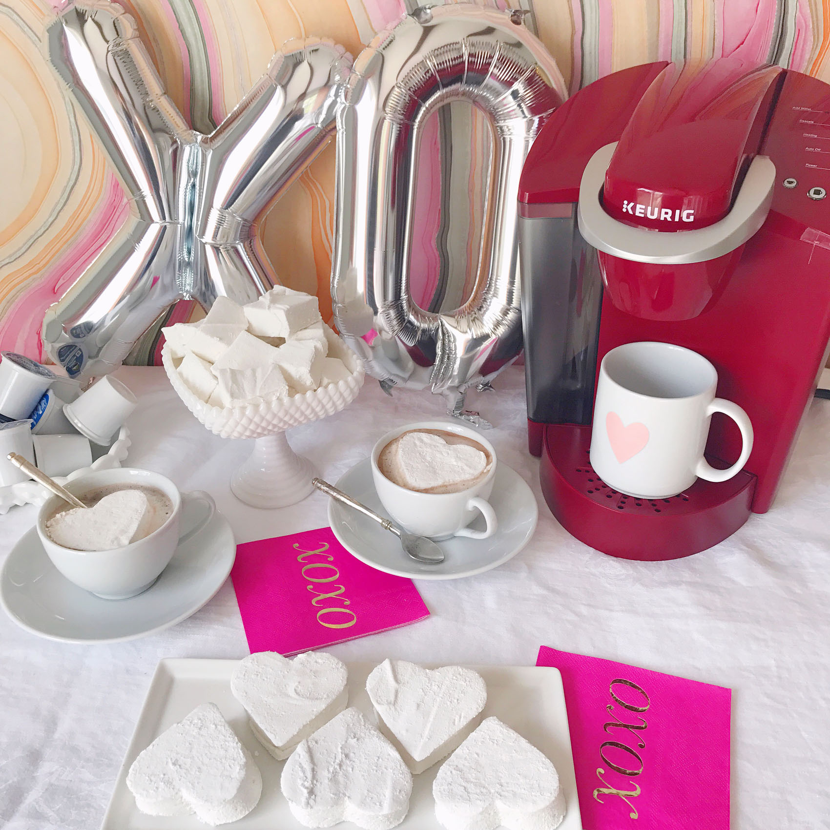 This post was created in partnership with Keurig Green Mountain®; opinions are my own.I’m a firm believer that the best gifts for Valentine’s Day (and in general, actually) come with a little DIY touch that lets the gift recipient know you put extra love and attention into assembling a special treat. Of course a little sweetness helps too, I’m all for indulging the chocolate and candy-fueled side of Valentine’s Day too. So this year I’m tackling some Valentine’s Day gifts that combine the homemade touch with sweet flavors by making homemade marshmallows for friends and family and packaging them up with my favorite Keurig® K-Cup® pods like Green Mountain Coffee® Toasted Marshmallow Mocha Coffee.Making homemade marshmallows seems like a difficult project to tackle, but after doing lots of research online for recipes and methods, I discovered that they’re actually quite simple to make! The process is just two main steps, first is bringing sugar, water and corn syrup up to 240 degrees on the stove. The second step involves mixing the sugary syrup into dissolved gelatin for 15 minutes with a stand mixer. After that, you just have to spread them out in a confectioner’s sugar dusted pan and let them sit overnight. I punched some larger marshmallows out with a heart-shaped cookie cutter for easy shapes, and then used a pair of kitchen shears to cut up marshmallow cubes out of the leftover pieces. Once my marshmallows were complete, I used them in a few ways! First was to set up a Valentine’s Day coffee bar with my new rhubarb-colored Keurig® K55 brewer and some festive heart-adorned coffee mugs. I decorated with a display of the marshmallows in fun containers, a tray of the mocha-inspired K-Cup® pods, and some over-sized XOXO mylar balloons and napkins. I love this chocolaty-inspired coffee bar idea for a Galentine’s Day brunch, or to surprise your love on Valentine’s Day morning. I also used the marshmallows to wrap up homemade gifts inside heart-adorned mugs filled with the same mocha coffee and hot cocoa flavors, and paired them with a few of the oversized heart marshmallows in clear cellophane bags. The mugs make a perfect Valentine’s Day gift; it’s like gifting your loved ones a mini-coffee date!