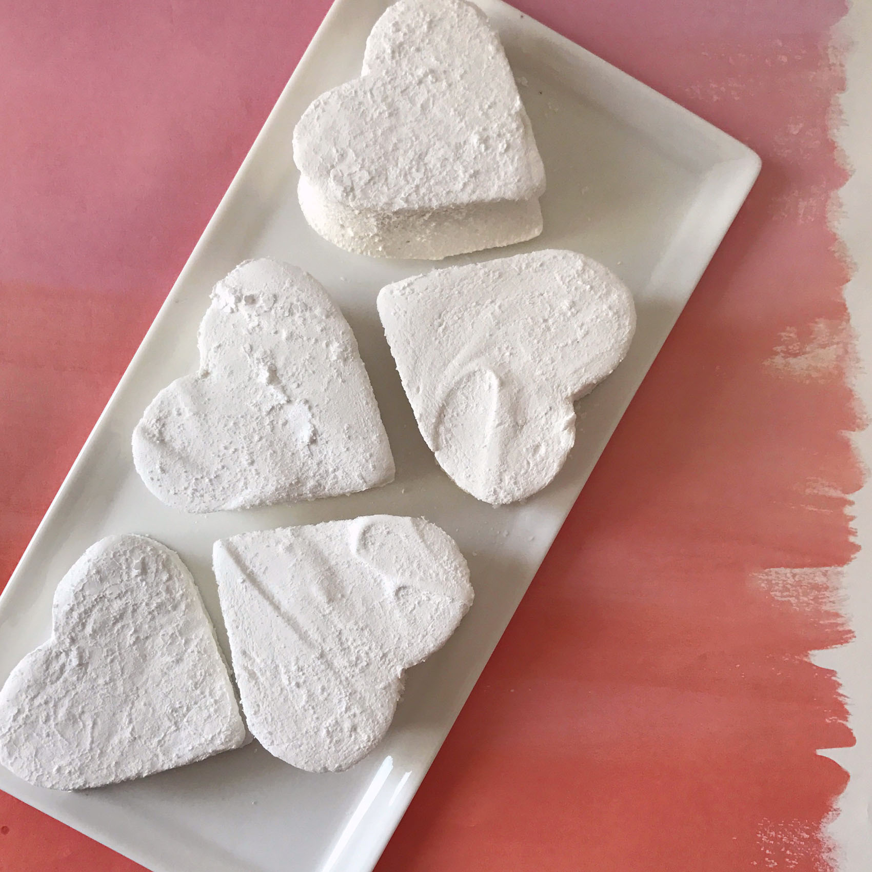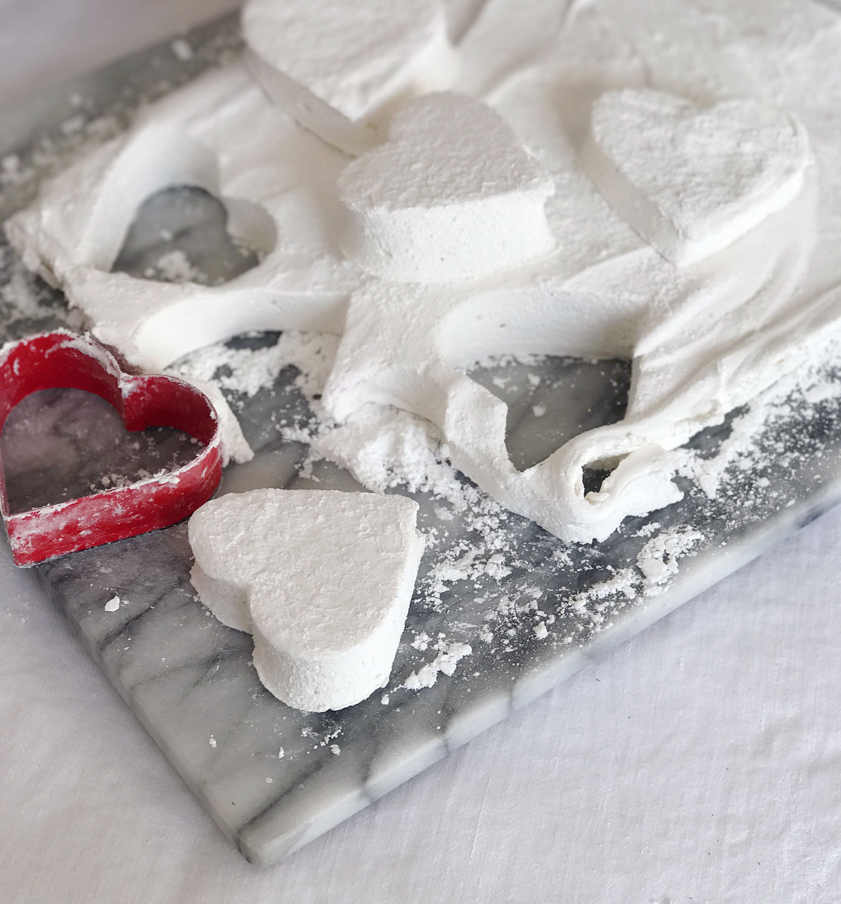 After resting the marshmallows over night, turn them out onto a board and cut them in squares or press with cookie cutters into shapes.