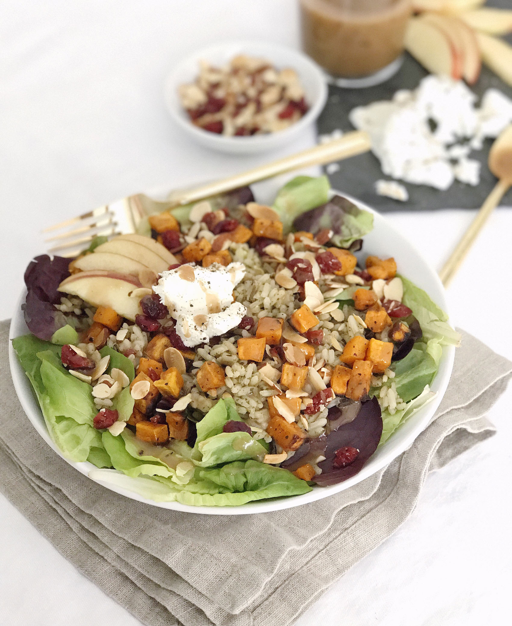 - Top each bowl with a quarter of the wild rice, roasted sweet potatoes, sliced apples, chopped almonds, dried cranberries, and goat cheese.